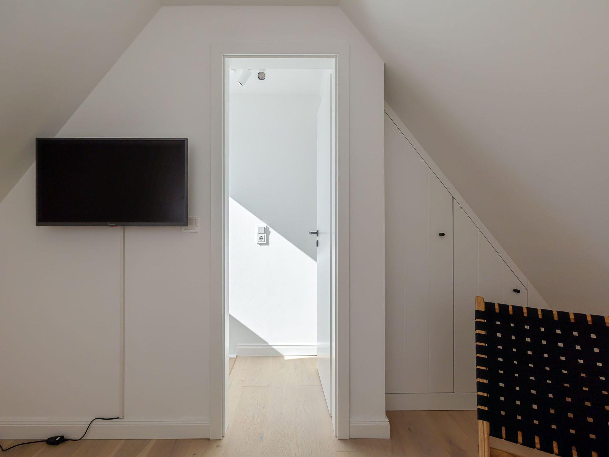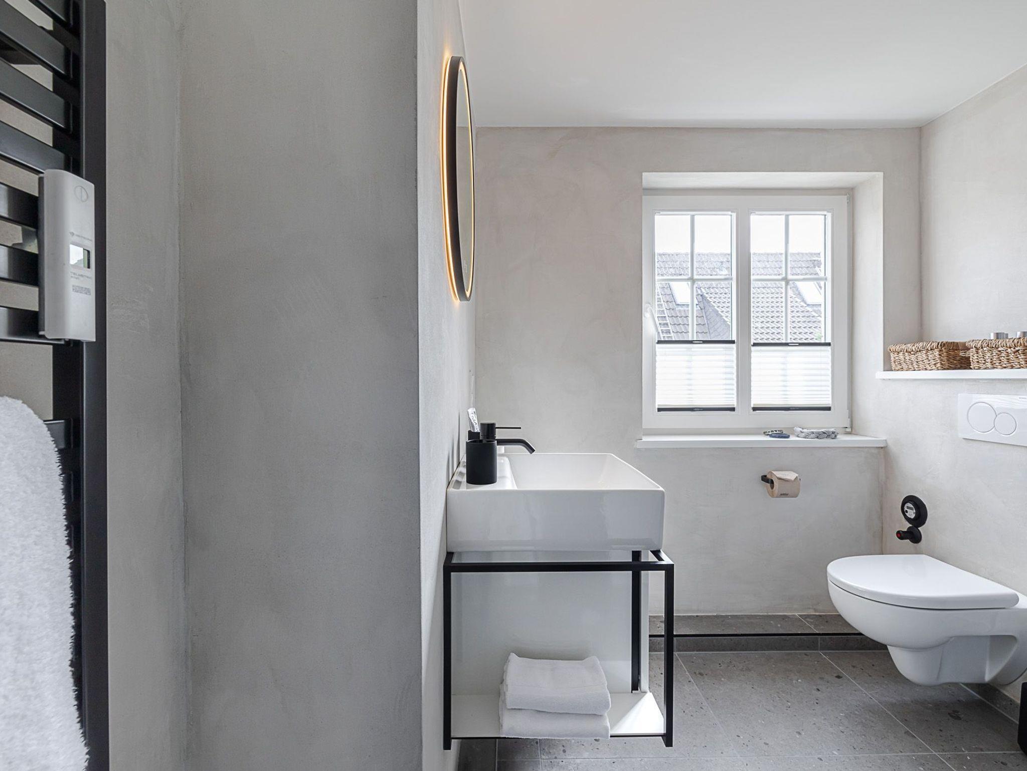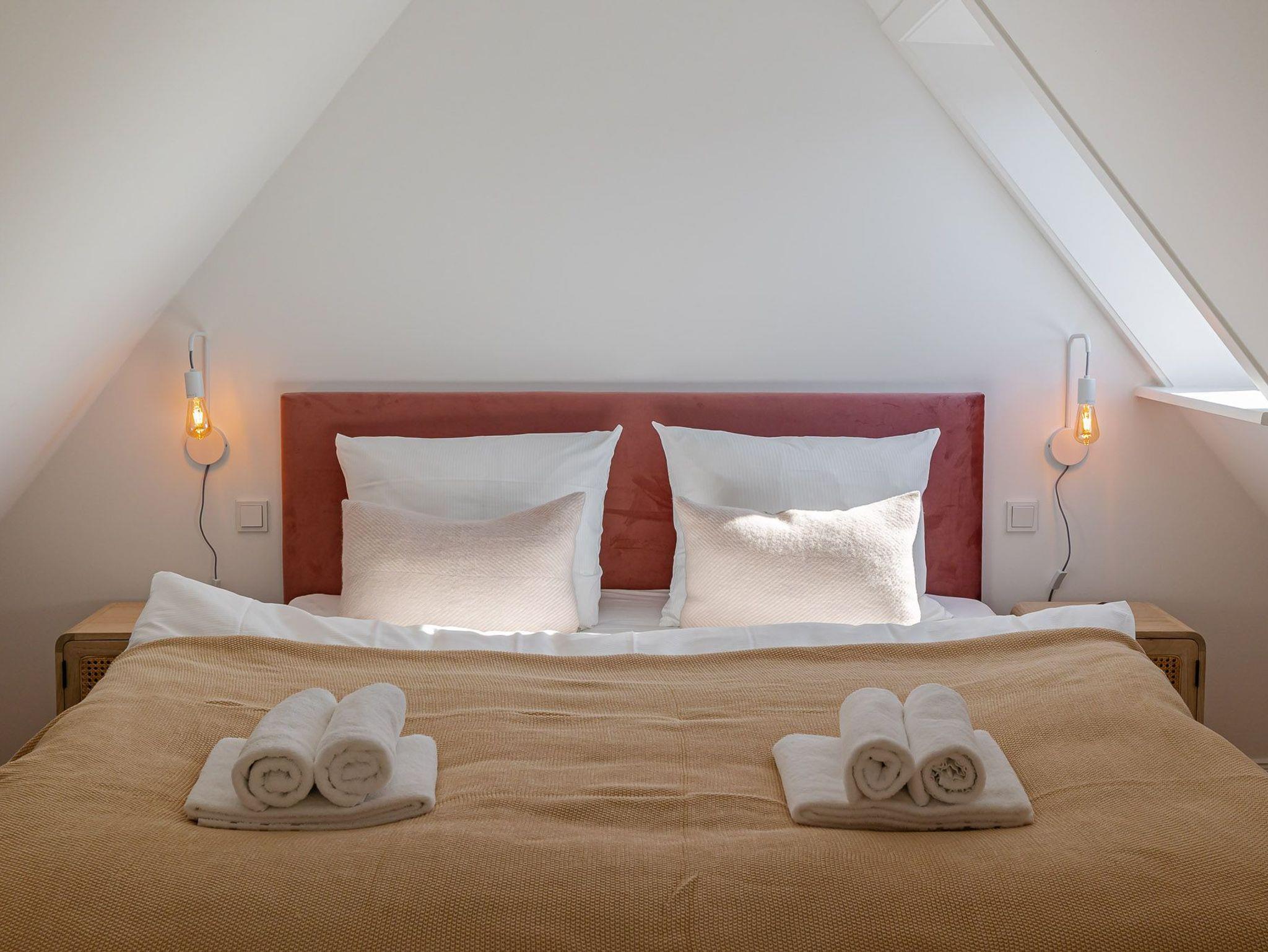 Herrliches Meerblau und beruhigendes Sand - das Farbkonzept in Ihrem Badezimmer sorgt für das echte Inselfeeling. Eines der Highlights hier ist die erfrischende Regendusche, besonders wohltuend am Morgen oder nach sportlichen Aktivitäten. Die Fußbodenheizung und der Handtuchwärmer sorgen an den etwas kühleren Tagen auf unserer Insel für bestes Wohlbefinden. Entdecken Sie Ihr Schlafzimmer, welches über die Treppe erreichbar ist. Sie erwartet dort ein komfortables Schramm-Boxspringbett, welches eine optimale Erholung nach einem aktiven Tag an der frischen Nordseeluft garantiert.