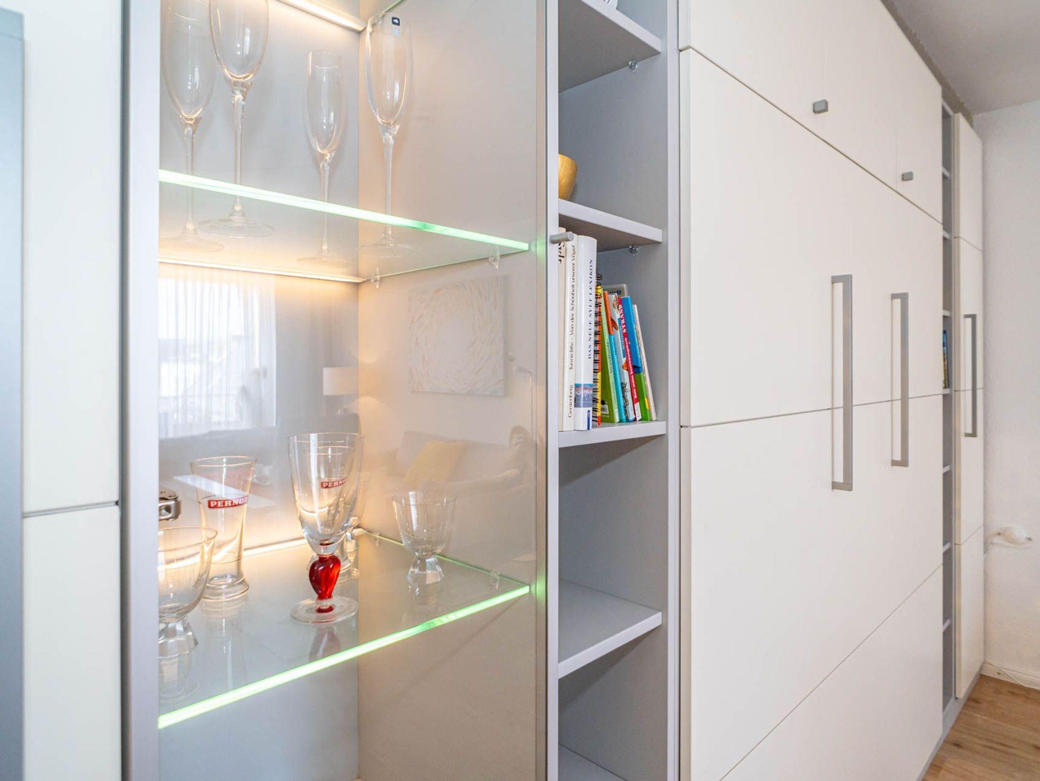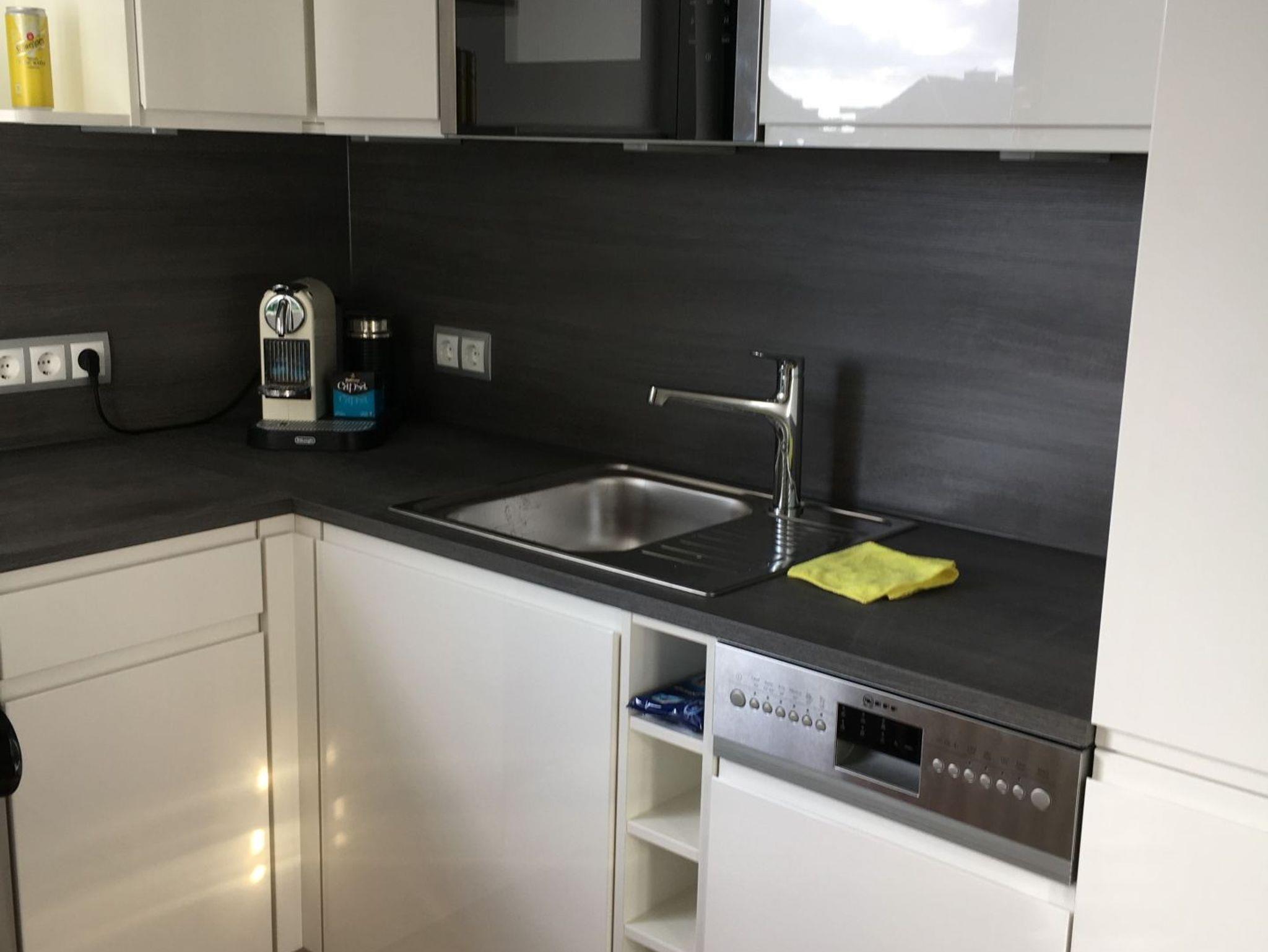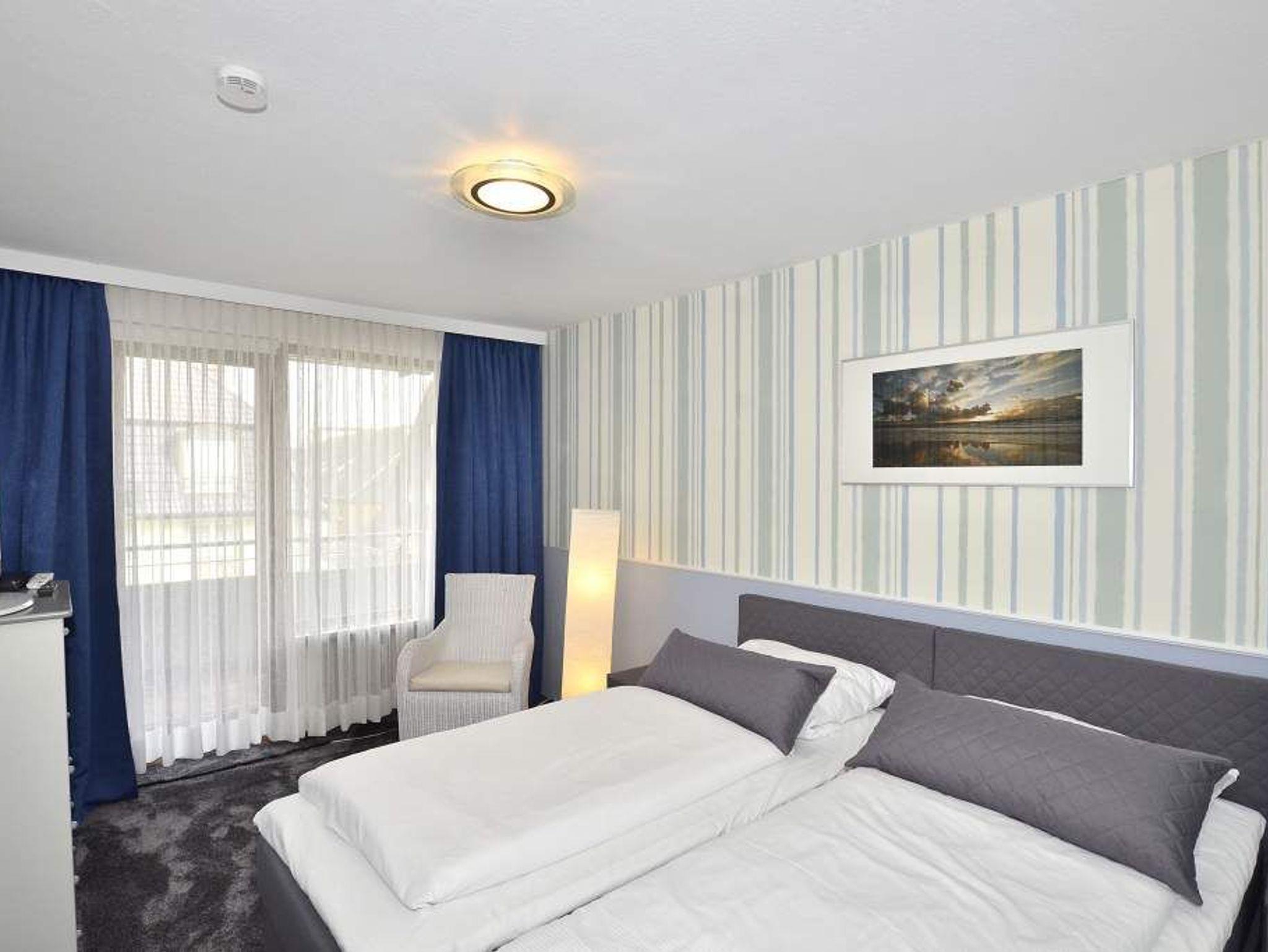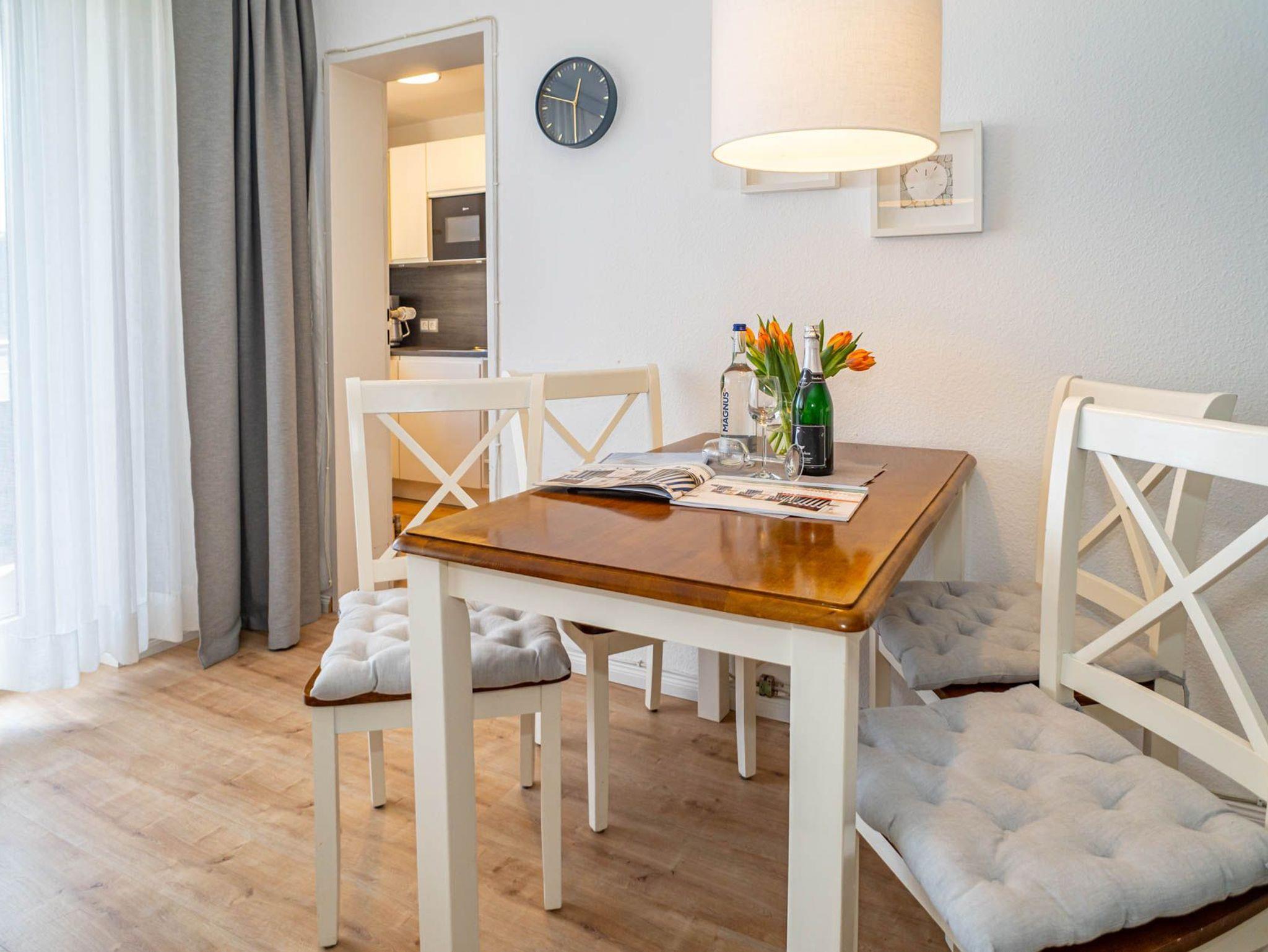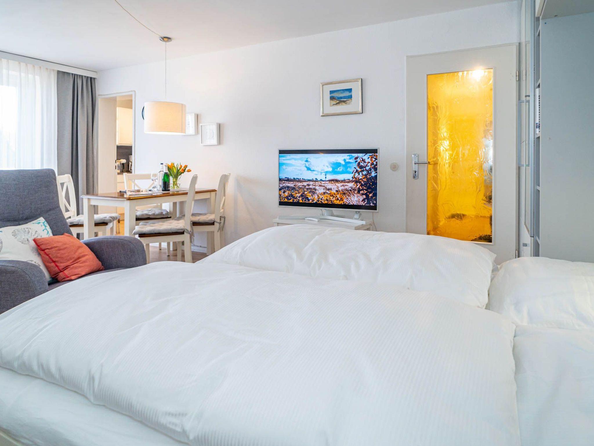 Besonders hochwertig sanierte 2-Zimmer-Nichtraucher-Ferienwohnung in der 2. Etage mit zwei Ostbalkonen mit Bio-Designboden in den Räumlichkeiten mit Ausnahme von Schlafzimmer und Bad. Von der geräumigen Diele aus gelangt man in sämtliche Räume. Das ansprechende Wohnzimmer mit zwei 2-Sitzer-Sofa, Sessel, separatem Essplatz, 1 großer Flatscreen-Smart-TV (44'' Zoll bzw. 108 cm Bildschirmdiagonale, geeignet für Netflix etc.), Telefon mit kostenloser Telefonie ins deutsche Festnetz, freiem W-Lan und Doppelschrankbett mit 2 neuen Einzelmatratzen (je 0,80 m breit) lässt keine Wünsche offen. Die neue stylische Küche ist mit Geschirrspüler, Mikrowelle und 4-Platten-Ceranfeld ausgestattet. Wasserkocher und Toaster gehören zur Grundausstattung.