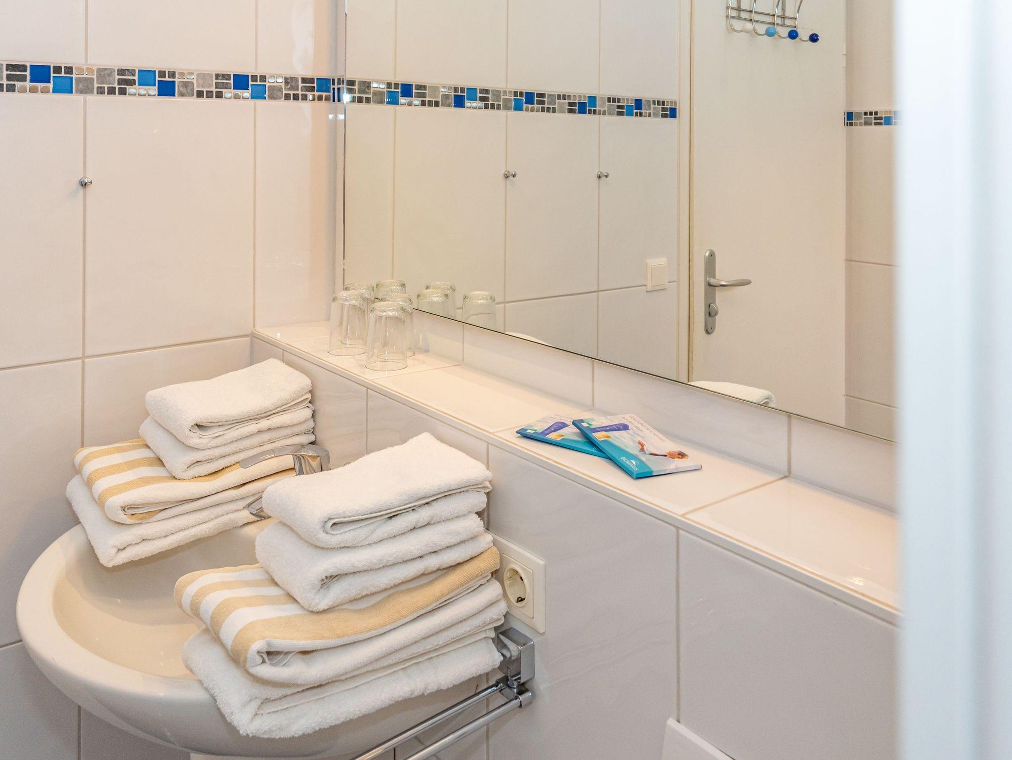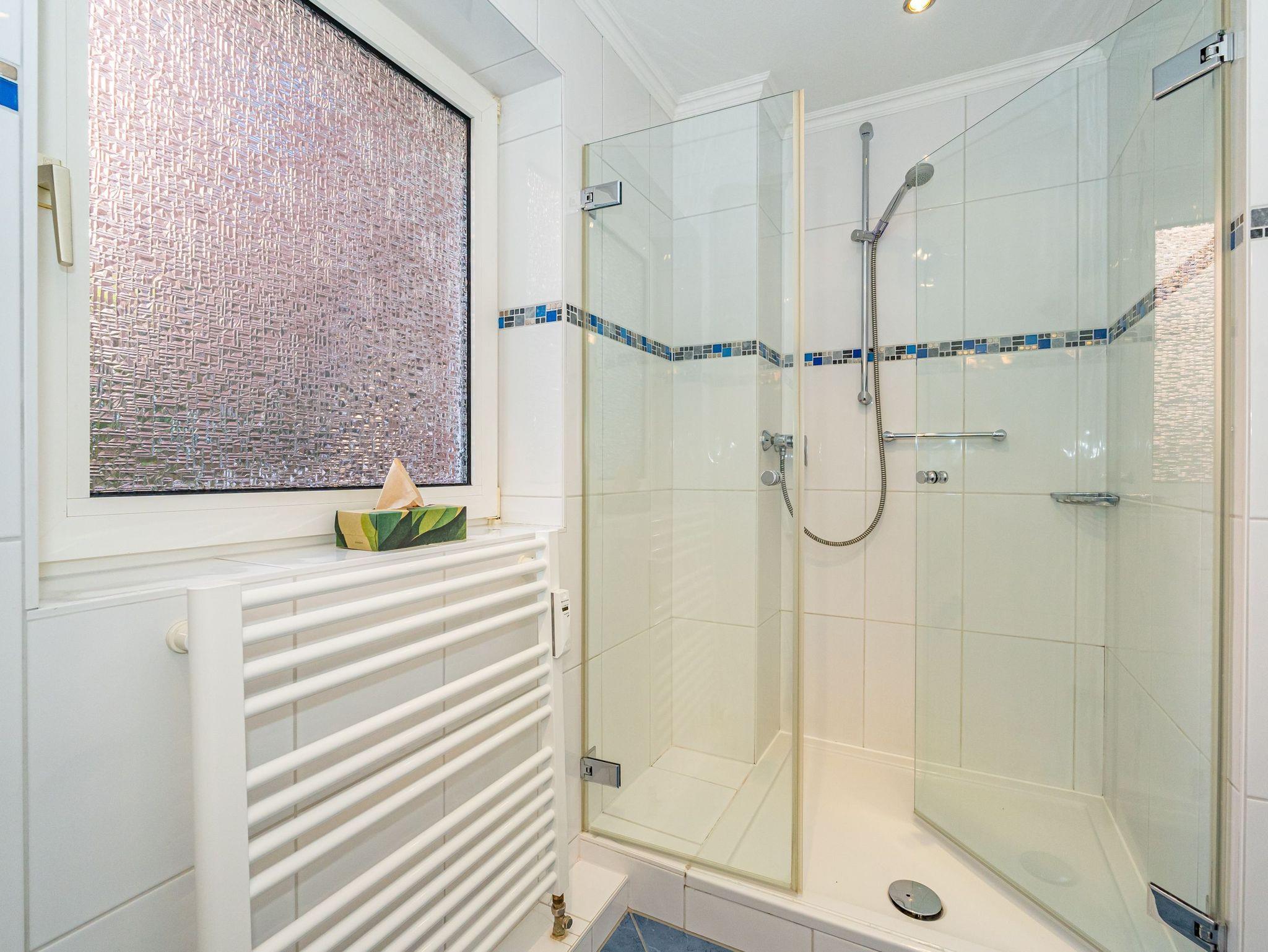 Das Duschbad hat eine flach begehbare Dusche, einen Waschtisch, einen Handtuchtrockner, WC und Fenster.