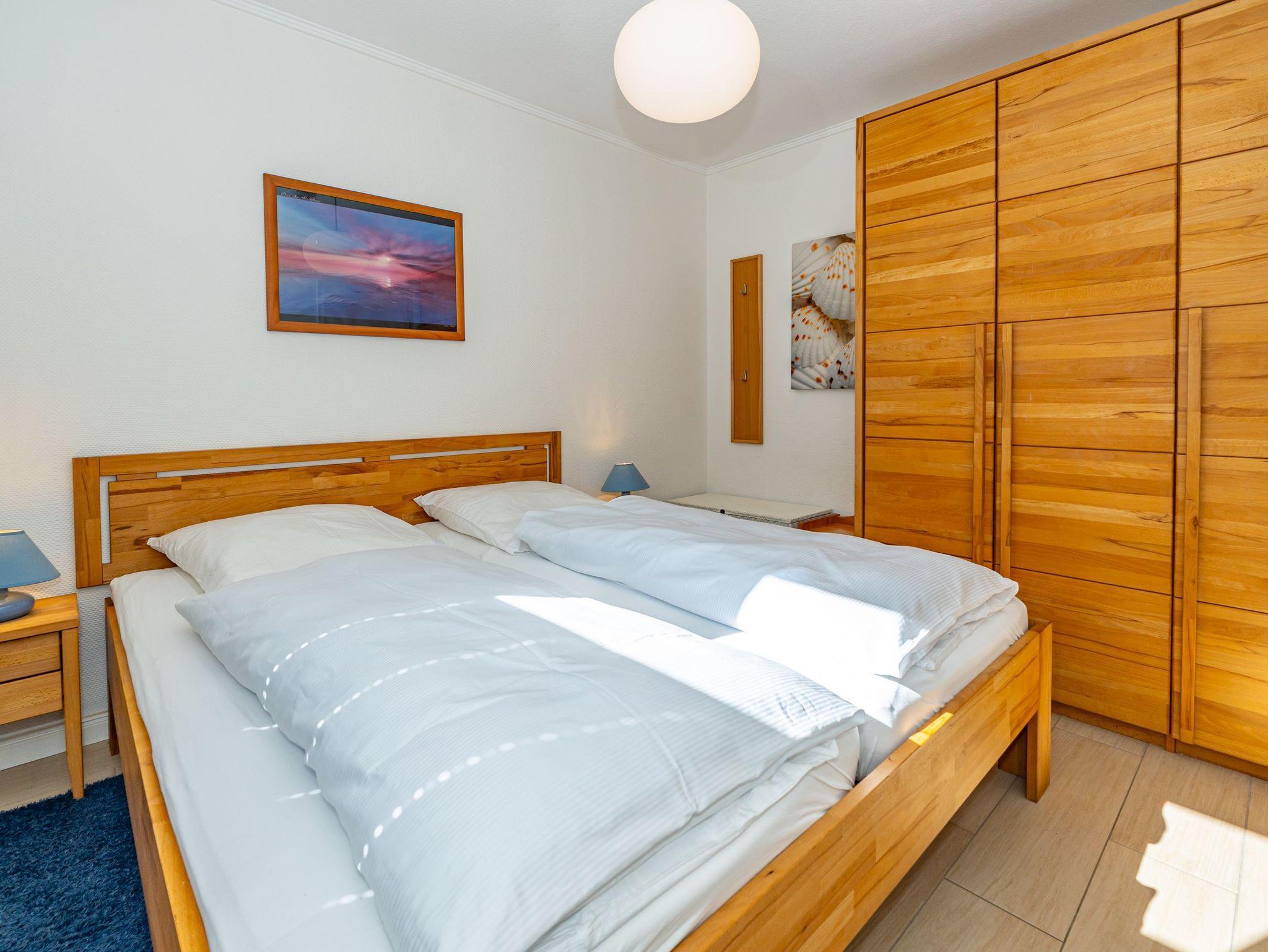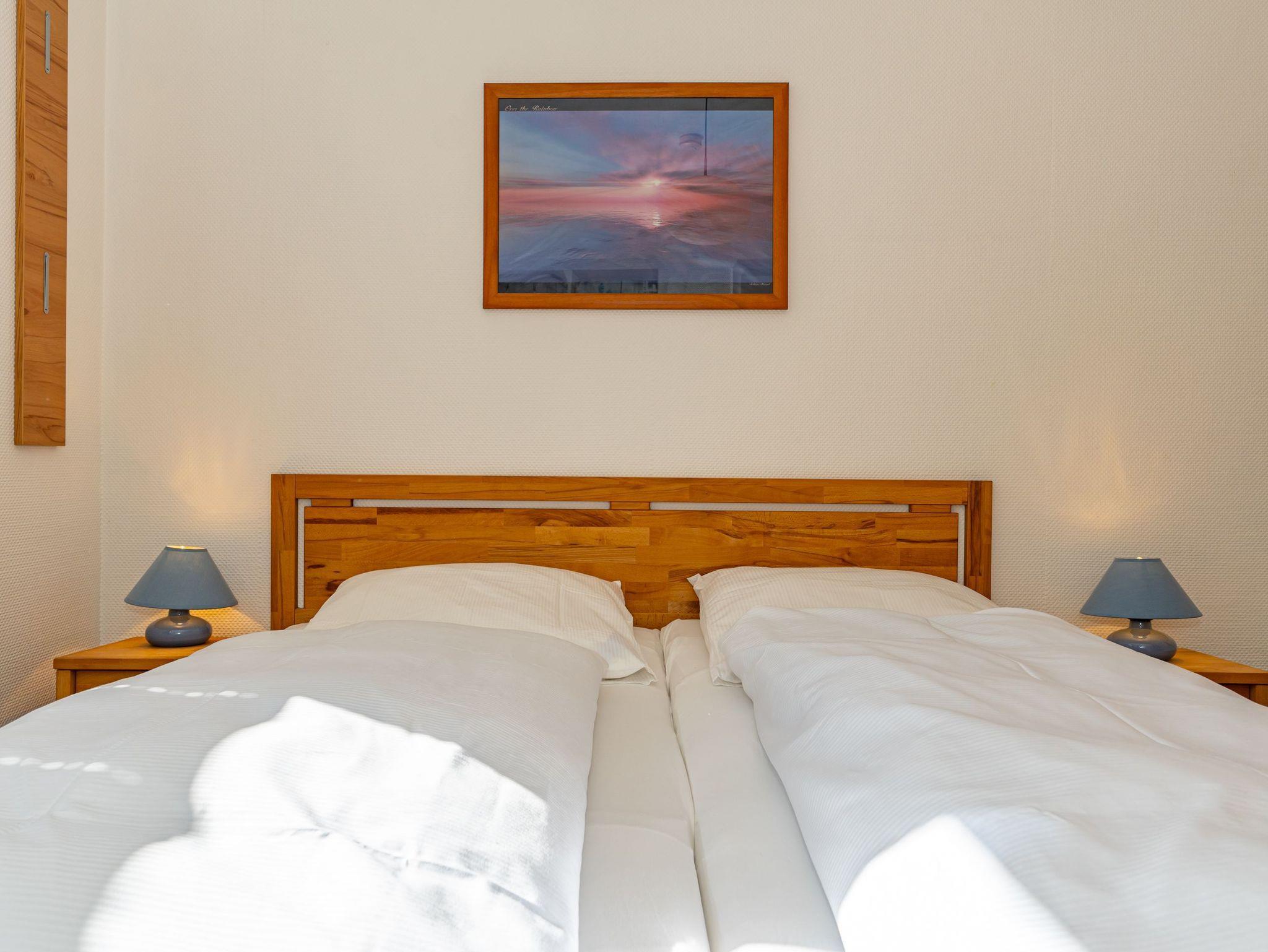 Das vom Wohnzimmer aus begehbare Schlafzimmer hat ein gutes Doppelbett (2 m x 1,80 m) mit zwei Einzelmatratzen, einen Kleiderschrank und zwei Nachttische.