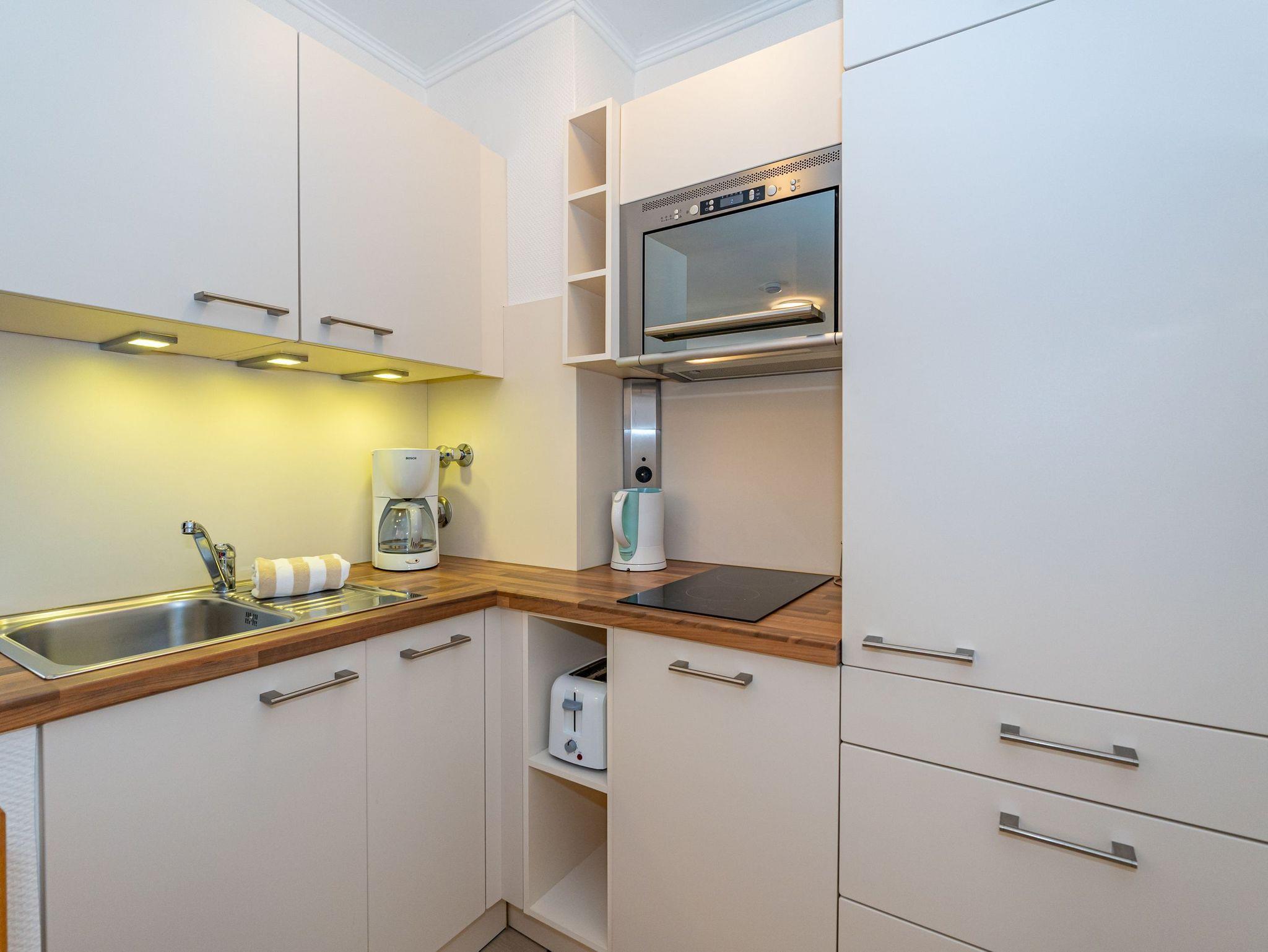 Die offene Küche hat einen Geschirrspüler, Mikrowelle mit Grillfunktion, Ceranfeld mit zwei Kochfeldern und Kühlschrank mit 3-Sterne-Gefrierfach.
