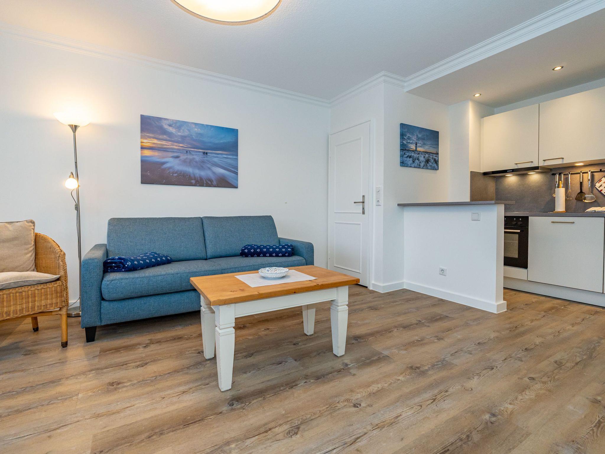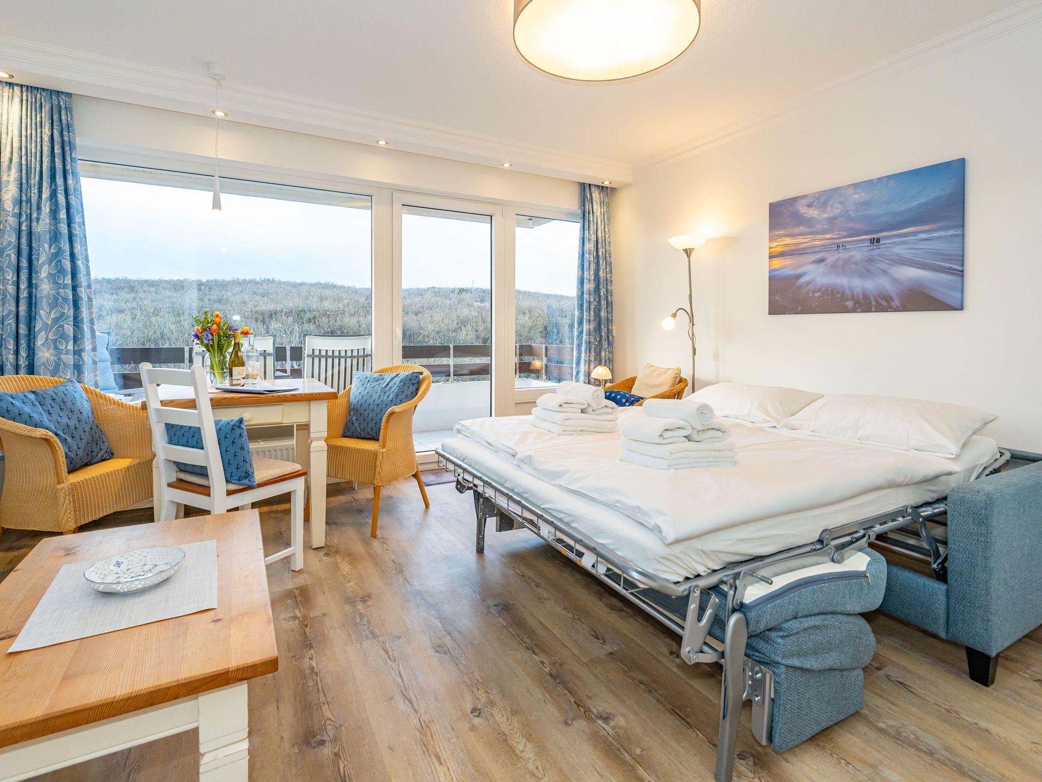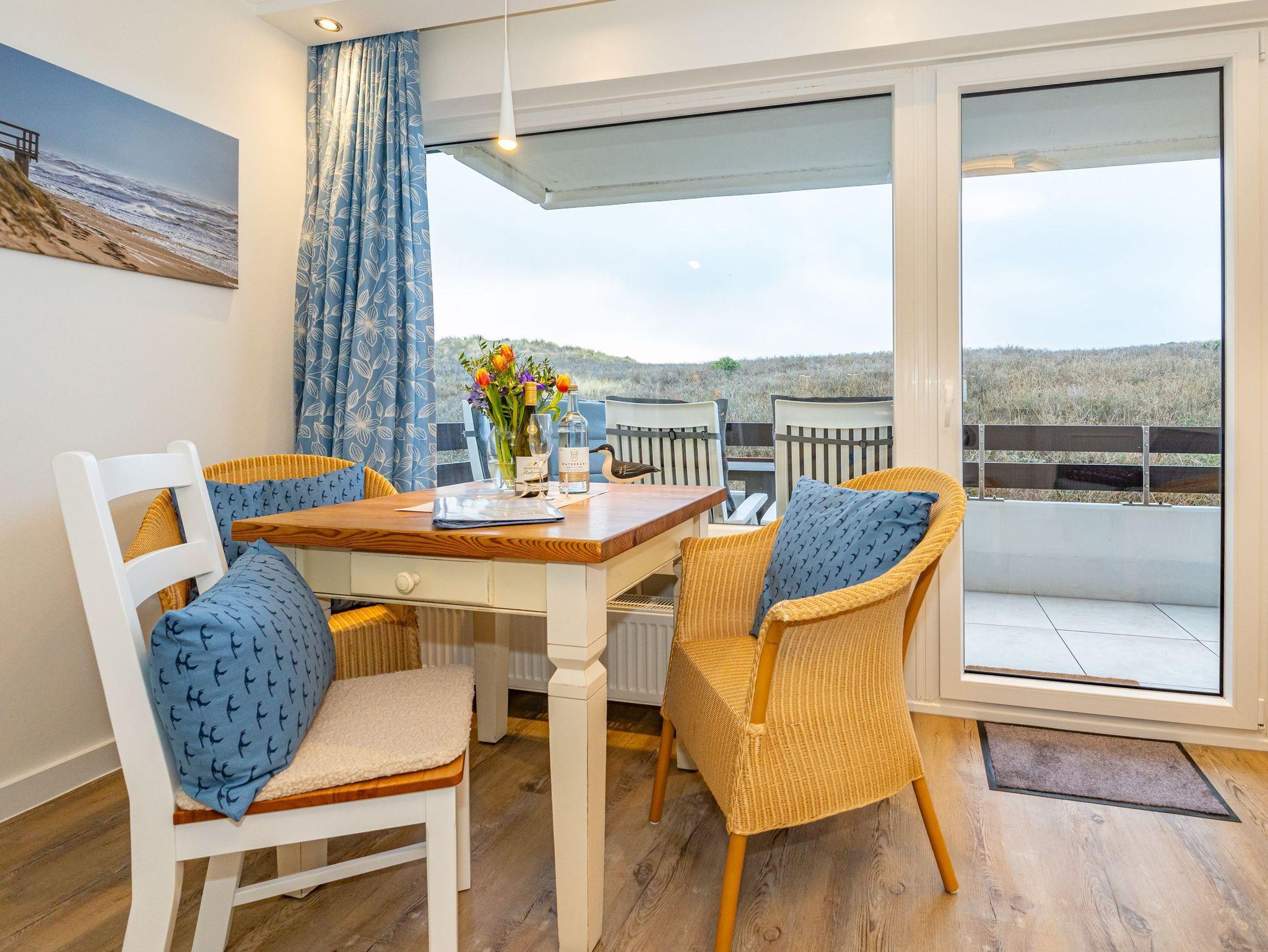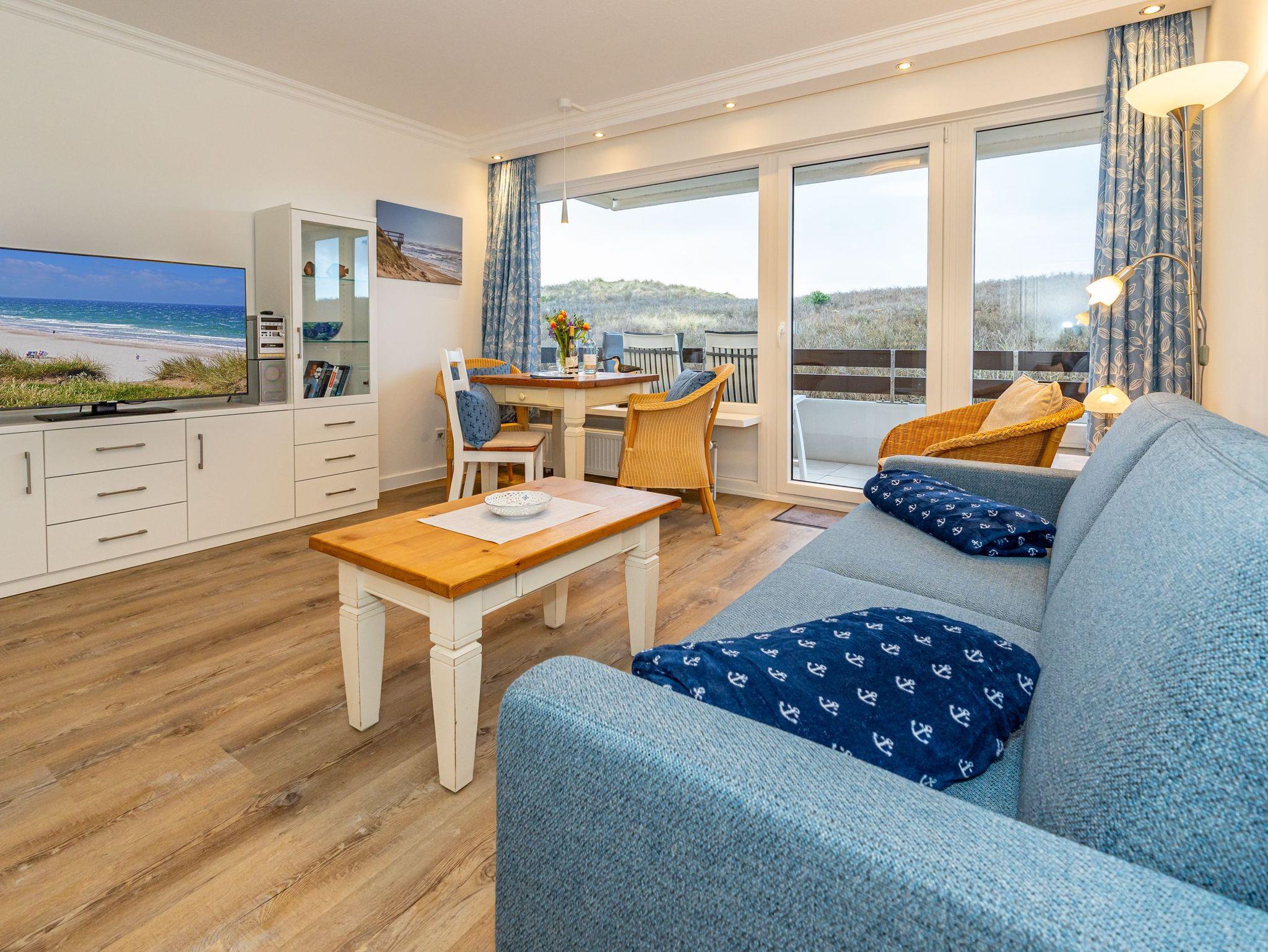 Dank der erstklassigen Lage direkt an der Düne, nahe dem Strandübergang, ist dieses Appartement der perfekte Rückzugsort für entspannte Urlaubstage. Vom Vorflur mit Garderobe gelangen Sie in das helle Wohnzimmer, das separate Schlafzimmer sowie in das neuwertige Badezimmer. Der Wohnbereich bietet eine komfortable Doppelschlafcouch (Liegefläche 1,40 x 2,00 m), eine gemütliche Sitzecke mit Couch und Sessel, einen separaten Essplatz sowie moderne Unterhaltungstechnik mit Flachbild-TV, Telefon und WLAN (ohne Gewähr). Vom Wohnzimmer aus haben Sie direkten Zugang zum Westbalkon, der mit stilvollen Möbeln zum Verweilen einlädt.