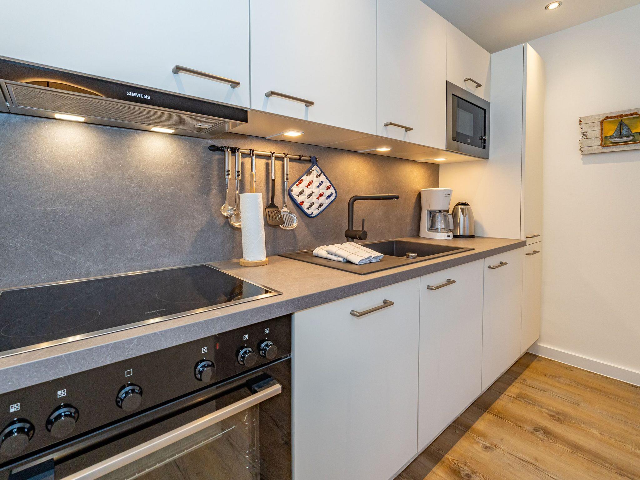 Die offene Einbauküche ist hochwertig ausgestattet und verfügt über einen Geschirrspüler, ein 4-Platten-Ceranfeld mit Backofen, eine Mikrowelle sowie einen Kühlschrank mit 4-Sterne-Gefrierfach. Zur Grundausstattung gehören zudem eine Kaffeemaschine, ein Wasserkocher und ein Toaster. Das separate Schlafzimmer bietet ein hochwertiges Doppelbett (1,80 x 2,00 m, Einzelmatratzen) sowie einen zusätzlichen Fernseher für entspannte Abende. Das neuwertige Badezimmer überzeugt mit einer Dusche mit flachem Einstieg, einem Waschtisch, einem Handtuchtrockner und einem WC.