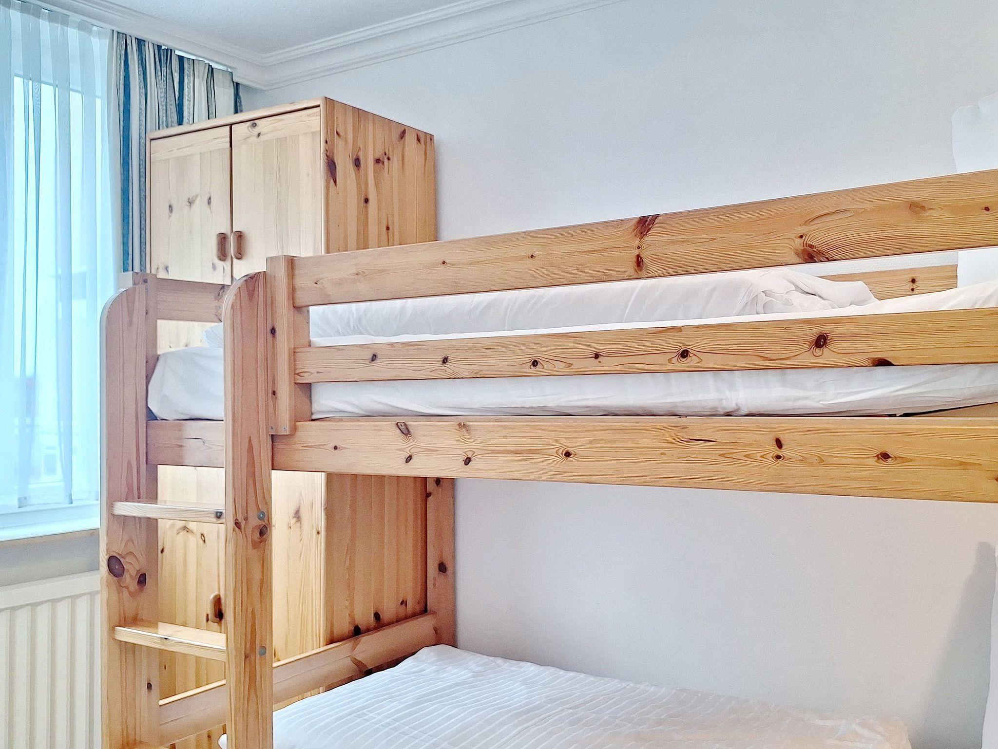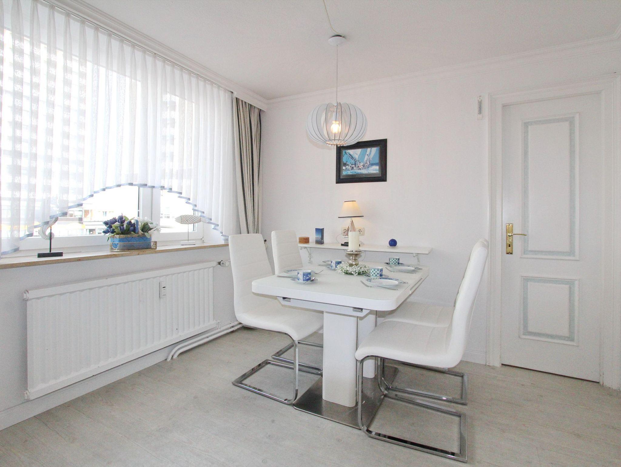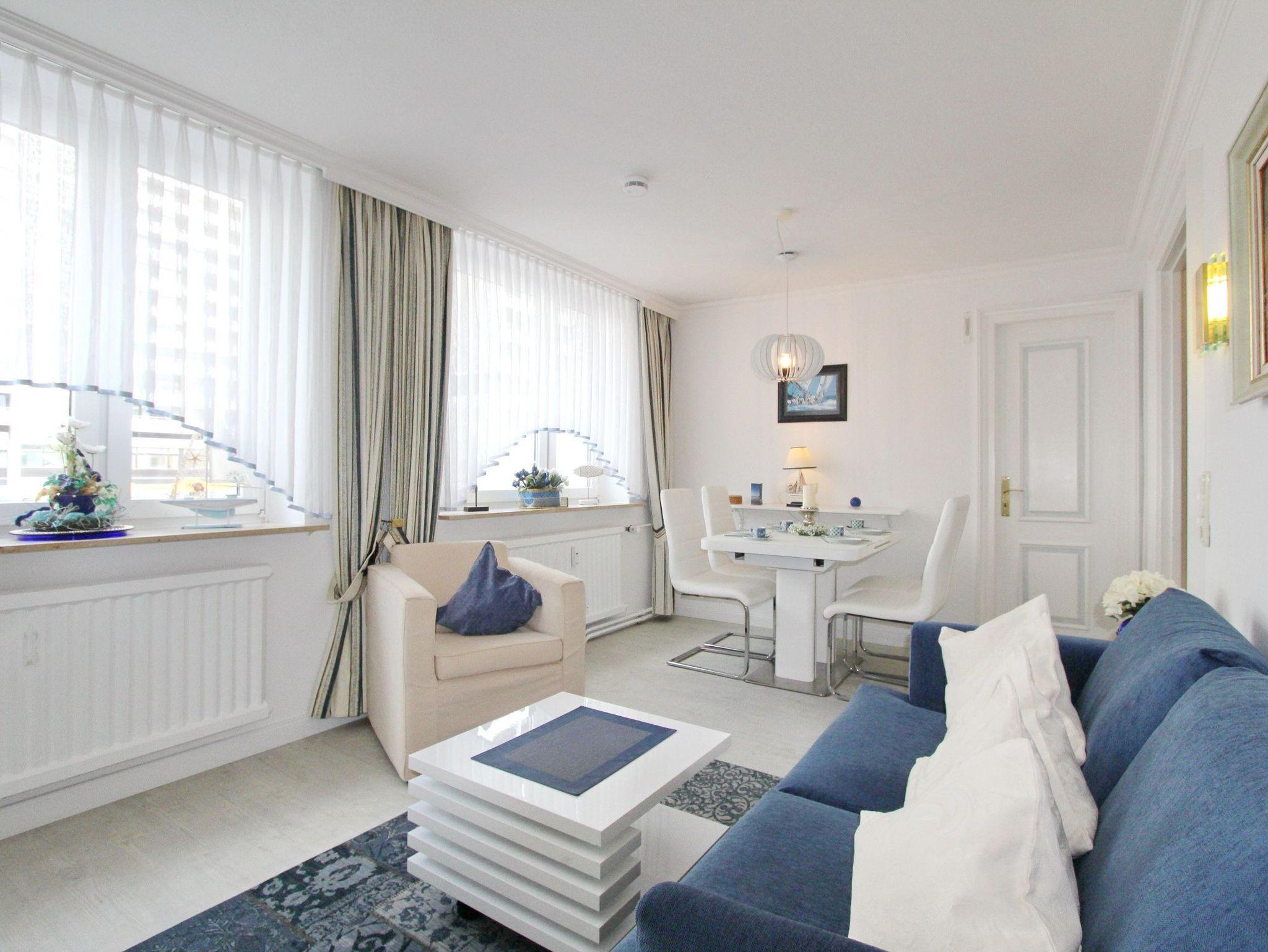 Maritim eingerichtete Dreizimmerwohnung in der 1. Etage in unmittelbarer Nähe zur Innenstadt und der Promenade von Westerland. Nur wenige Schritte trennen Sie von der Nordsee. Das Wohnzimmer verfügt über eine gemütliche Couch mit Sessel und einen Essplatz mit 4 Stühlen. Die komplette Fensterfront ist nach West ausgerichtet und lässt viel Licht in die Wohnung . Das 1. Schlafzimmer hat ein Doppelbett und einen begehbaren Kleiderschrank mit viel Stauraum. Im 2. Schlafzimmer befindet sich ein Etagenbett und ein Kleiderschrank. Die Küche ist separat und hat einen Backofen, Geschirrspüler und einen Herd mit 4 Ceranfeldkochstellen. Die umfangreiche Küchenausstattung ermöglicht es Ihnen sich selbst zu verpflegen. Das Badezimmer ist ausgestattet mit einer Dusche, einem Handtuchheizkörper und Fön. Besonders hervorzuheben ist die Waschmaschine im Bad zur Alleinnutzung. Den passwortfreien WLAN-Hotspot im Haus (WEG-AD3 - Passwortfrei - ohne Gewähr) können sie gerne kostenfrei nutzen. Die Größe dieser Nichtraucherwohnung ist ca. 50 m². Haustiere sind nicht gestattet. Der Stellplatz zur Wohnung ist separat buchbar (dieser befindet sich ca. 100m vom Objekt entfernt in der Elisabethstr./hinter Steffi Moden, Parkplatz Knoche) und kostet 10,00 Euro pro Tag.