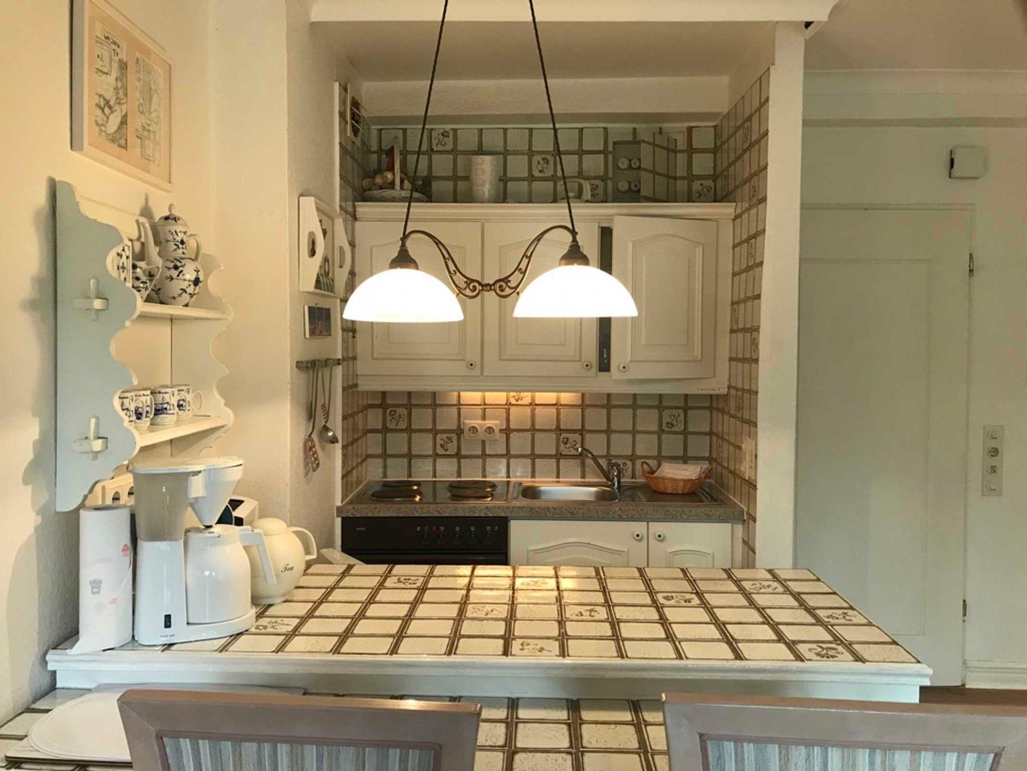 In der Küchenzeile mit 4 Platten-Kochfeld, Backofen, Filter-Kaffeemaschine, elektrischer Wasserkocher, Toaster und Geschirr für den täglichen Bedarf.