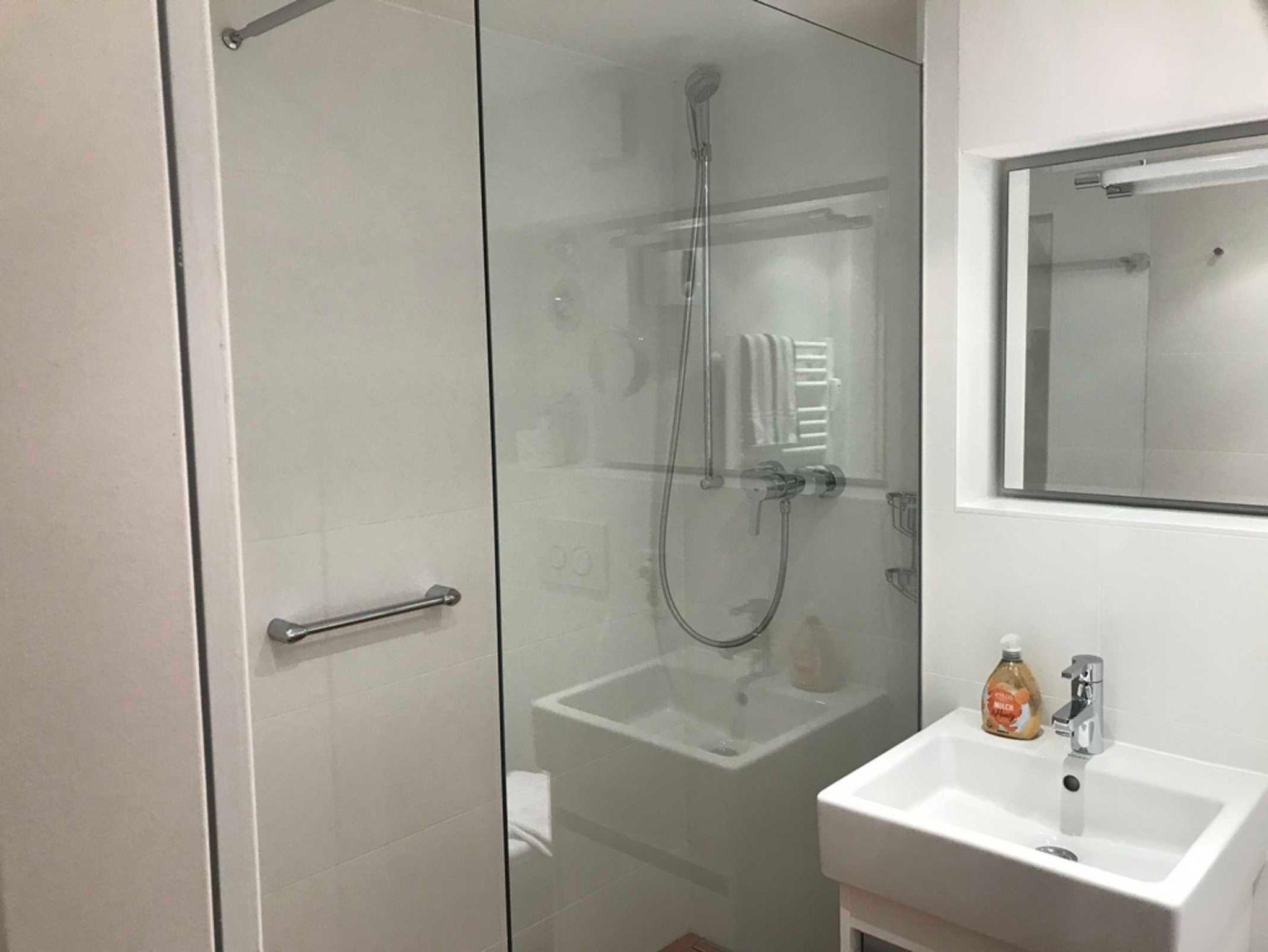 Ebenfalls im Souterrain das neue, moderne Bad mit Dusche ebenerdiger Einstieg, WC, Waschtisch, Handtuchtrockner und Fön.
