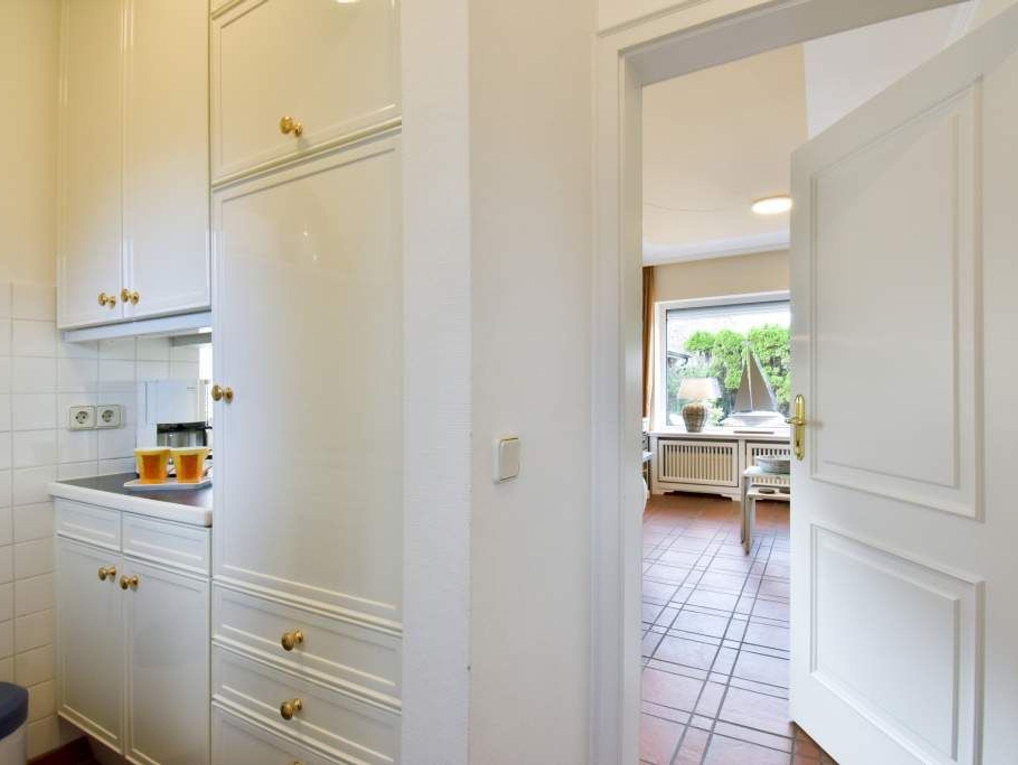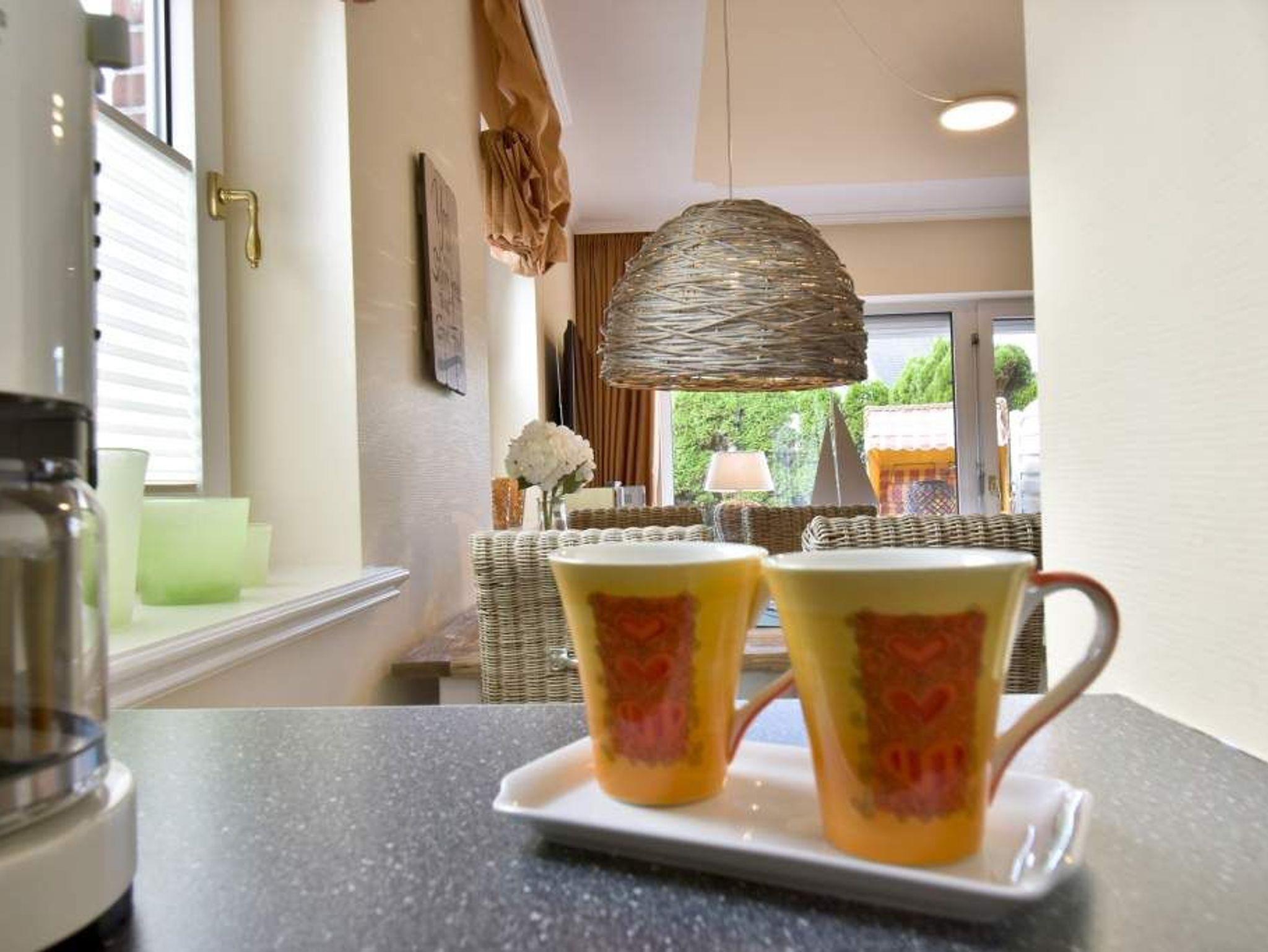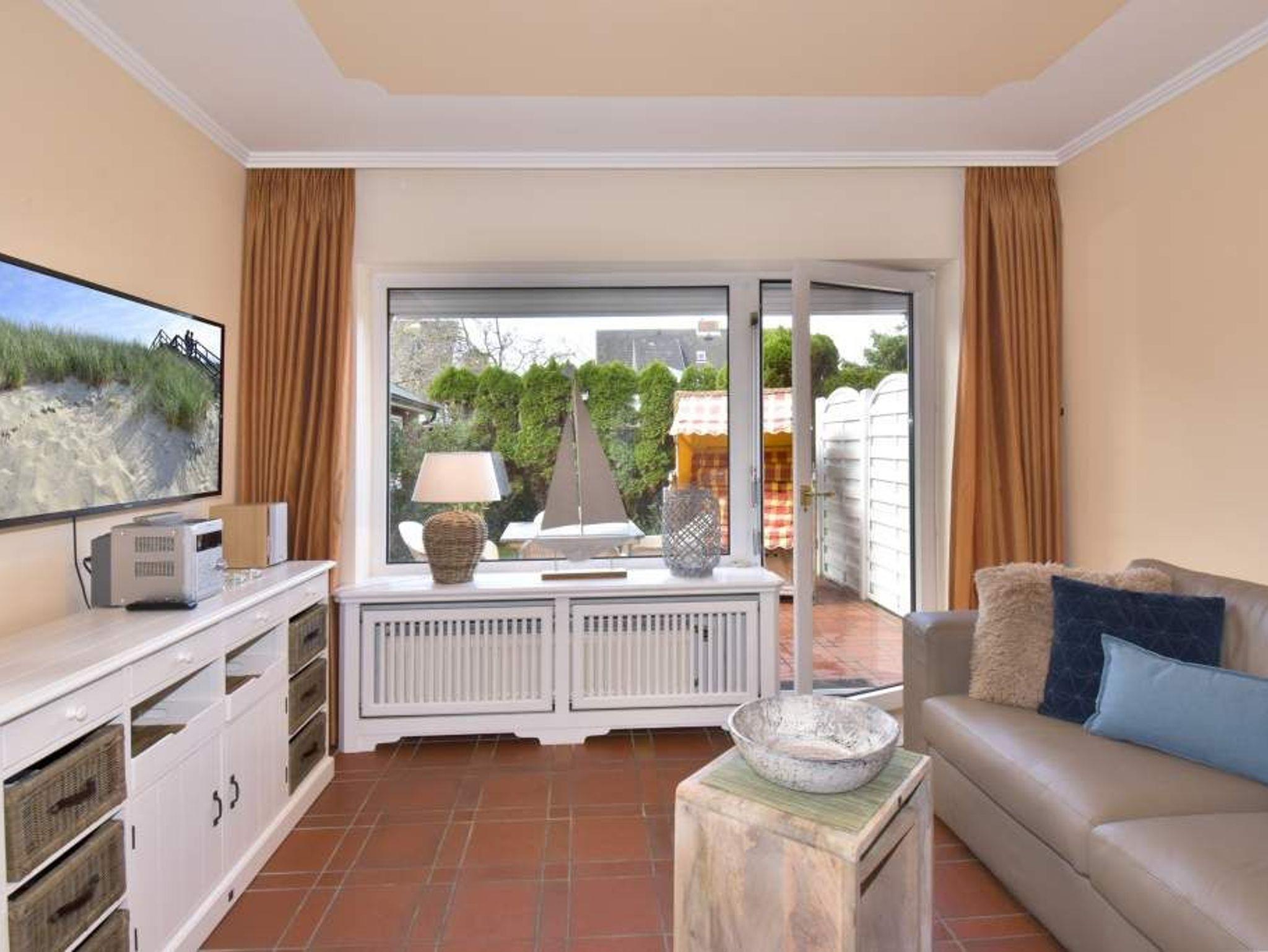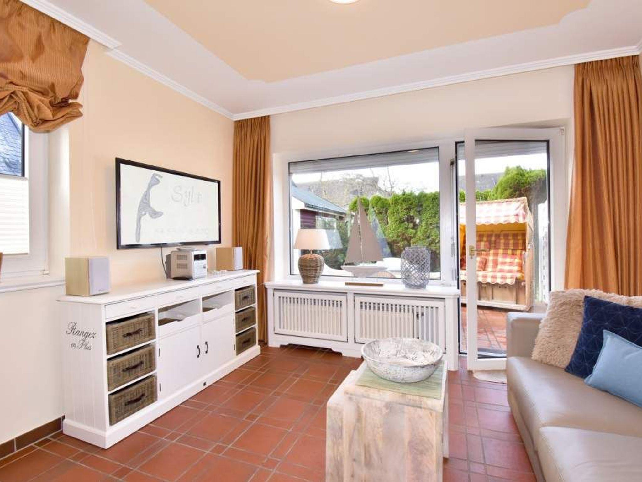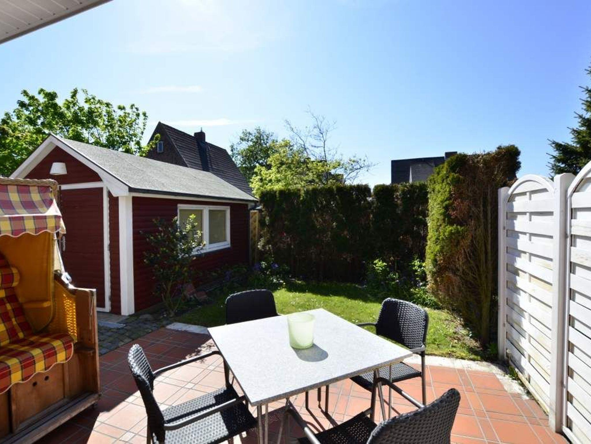Vom Wohnzimmer betritt man die nach Westen ausgerichtete Sonnenterrasse mit eigenem Strandkorb und Gartenmöbeln.