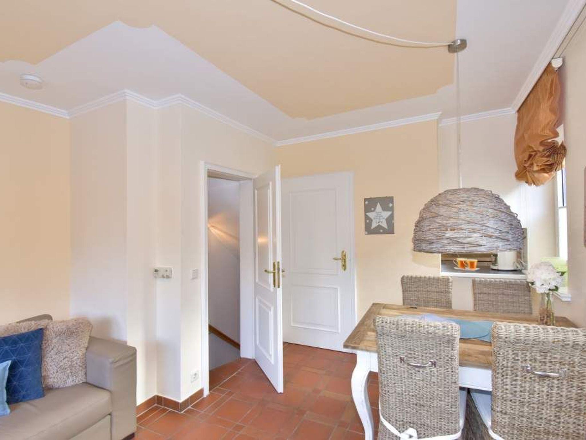 Im Erdgeschoss gelangt man von der Diele in das gemütliche Wohnzimmer und in die Küche mit Durchreiche zum Esstisch.