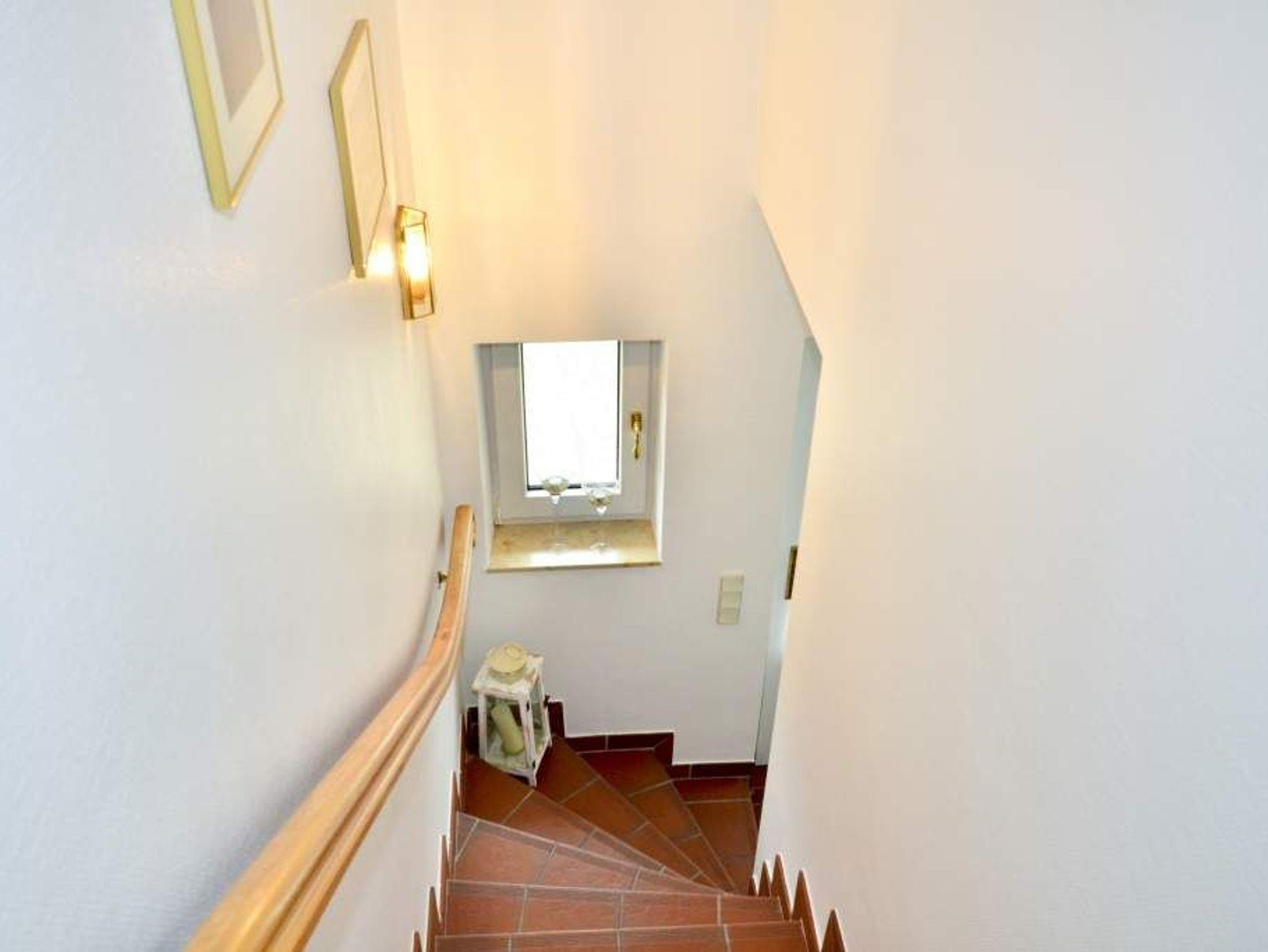 Im 1. Obergeschoss befindet sich ein Doppelschlafzimmer und ein Wannenbad. Das Schafzimmer hat ein Doppelbett (Maß: 0,90 m x 2,00 m, mit Einzelmatratzen) und Kleiderschrank.
