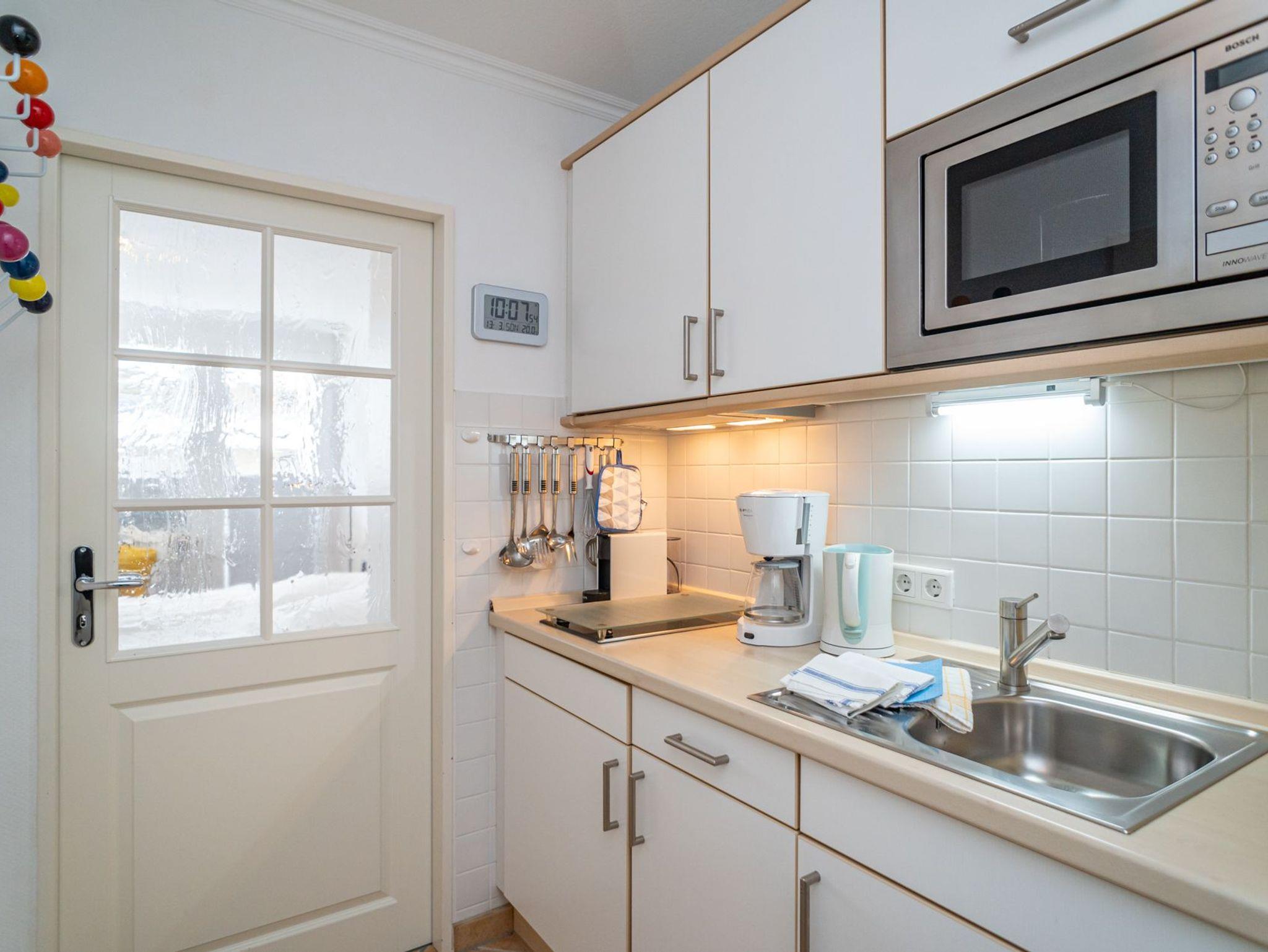 Die moderne, neue Küchenzeile hat ein Cerankochfeld, eine Mikrowelle mit Grillfunktion und einen Kühlschrank mit 3*-Gefrierfach.