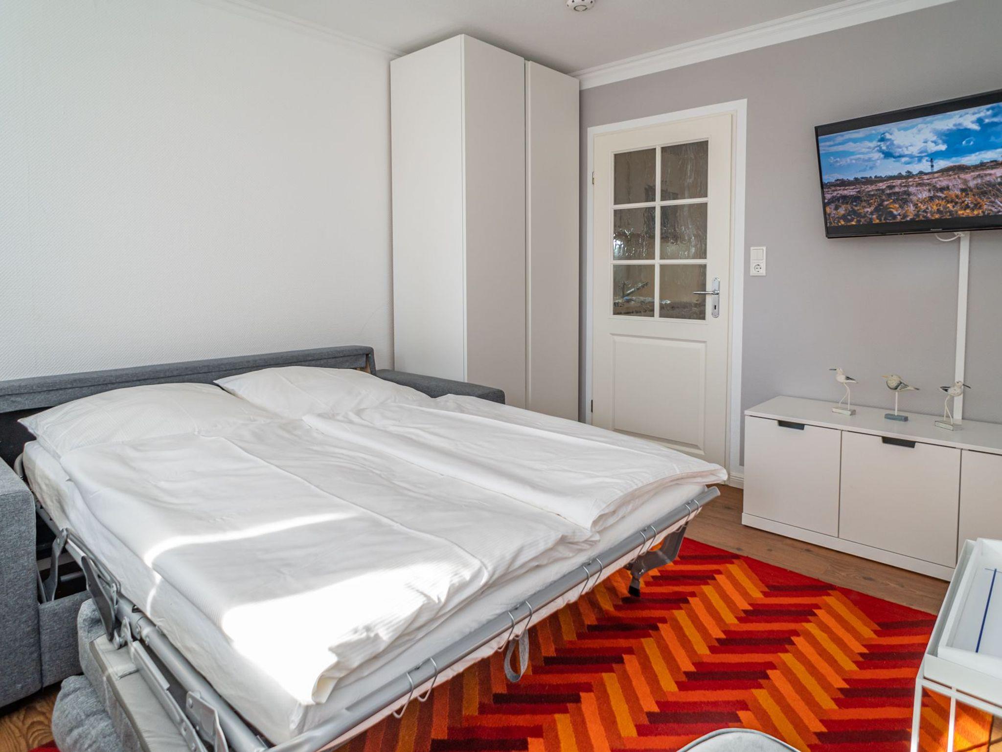Der gemütliche Wohn-/Schlafraum mit neuem Designerboden in Holzoptik besteht aus einem Schlafsofa (1,40 x 2,00 m), einem Essplatz mit Sitzbank, einem neuen Kabel-Flachbild-TV, Radio-CD.