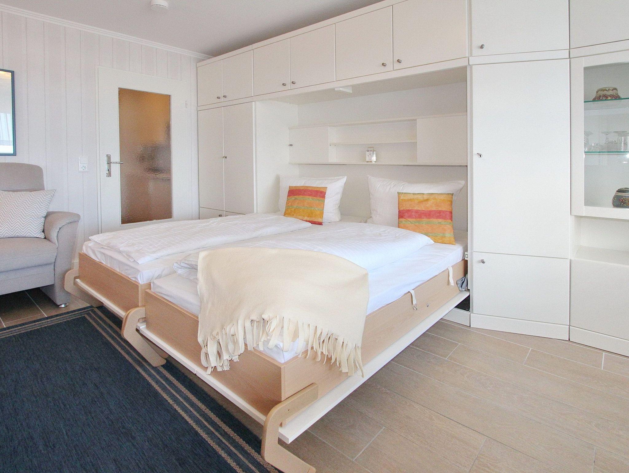 Einzimmerwohnung der 4. Etage im Haus am Meer mit Blick auf die Nordsee. Der kombinierte Wohn-/Schlafraum mit vorgelagertem Westbalkon (Balkonmöbel und Auflagen sind vorhanden), verfügt über Einzelschrankbetten (mit Besucherritze), einen Essplatz am Fenster mit 2 Stühlen und einer Sitzgruppe mit Sofa und Relaxsessel. Das Badezimmer hat einen Handtuchtrockner, Fön und eine Dusche mit einem flachen Einstieg. In der Küchenzeile mit Backofen und Ceranfeld können sie kleine Mahlzeiten zubereiten. Zur technischen Ausstattung gehört: ein Flachbildfernseher und ein Nostalgieradio. Ein kostenfreier Zugang zum WLAN Hot Spot (WEG Haus am Meer - Passwortfrei - ohne Gewähr) kann genutzt werden. Wohnungsgröße: ca. 34 m².