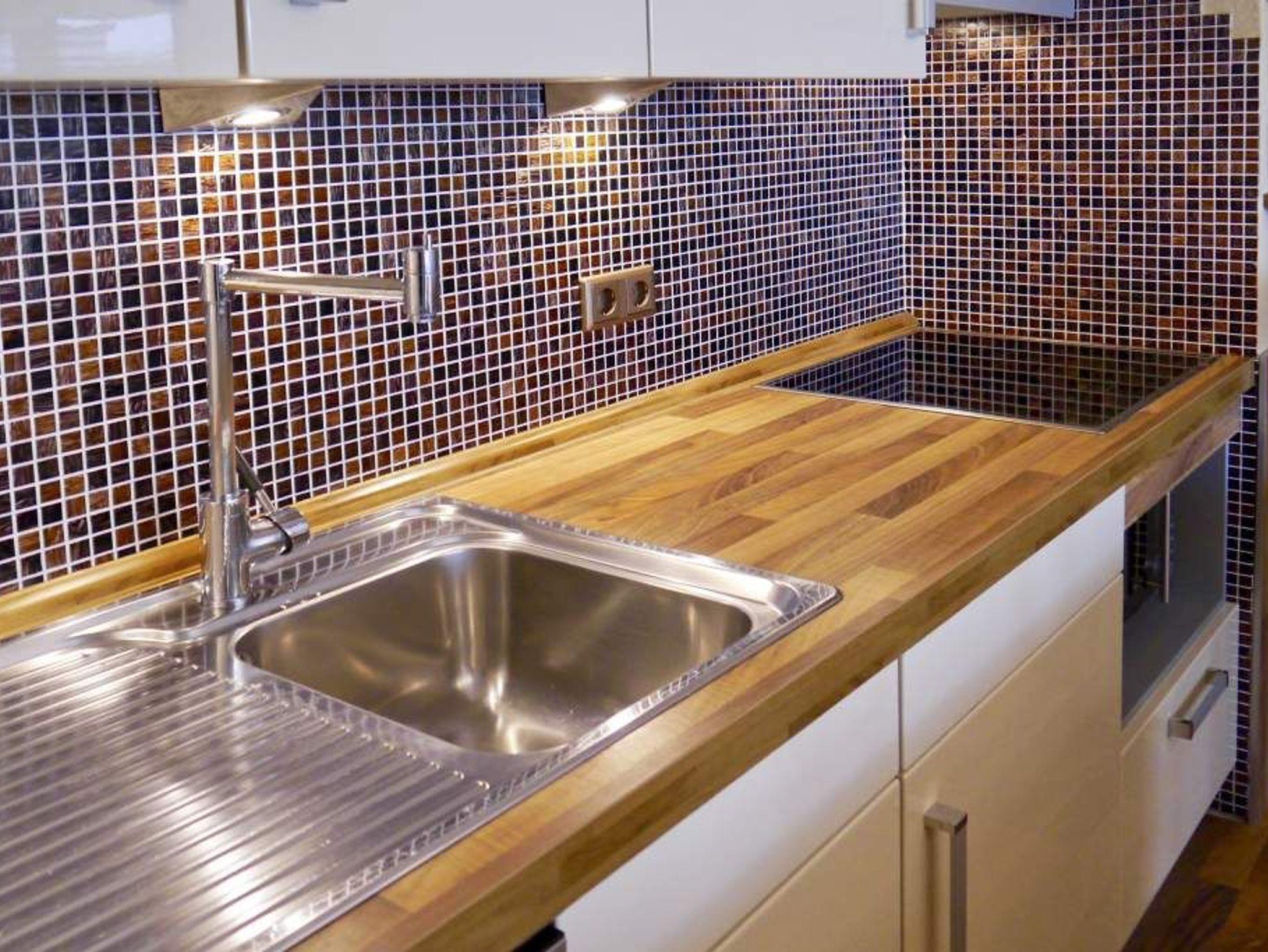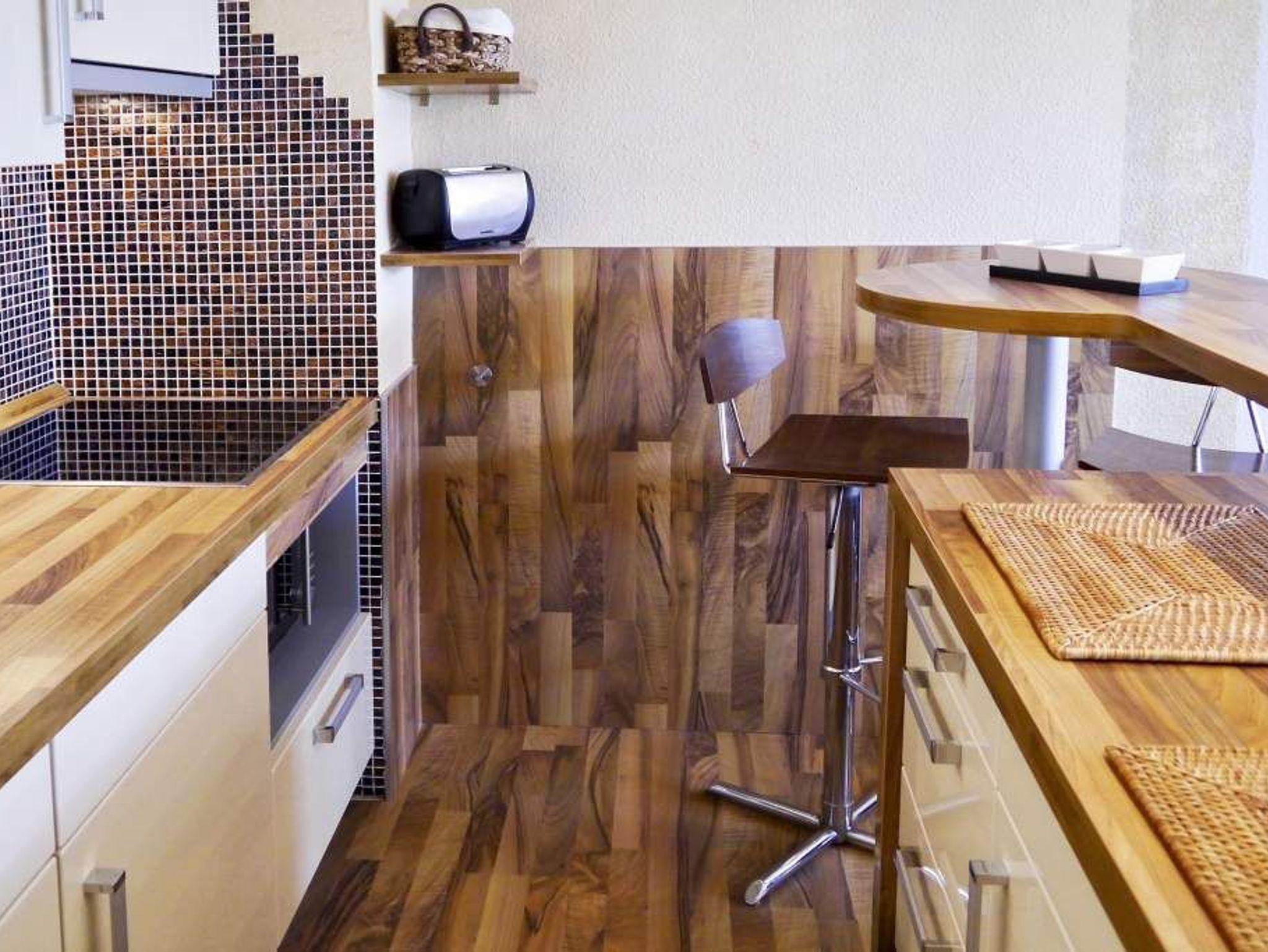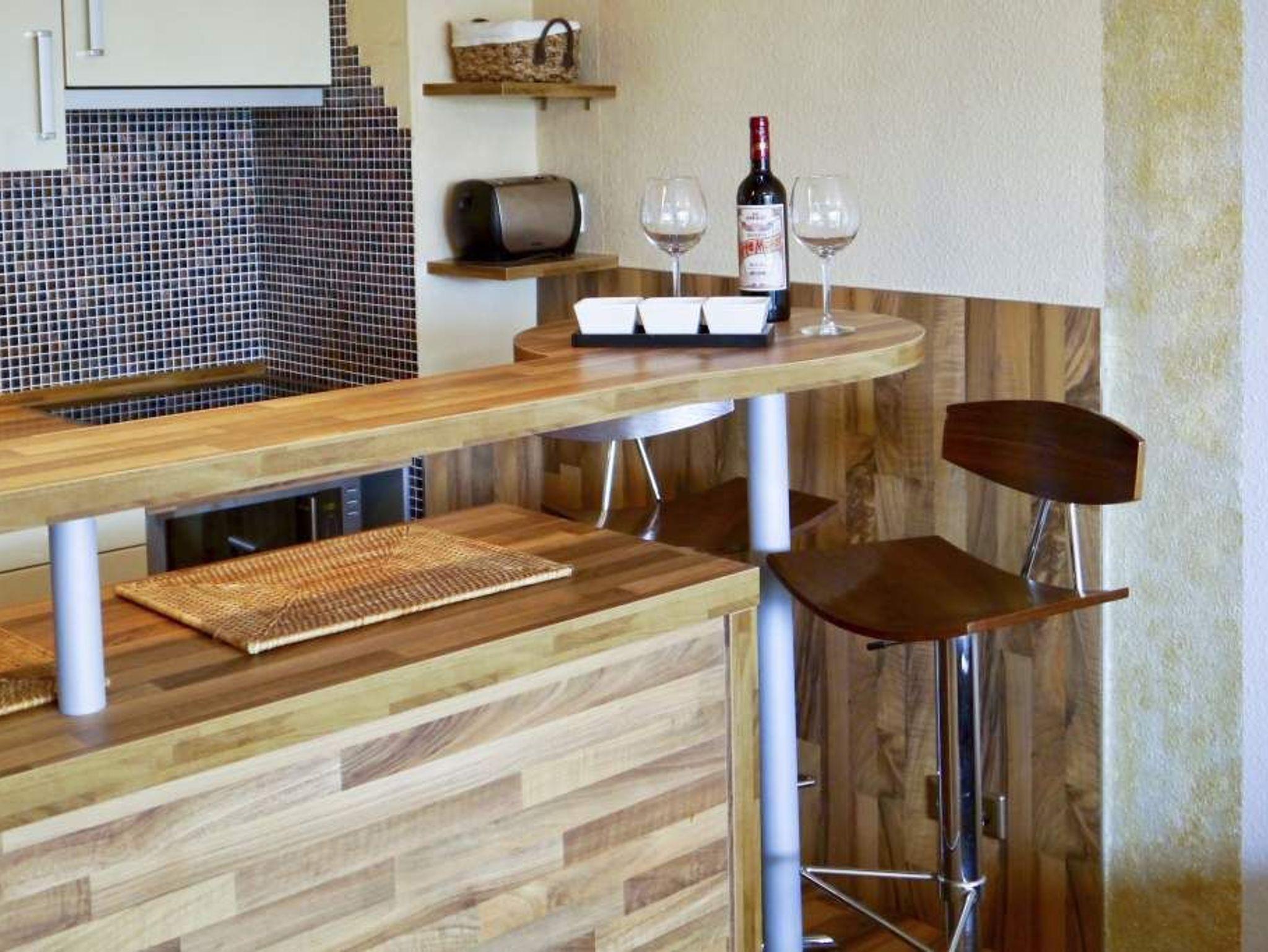 Die offene Küche hat einen Tresen zum Wohn-/Schlafraum und ist mit Geschirrspüler, Mikrowelle, Ceranfeld (mit 4 Kochfeldern) und Kühlschrank ausgestattet. Kaffeemaschine, Wasserkocher und Toaster gehören zur Grundausstattung.