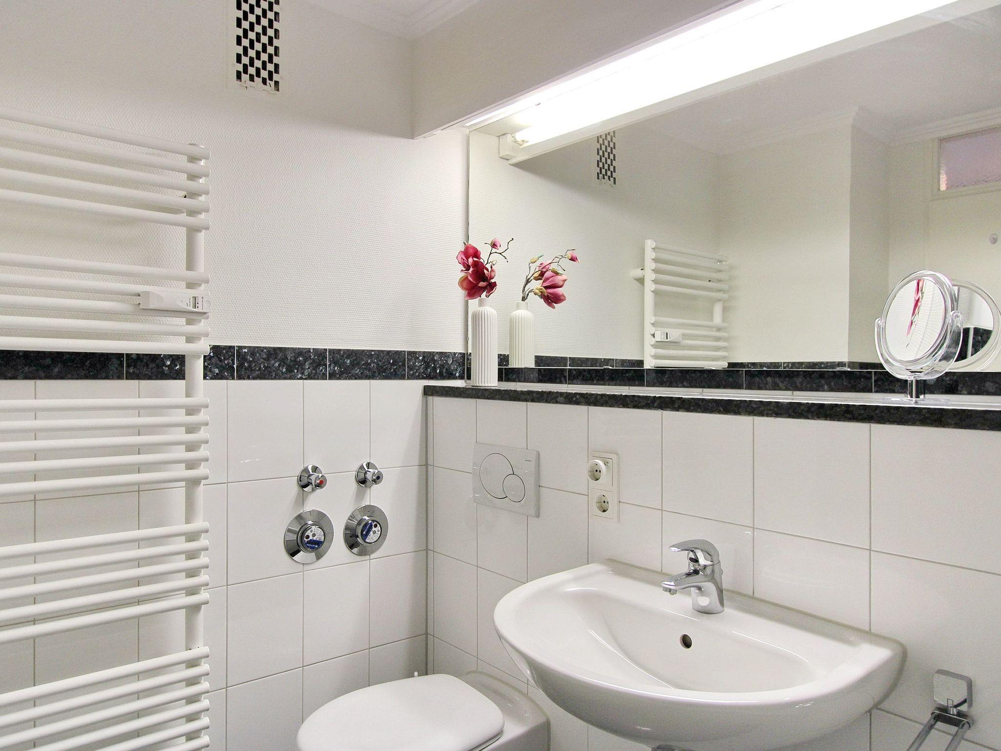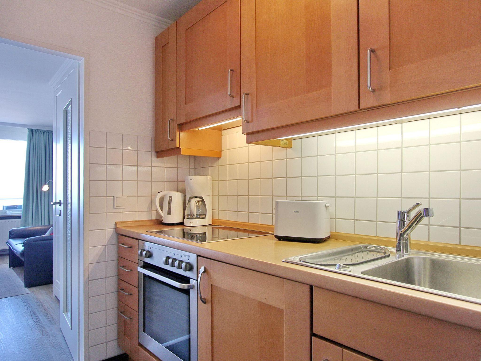 Diese Einzimmerwohnung in der 6. Etage im Haus Metropol hat einen traumhaften Blick auf den Strand und die Nordsee. Der Wohn-/Schlafraum mit vorgelagertem Westbalkon (inkl. Balkonmöbeln von Kettler) wurde hochwertig und neu gestaltet. Er hat einen Designfußboden in Holzoptik, ein von beiden Seiten begehbares Boxspringbett, einen Essplatz mit 2 Stühlen am Fenster und ein Ledersofa mit Tischen. Die Fenster haben Plissees als Sonnenschutz und auch Verdunklungsvorhänge. Im Badezimmer lädt eine Badewanne zum Entspannen ein und einen beheizten Handtuchtrockner gibt es ebenfalls. Die sehr gut ausgestattete Einbauküche im Flur besitzt ein Cerankochfeld und einen Backofen. Zur technischen Ausstattung dieser Nichtraucherwohnung gehören ein schwenkbarer Flachbildfernseher, eine Bluetoothanlage mit NFC und 2 USB Ladesteckdosen. Ein freies WLAN-Netzwerk (WEG Haus Metropol - Passwortfrei - ohne Gewähr) steht Ihnen kostenfrei zur Verfügung. Wohnungsgröße: ca. 34 m²