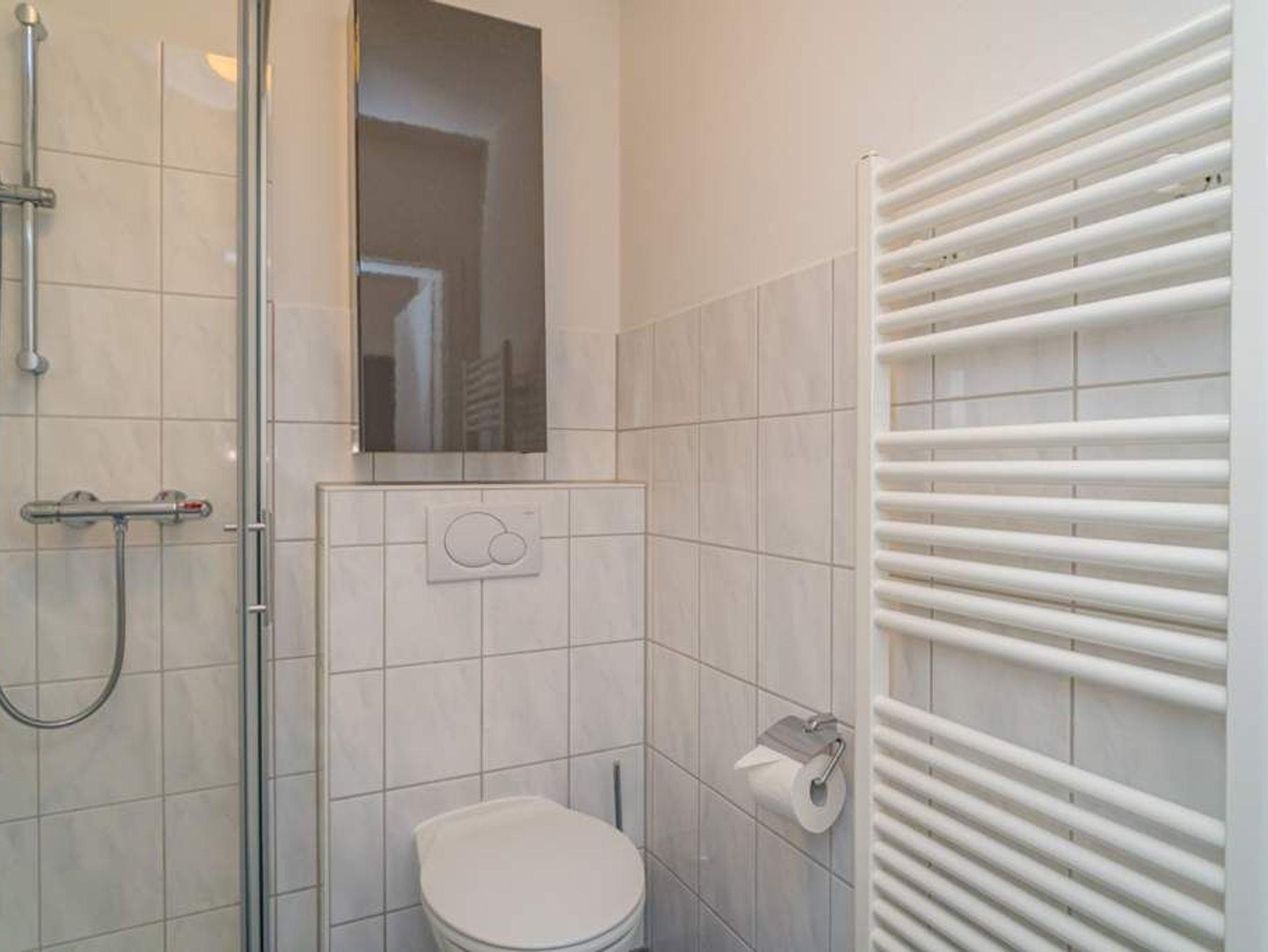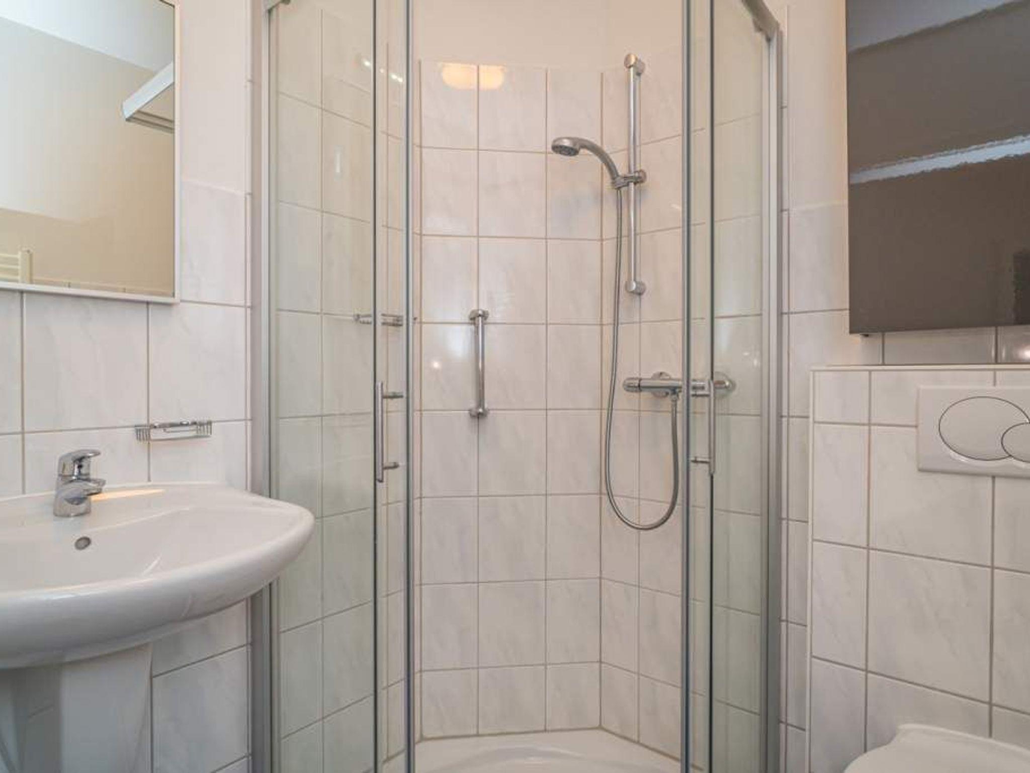 Das Duschbad hat neben der Dusche, einen Waschtisch, Handtuchtrockner und WC.