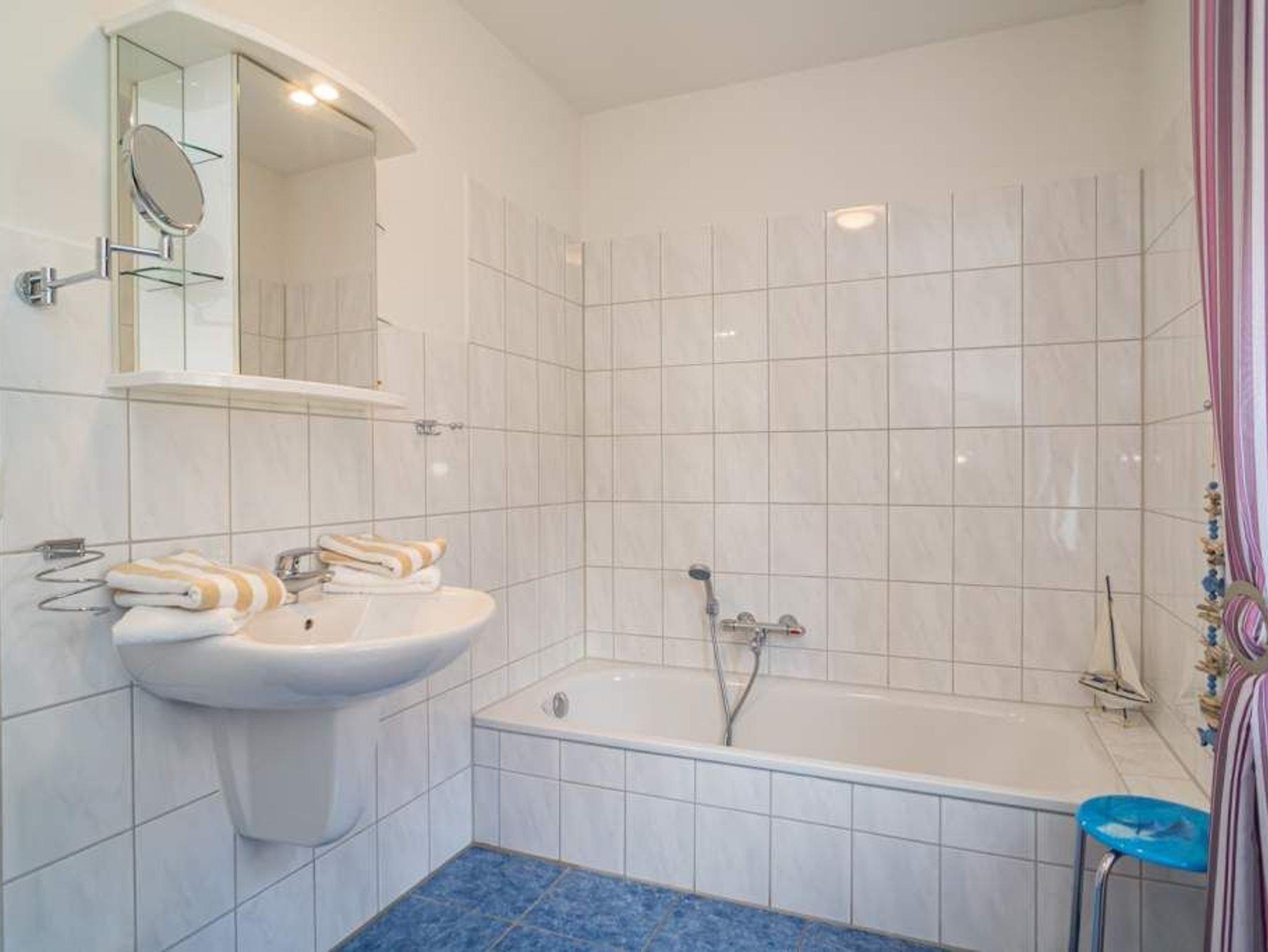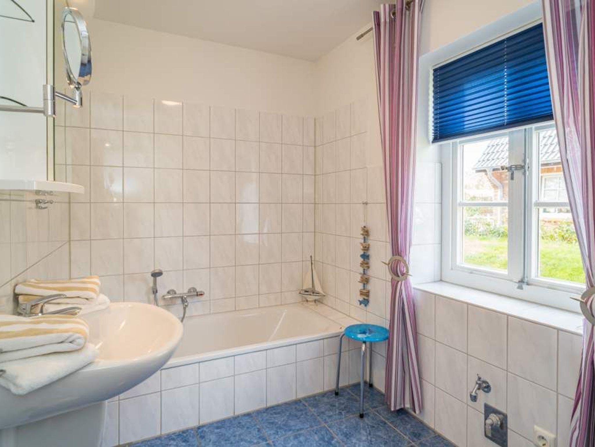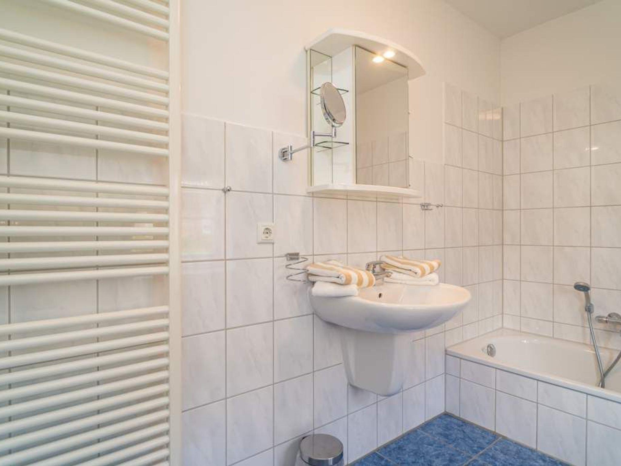 Es ist mit Badewanne, Waschtisch, Handtuchtrockner, Fön und WC ausgestattet.