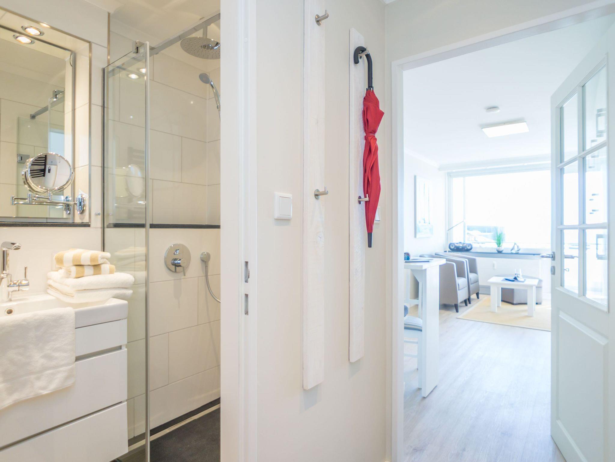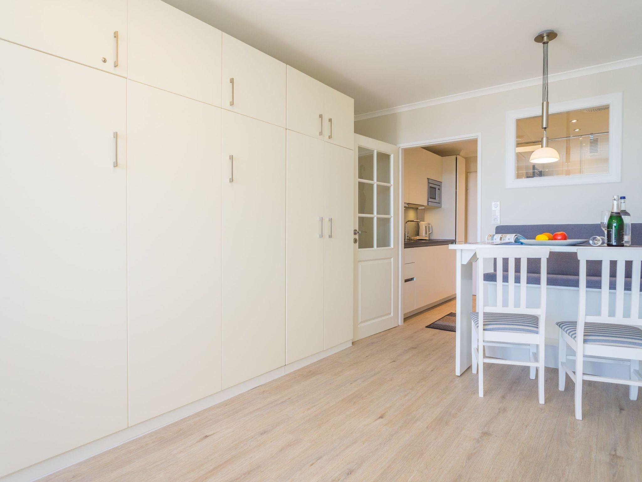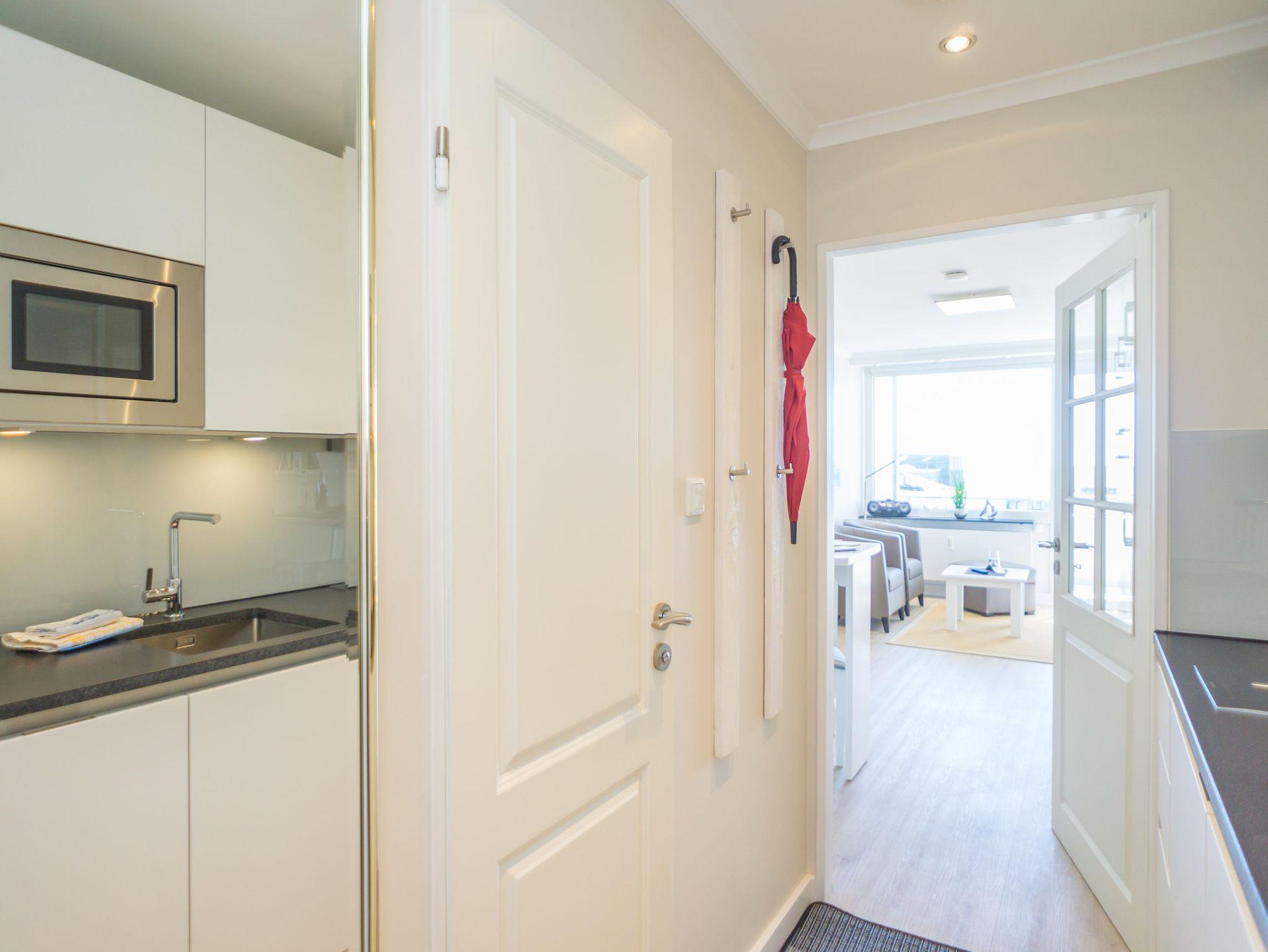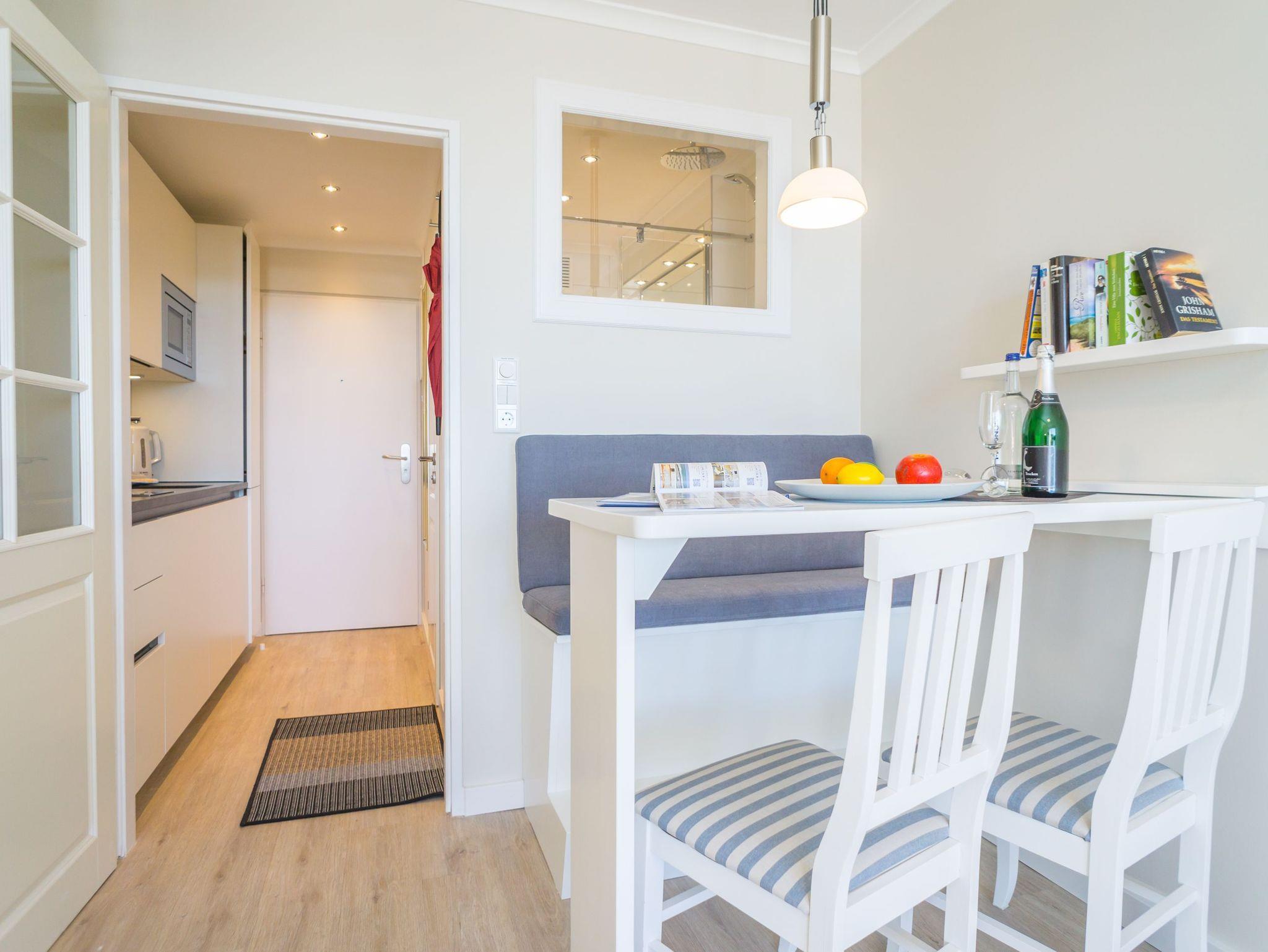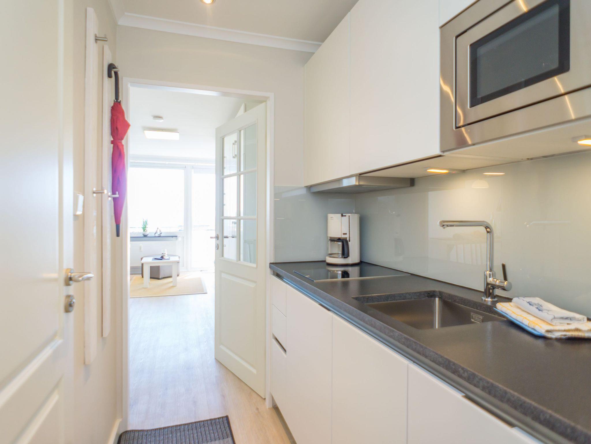 1-Zimmer-Nichtraucher-Ferienwohnung (ca. 25 qm) mit modernem Designerboden in Holzoptik, in der 3. Etage, mit Meerblick zur Seeseite mit Westloggia (Nachmittagssonne, mit Balkonmöbeln und Auflagen) für max. 2 Personen.