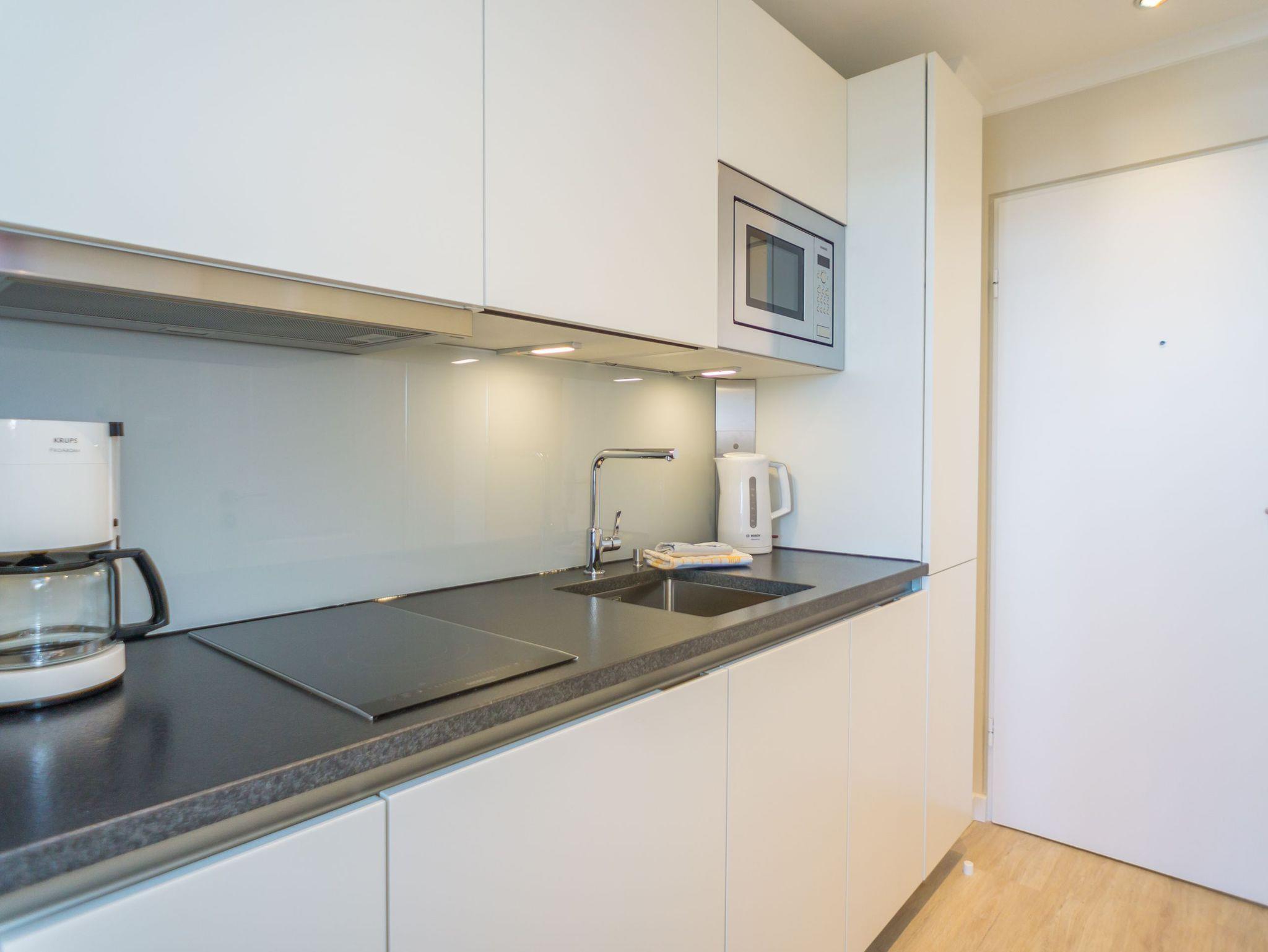 Die helle Küchenzeile hat einen 2-Plattenherd, einen Geschirrspüler, eine Nespresso-Maschine, eine Mikrowelle und einen Kühlschrank mit 3*-Gefrierfach.