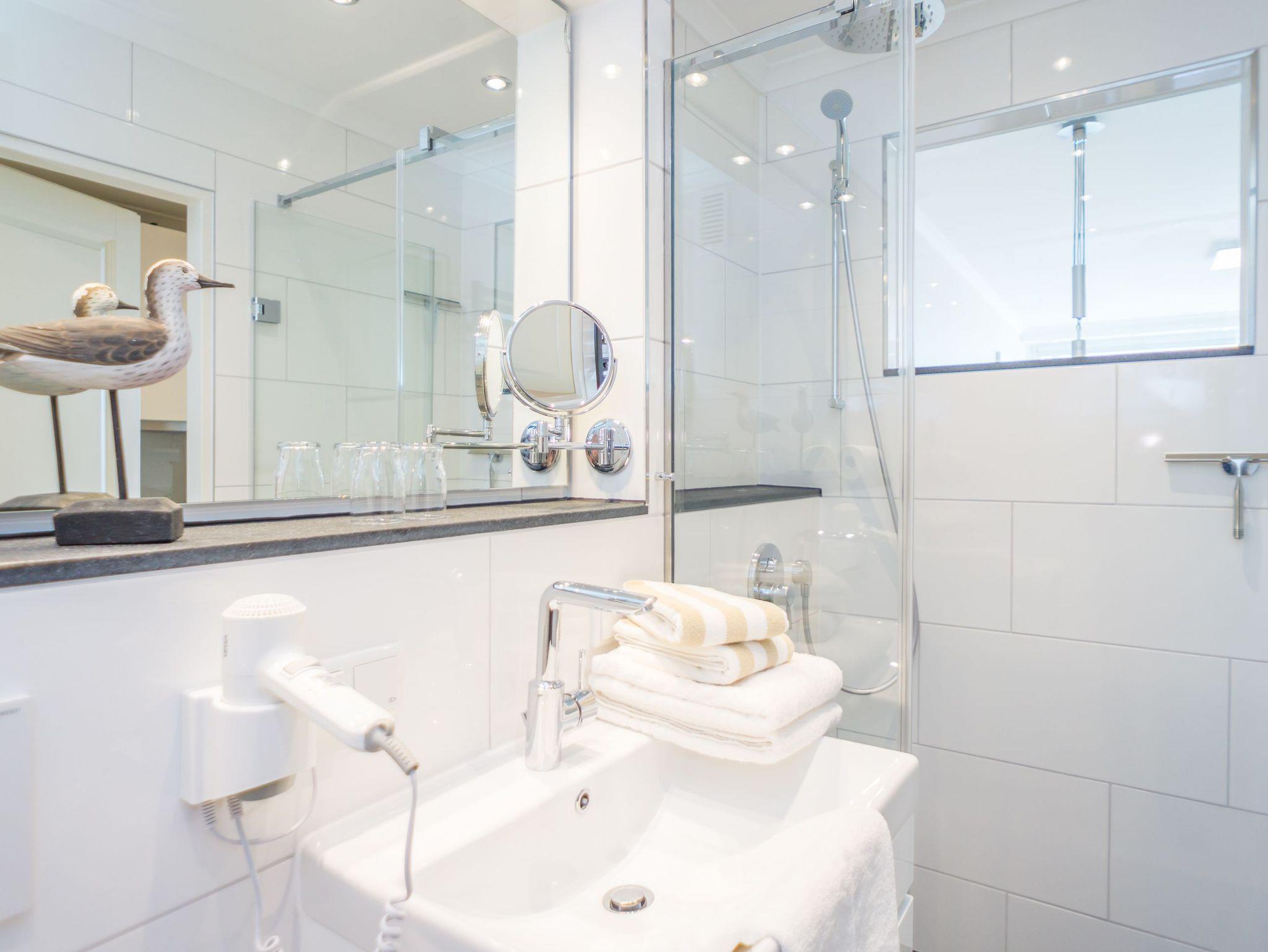 Das Badezimmer ist mit einer Dusche, einem Waschtisch, WC und Fön ausgestattet.