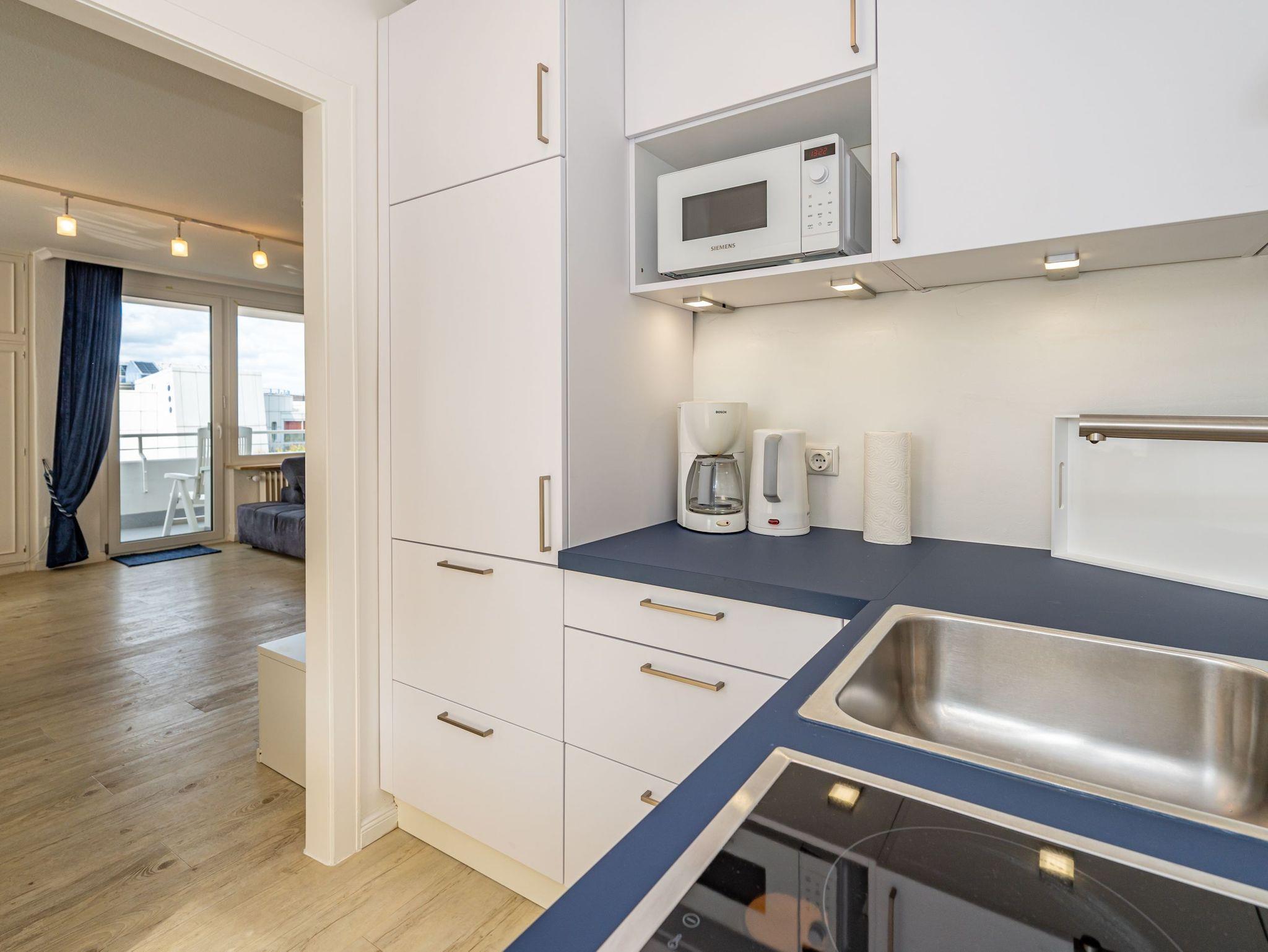 die separate Küche mit Geschirrspüler, Cerankochfeld, Mikrowelle und Austritt zum Südbalkon. Kaffeemaschine, Wasserkocher und Toaster gehören zur Grundausstattung.