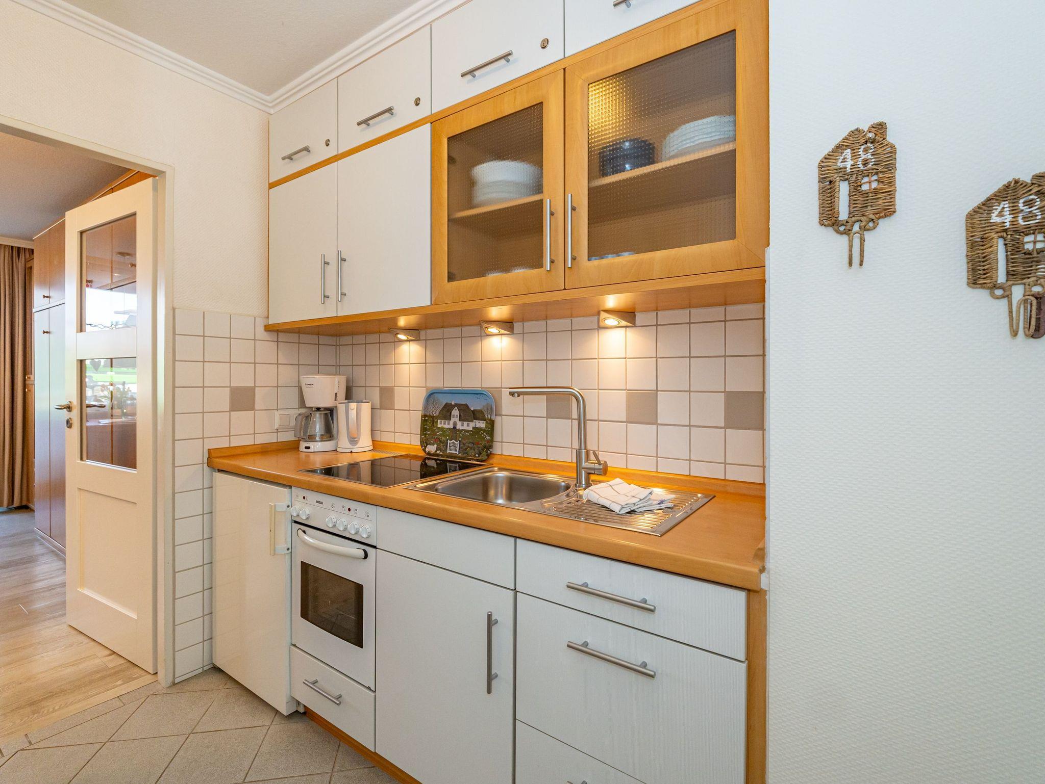 Die Küchenzeile hat einen Herd mit Backofen, Ceranfeld mit 4 Kochstellen und einen Kühlschrank mit 3*-Gefrierfach. Kaffeemaschine, Wasserkocher und Toaster gehören zur Grundausstattung.