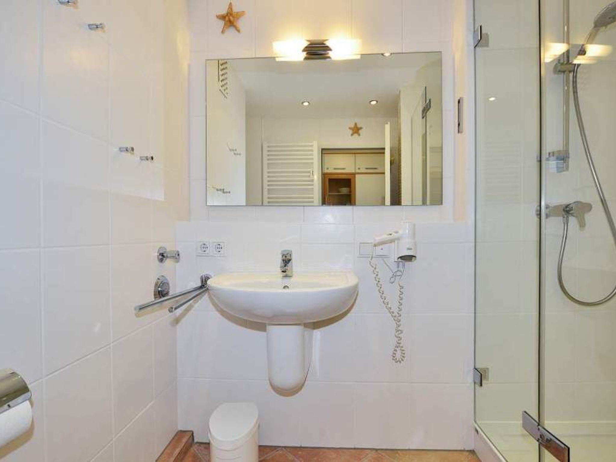 Im neuen Bad befinden sich eine Dusche, ein WC, ein Waschtisch, ein Handtuchtrockner und ein Fön.