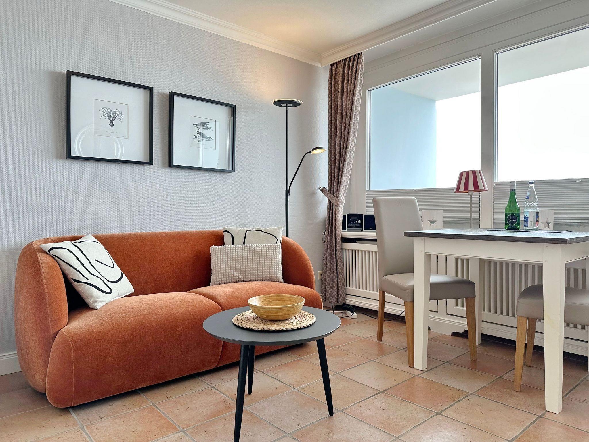 Modernes 1-Zimmer-Apartment mit freiem Meerblick und großem Westbalkon in Westerland auf Sylt.