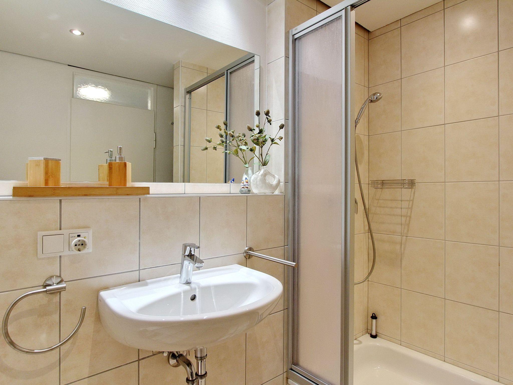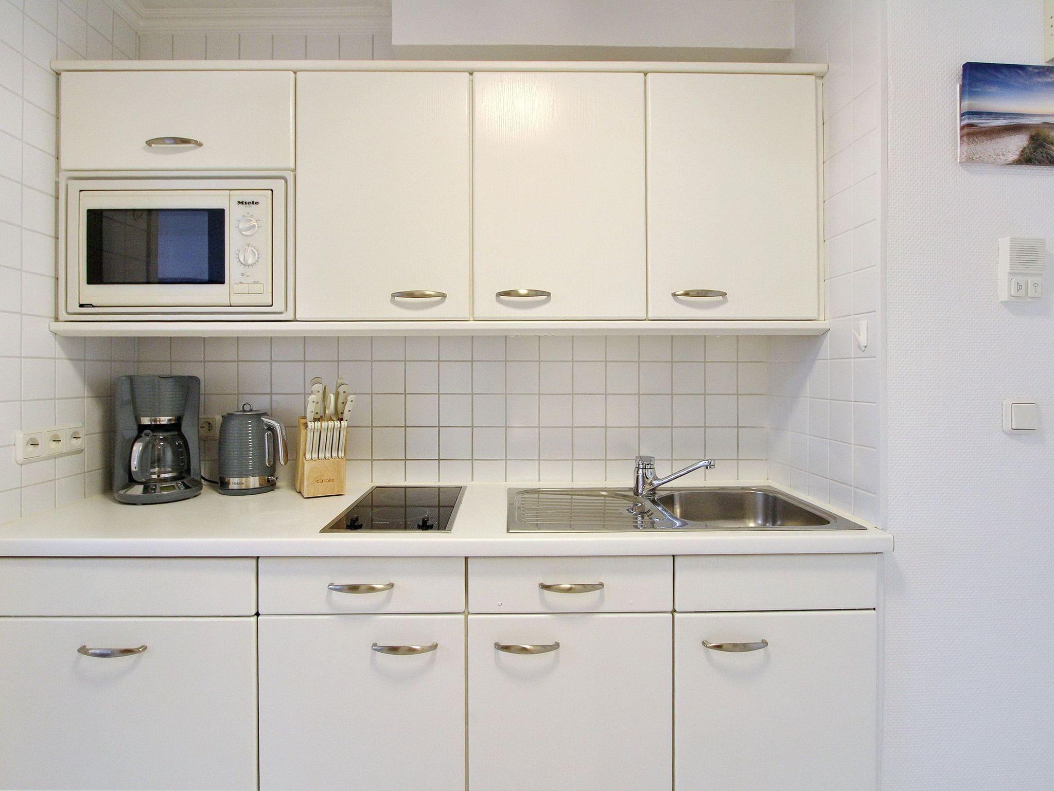 Im Flur befindet sich eine praktische Einbauküche mit Cerankochfeld und Mikrowelle ? ideal für die Selbstversorgung. Das zeitlose Badezimmer ist mit Dusche und Handtuchtrockner ausgestattet.
