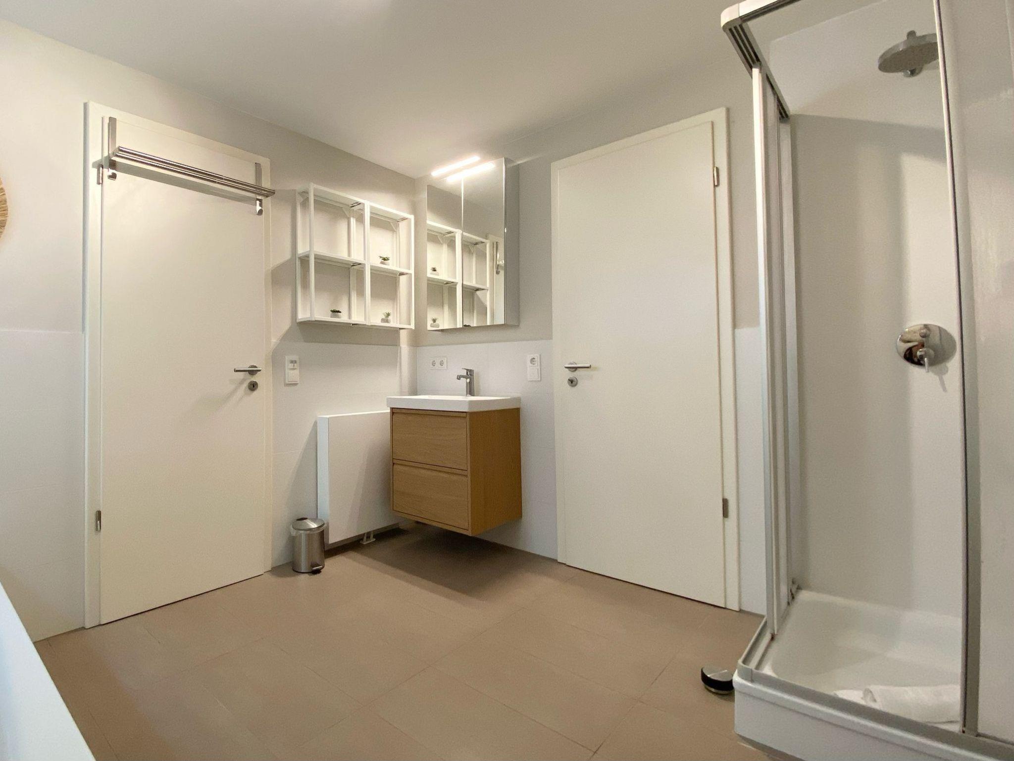 Ein weiteres, großzügigeres Bad im Untergeschoss mit Dusche, separater Badewanne und Föhn.