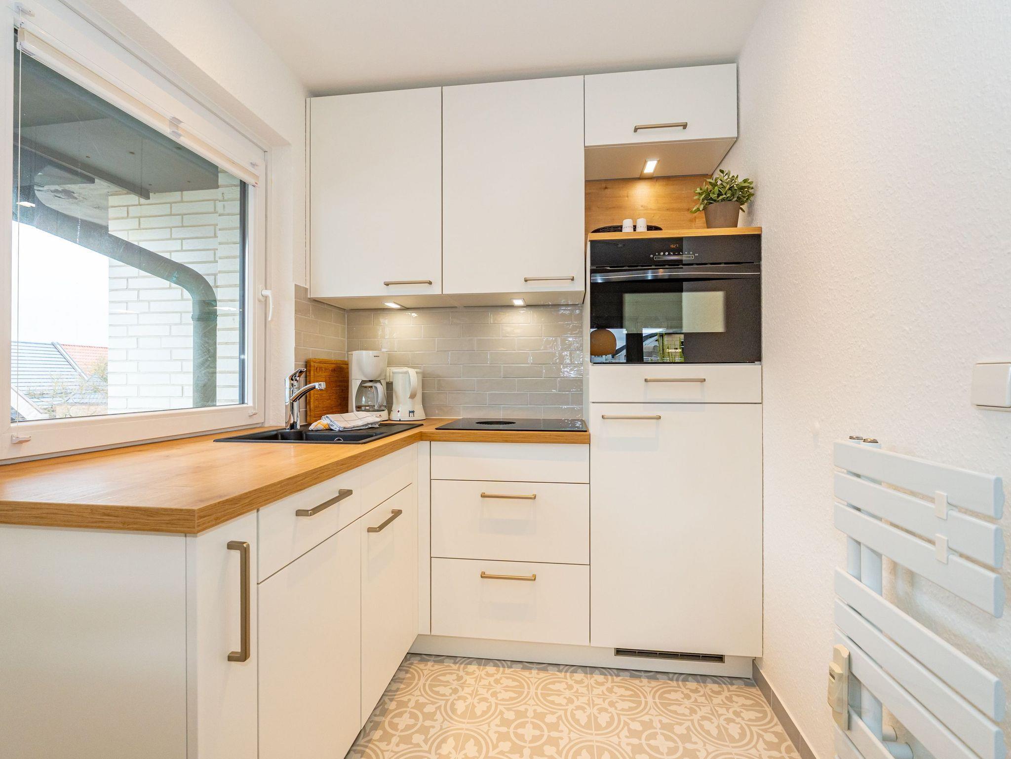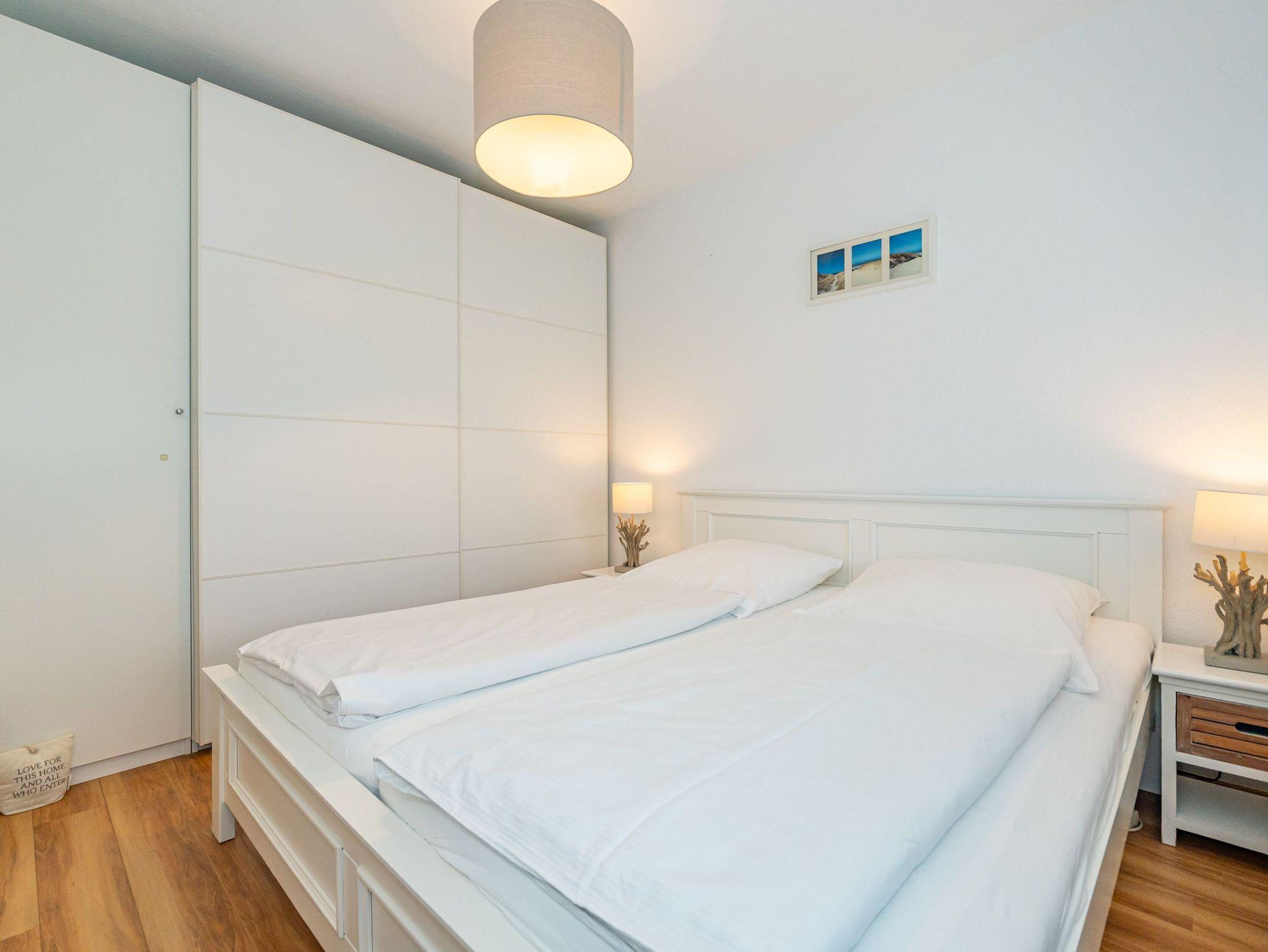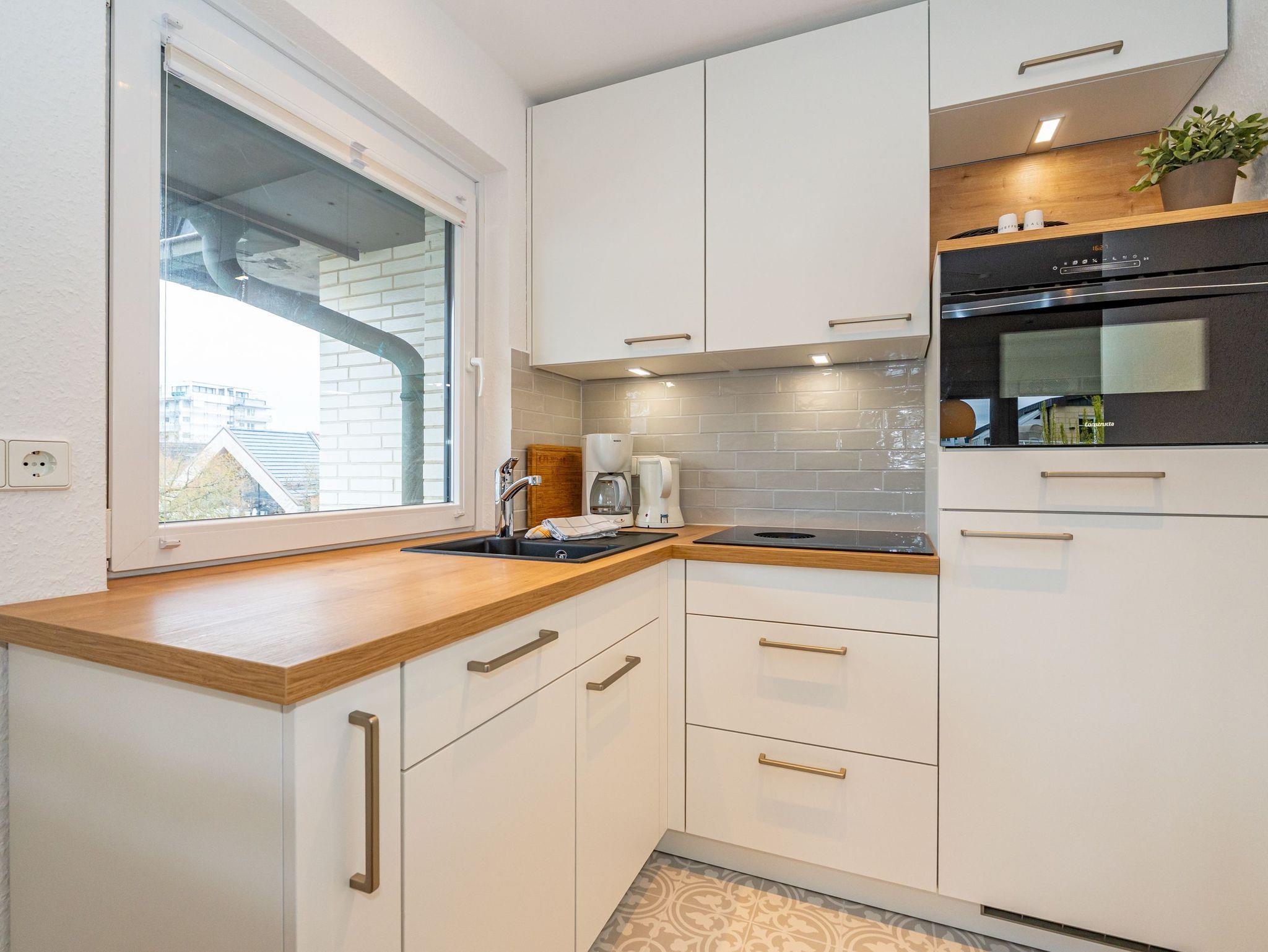 Das separate Schlafzimmer ist mit einem wertigen Doppelbett (1,80 x 2,00 m, Einzelmatratzen) und einem Kleiderschrank ausgestattet. Die neue, offen integrierte Küchenzeile bietet einen Induktionsherd mit integriertem Kochfeldabzug, Kompaktbackofen mit Mikrowelle, Geschirrspülmaschine und einen Kühlschrank mit 3-Sterne-Gefrierfach. Kaffeemaschine, Wasserkocher und Toaster gehören zur Grundausstattung. Das helle Duschbad ist ausgestattet mit Dusche, Waschtisch und WC funktional und gepflegt.