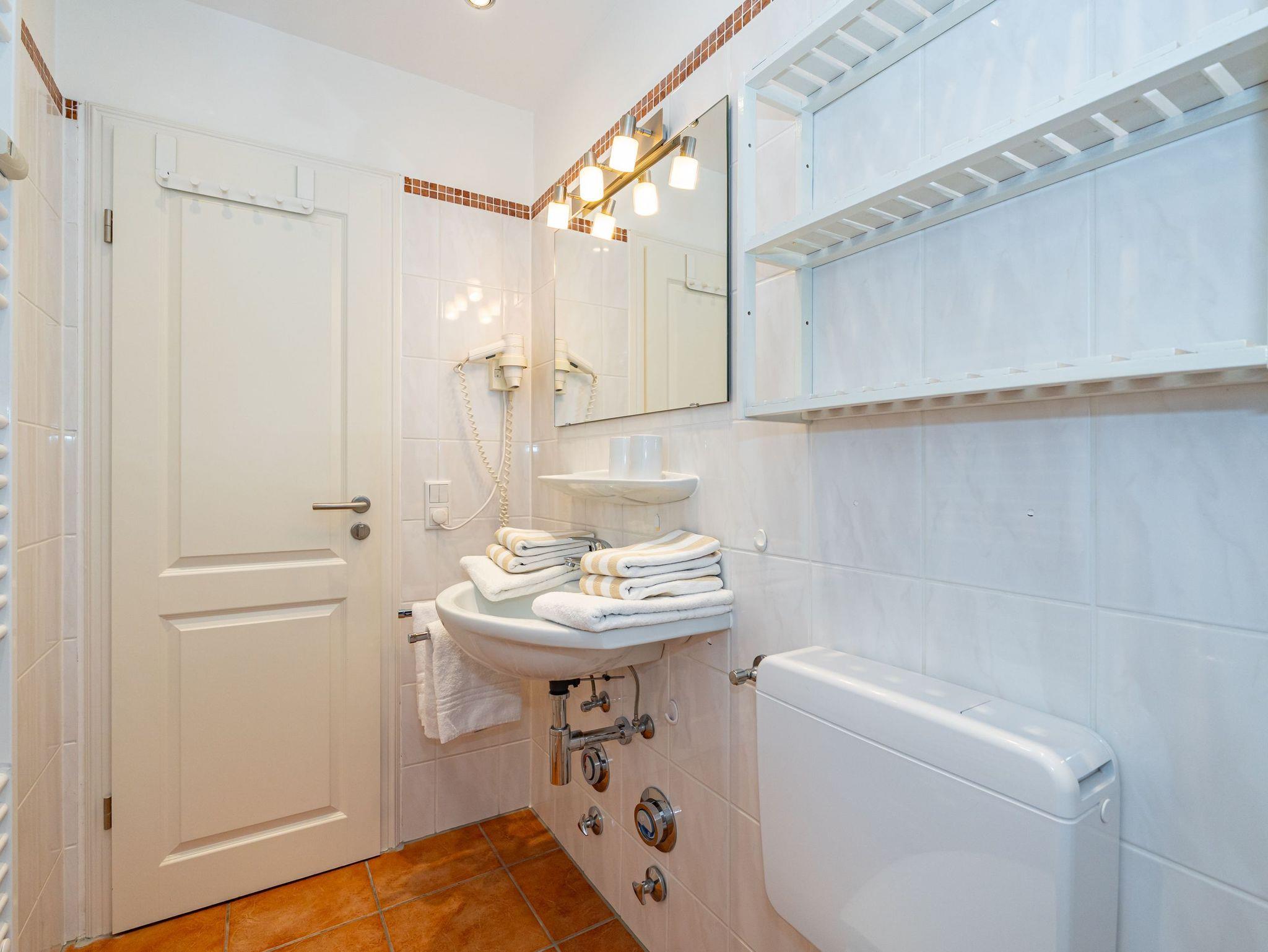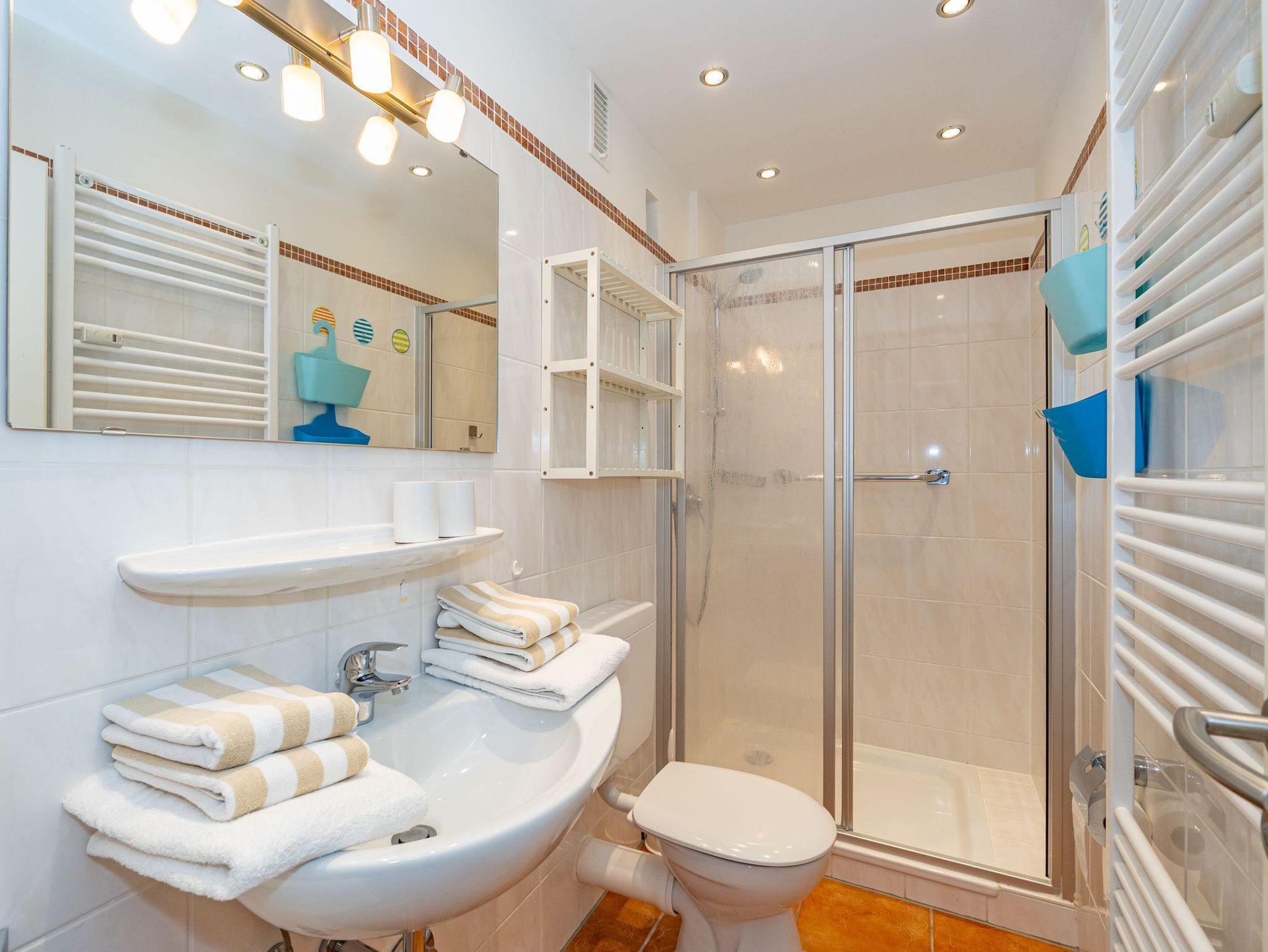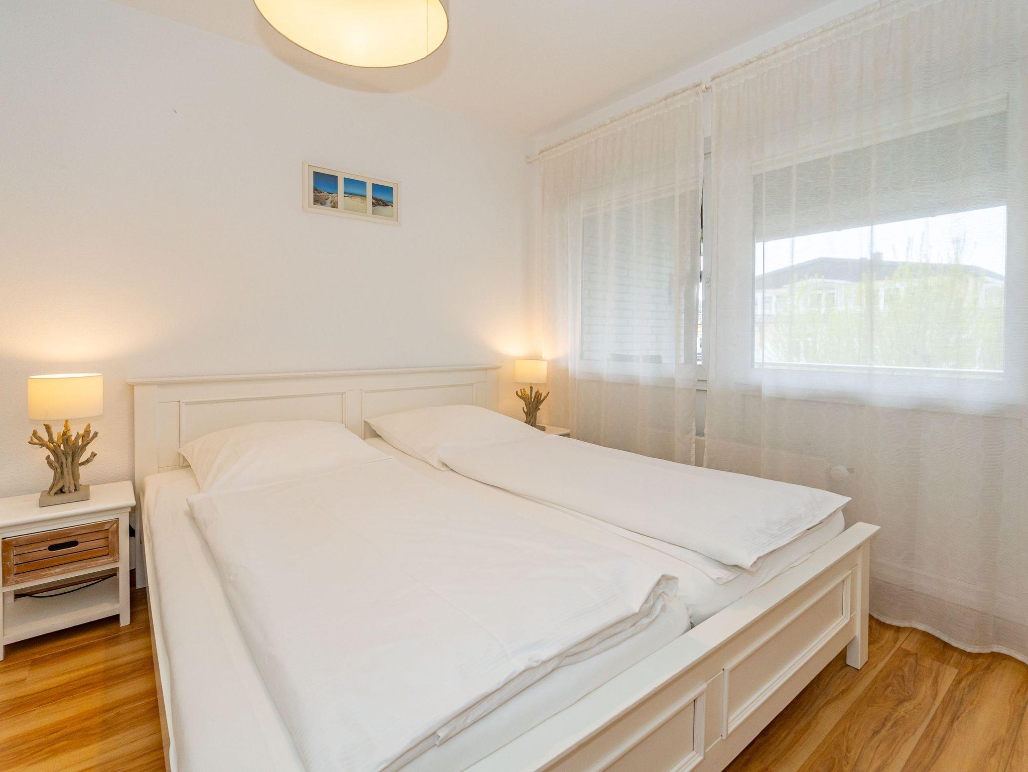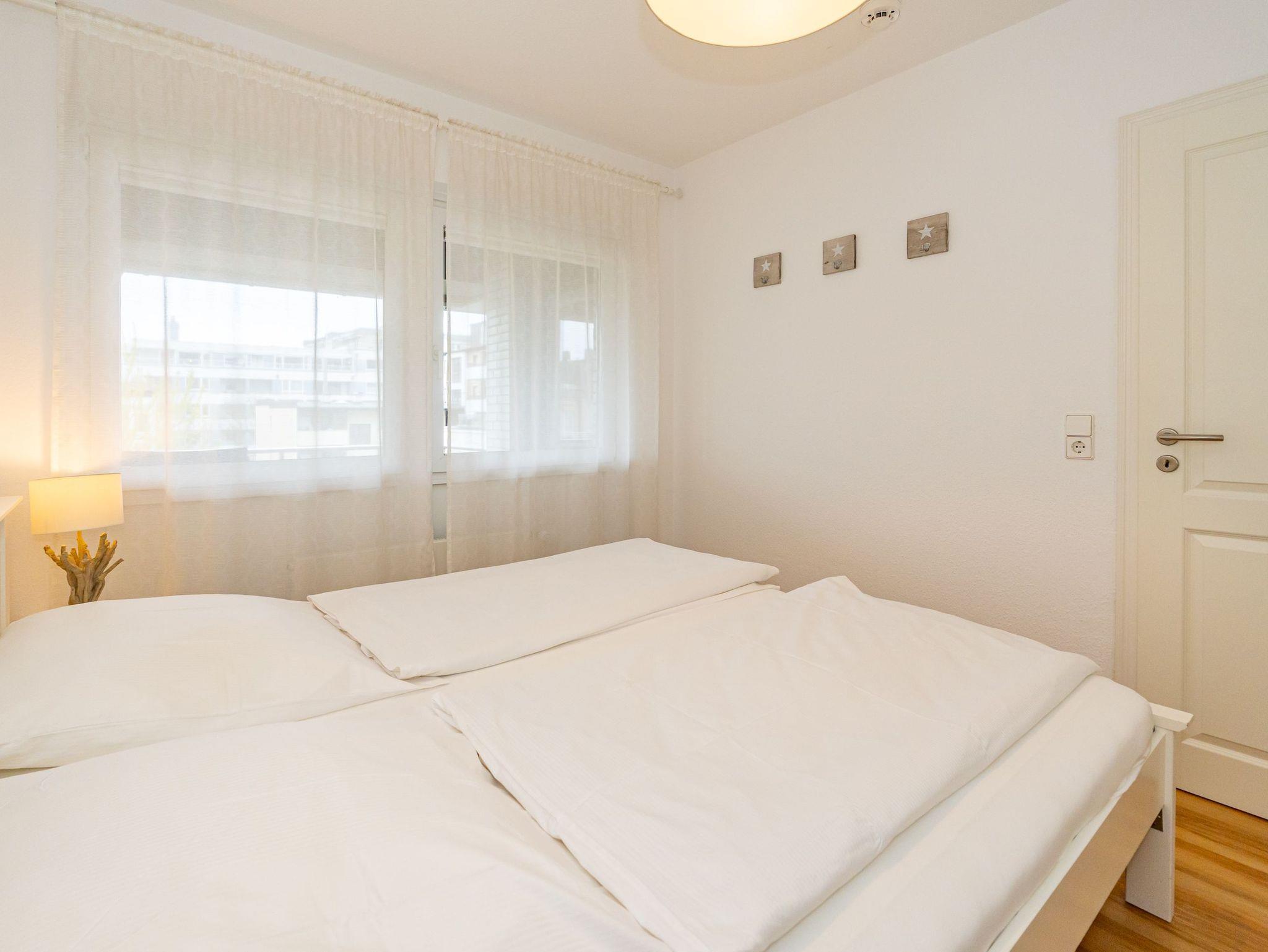 Das separate Schlafzimmer ist mit einem wertigen Doppelbett (1,80 x 2,00 m, Einzelmatratzen) und einem Kleiderschrank ausgestattet. Die neue, offen integrierte Küchenzeile bietet einen Induktionsherd mit integriertem Kochfeldabzug, Kompaktbackofen mit Mikrowelle, Geschirrspülmaschine und einen Kühlschrank mit 3-Sterne-Gefrierfach. Kaffeemaschine, Wasserkocher und Toaster gehören zur Grundausstattung. Das helle Duschbad ist ausgestattet mit Dusche, Waschtisch und WC funktional und gepflegt.