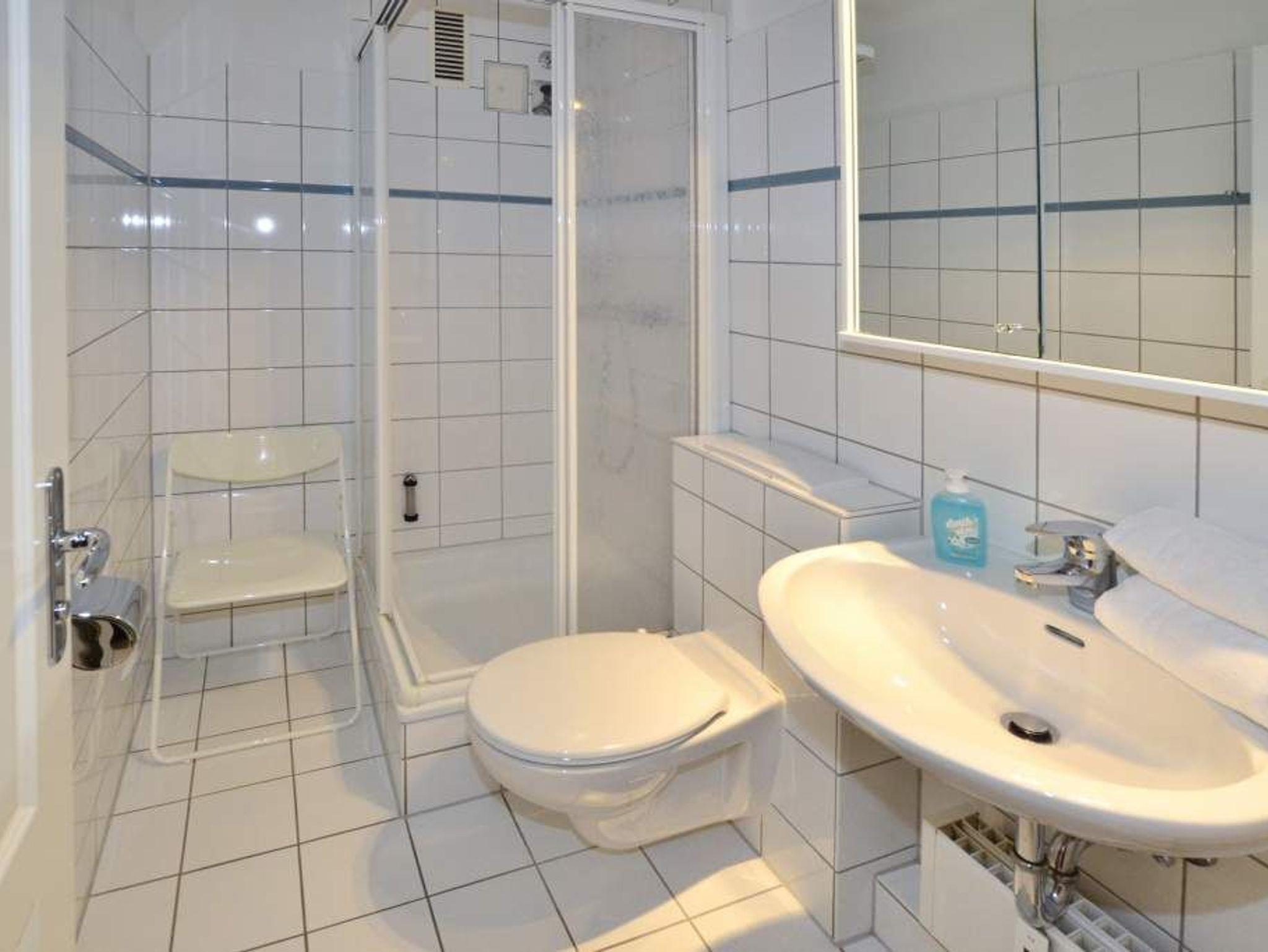 Im Bad befinden sich eine Dusche, ein WC und ein Waschtisch.
