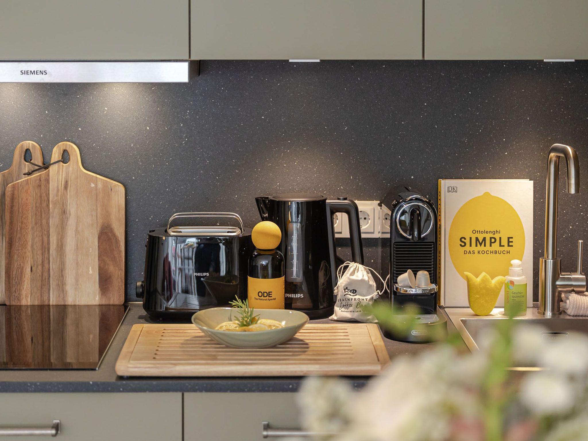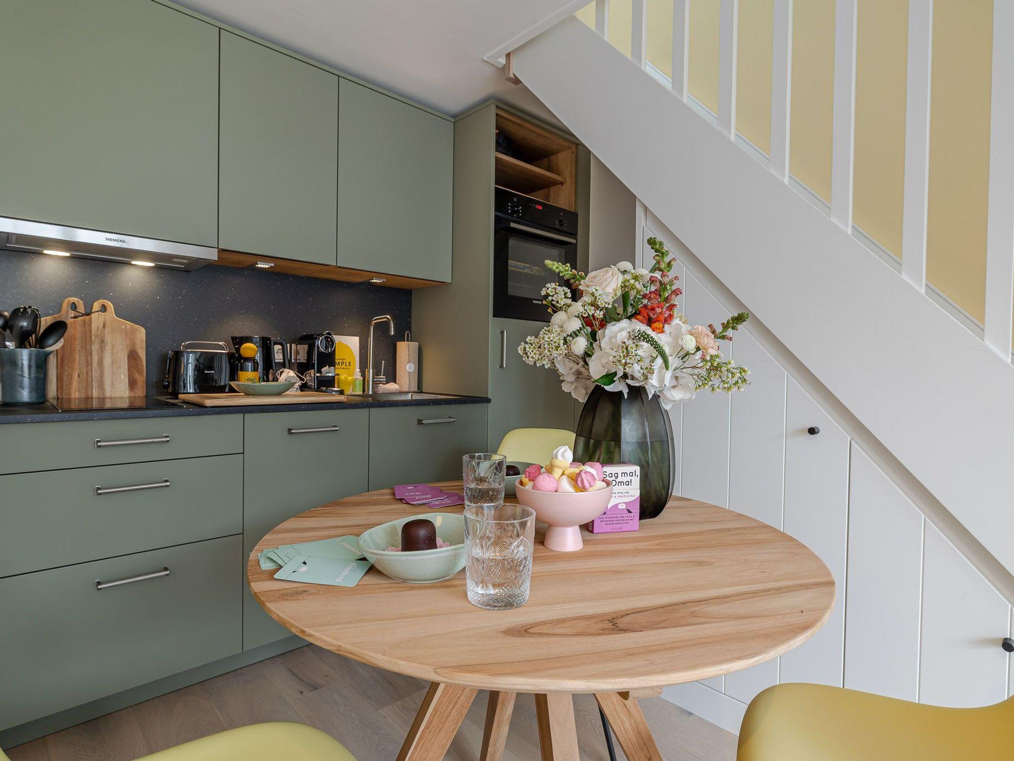 Links befindet sich Ihre hochwertig ausgestattete Küche, die sich dank des charmanten Designs harmonisch in den Raum integriert. Sie ist ausgestattet mit Top-Markengeräten, z.B.von Miele und allerlei wichtigen Utensilien, die man beim Zubereiten diverser Mahlzeiten braucht.
