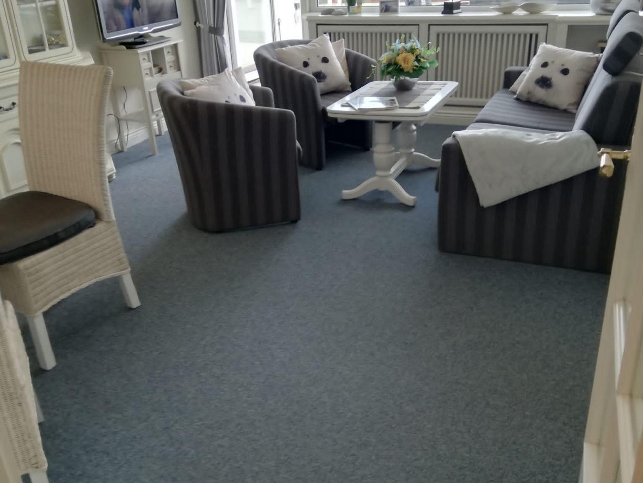 Der Wohnraum besteht aus einer hochwertigen Schlafsofa (Liegefläche 1,50 m x 1,95 und 2 Cocktail-Sesseln, separatem Essplatz, Kabel-TV (Bildschirmdiagonale ca. 94 cm), Radio und Telefon.