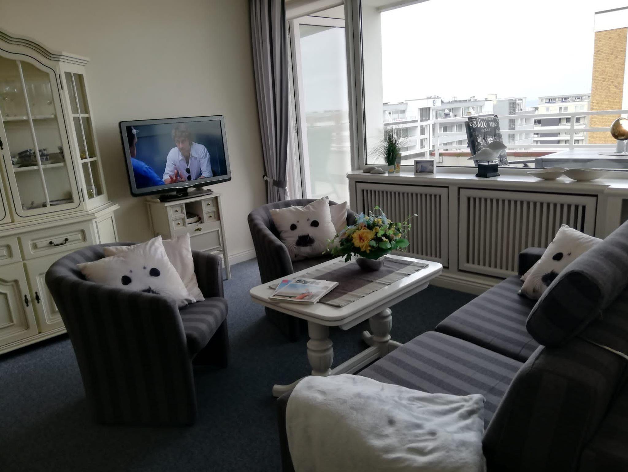 Gut ausgestattete 2-Zimmer-Nichtraucher-Ferienwohnung (ca. 58 qm) in der 5. Etage mit großem Nord-Balkon (mit Balkonmöbeln und Auflagen) mit weiter Sicht von Ost nach West inklusive eigenem Tiefgaragenstellplatz.