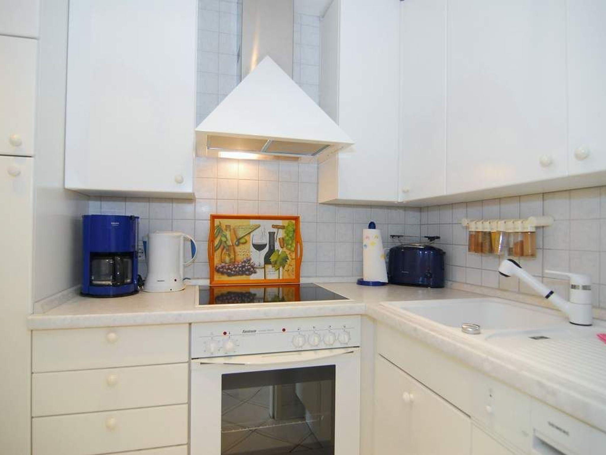1-Zimmer-Ferienwohnung im 3. OG vom Haus Metropol, 38m², Landseite, Nichtraucher-Whg. Wohn-/ Schlafraum mit Doppelbett (160cm x 200cm), Eßtisch am Fenster, Couch, Kabel-TV, W-Lan (ohne Gewähr). Ost-Balkon, separate Küche mit Backofen und Geschirrspüler, Duschbad/WC. Das Apartment ist gefliest. Tierhaltung ist nicht gestattet. Bettwäsche und Handtücher sind zur Anreise aufgezogen. Ein PKW-Stellplatz kann kostenpflichtig zugebucht werden.