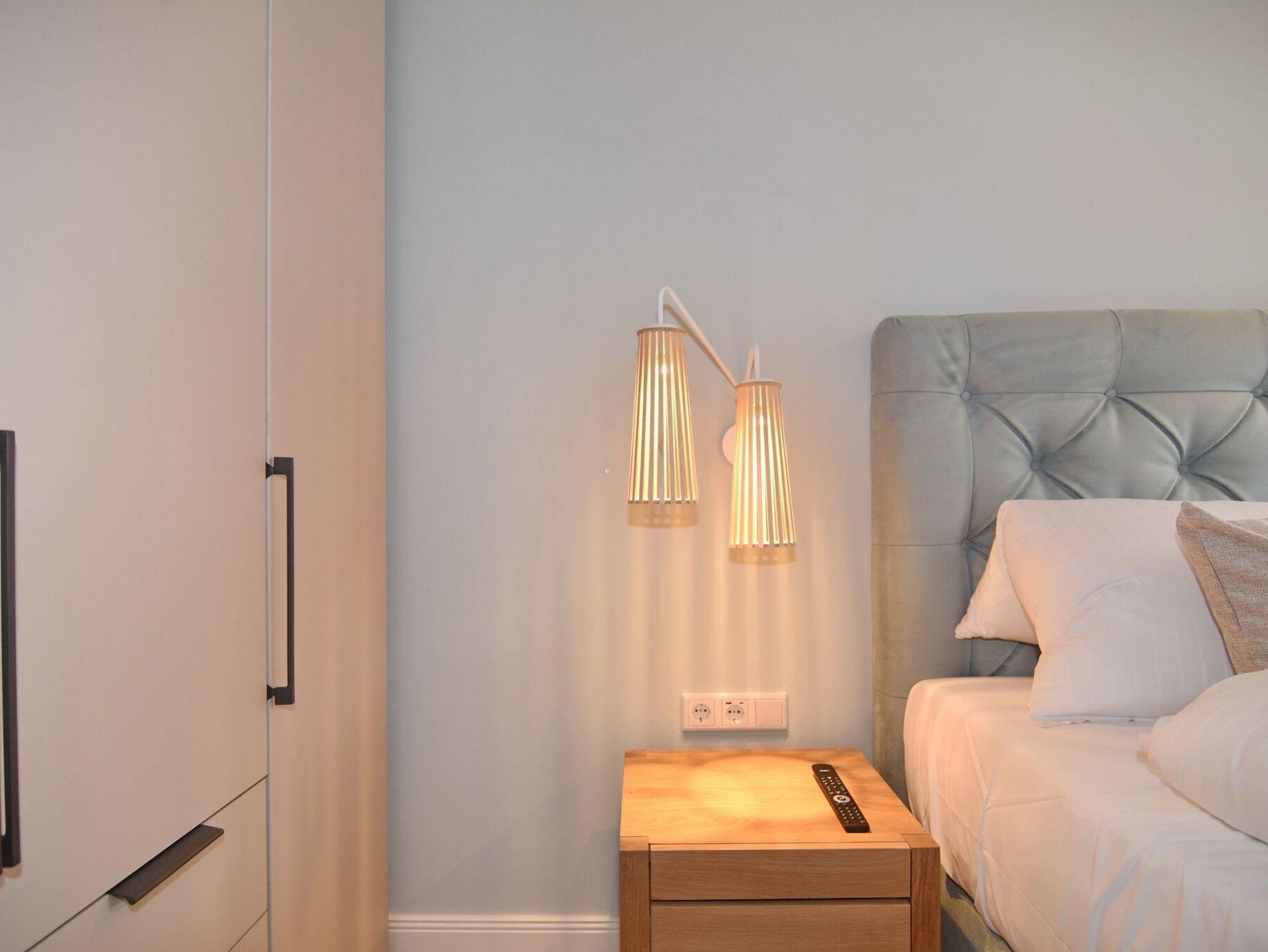 Die hochwertige 2-Zimmer-Wohnung im 2. OG mit ca. 59 qm ist für maximal 2 Personen ausgestattet. Vom Flur mit Garderobe gelangen Sie in das Wohnzimmer mit offener Küche und möbliertem Ostbalkon. Die hochwertige Küche bietet neben Induktionsherd auch Geschirrspüler, Kühlschrank mit Gefrierfach und Backofen mit integrierter Mikrowelle. Die Wohnung bietet Ihnen ein Schlafzimmer und ein Duschbad /WC mit Haar- und Handtuchtrockner. Das Schlafzimmer ist mit einem Boxspringbett (180x200) der Marke FBF, Flat-TV und Einbauschrank ausgestattet. Bis auf das Schlafzimmer sind die Räume mit großformatigen Fliesen versehen.
