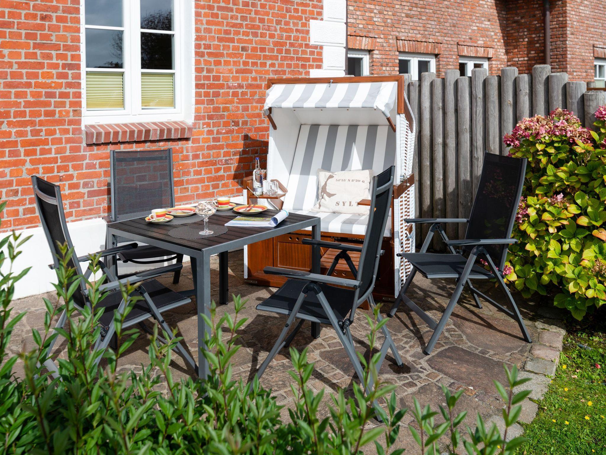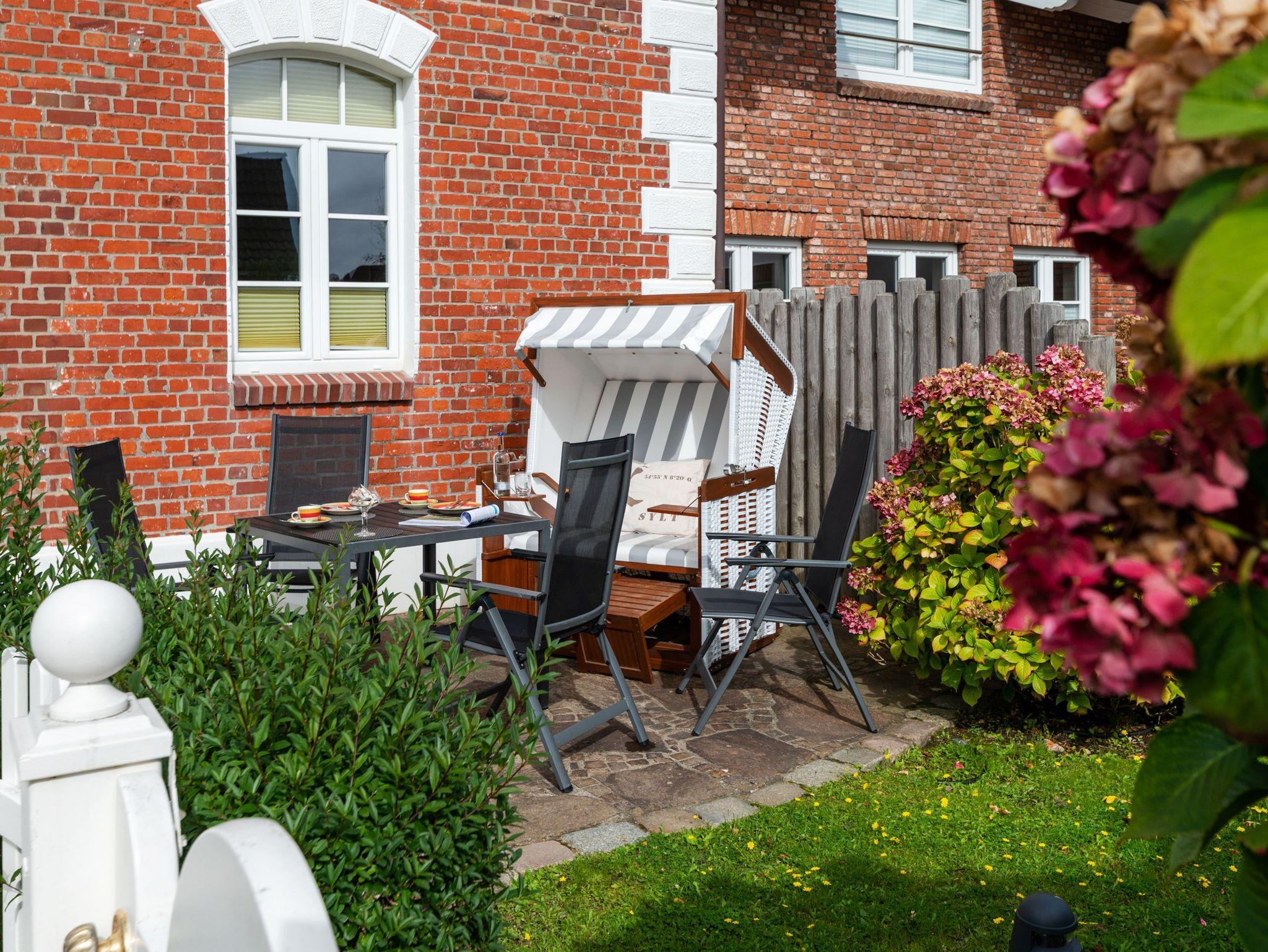 Die nach Süden ausgerichtete Sonnenterrasse bietet einen Saison-Strandkorb (ca. vom 01. April bis 15. Oktober) und Gartenmöbel mit Auflagen. Die Terrasse ist ausschließlich über den Hauseingang erreichbar.
