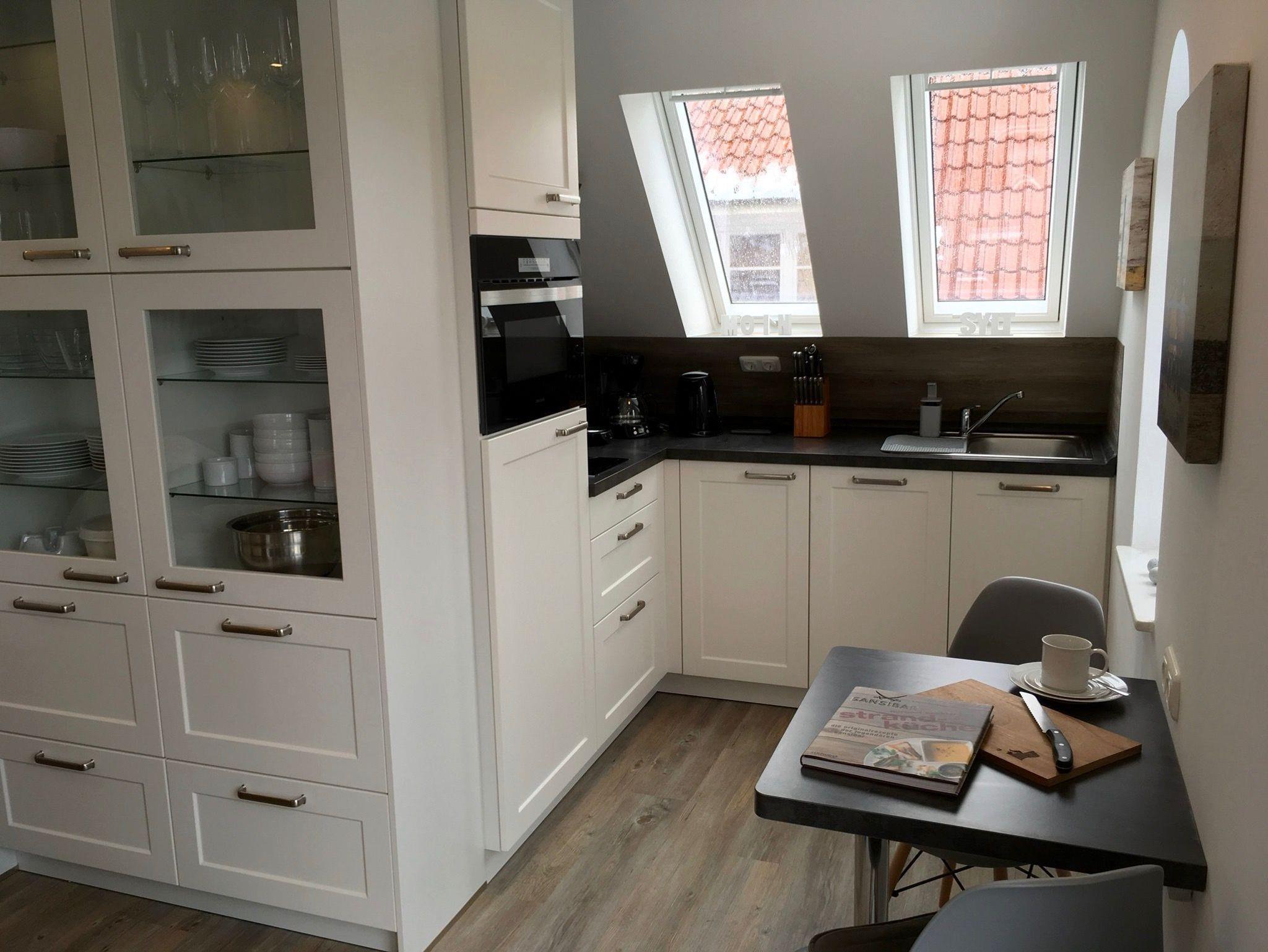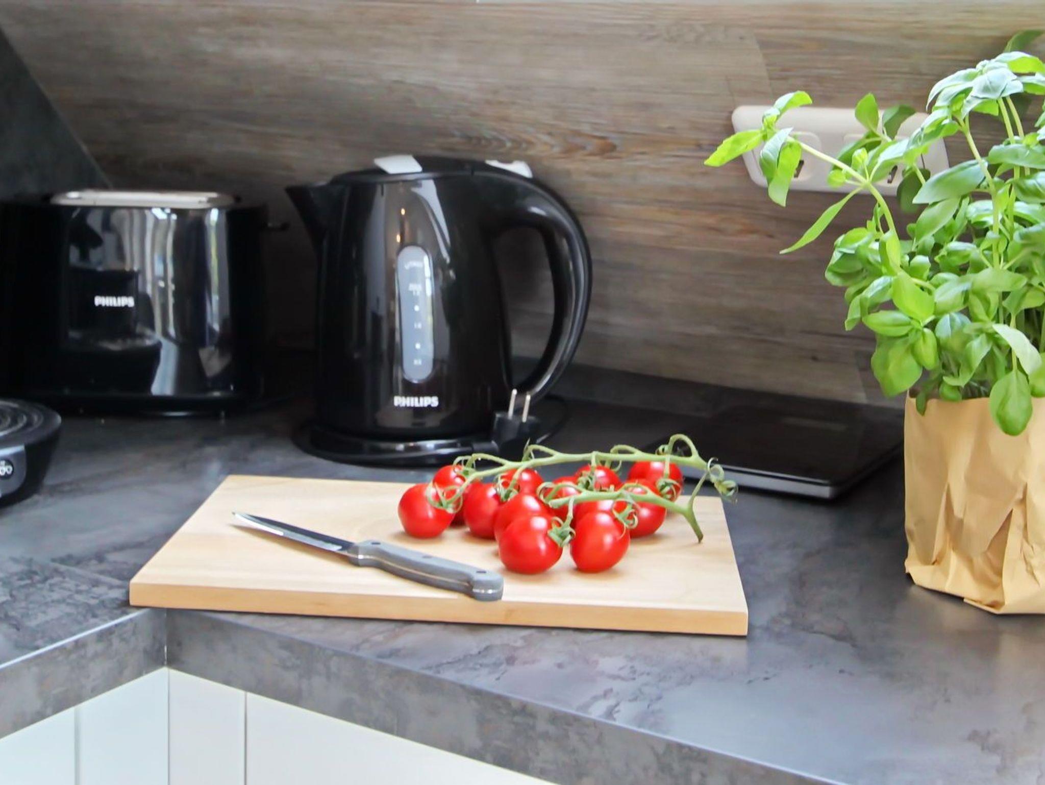 Küchenausstattung: zweier Induktionskochfeld, sowie eine weitere zweier Induktionskochplatte, Backofen mit Mikrowelle, entsprechendes Koch- Back- und Mikrowellenzubehör, Senseopad-und Kaffeemaschine, Handmixer, Pürierstab, Toaster, Raclette, Waffeleisen und Wasserkocher, Spülmaschine und Kühlschrank mit Gefrierfach.