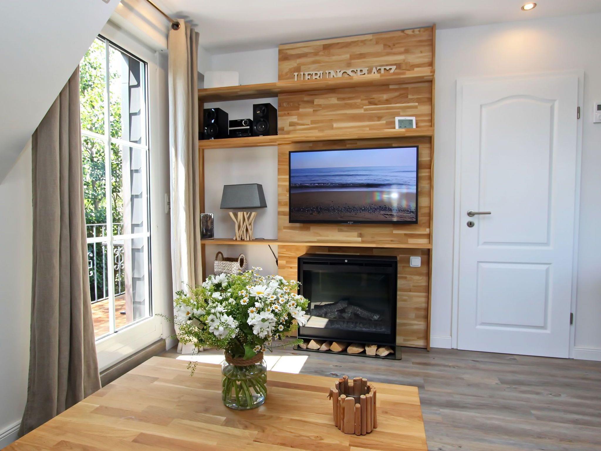 Falls das Wetter mal rau und stürmisch ist, kann man es sich vor dem Flammenspiel des elektrischen Kaminofens besonders gemütlich machen.