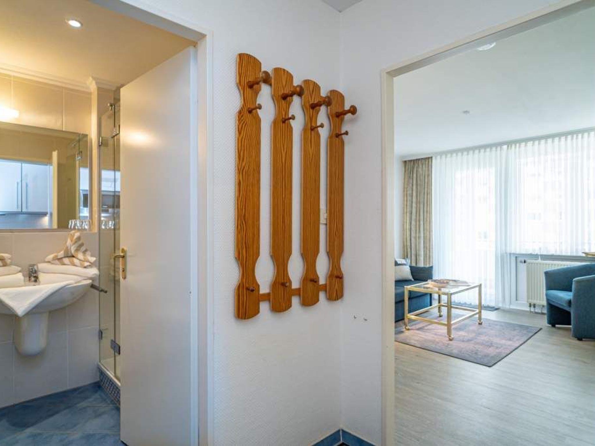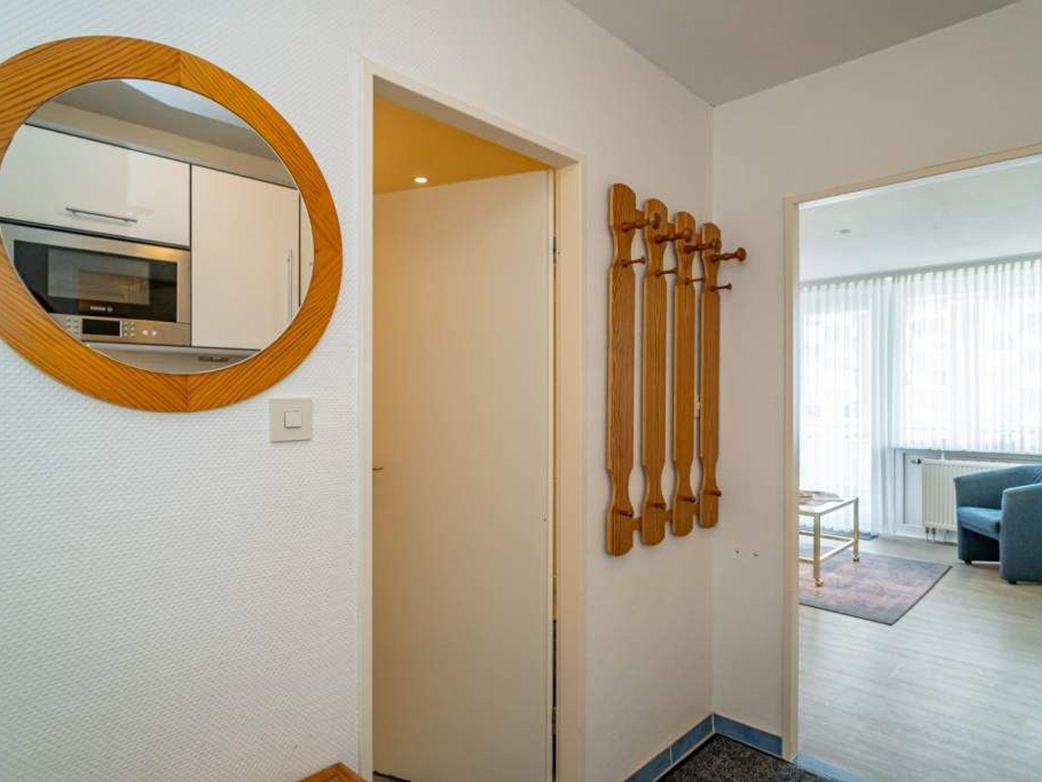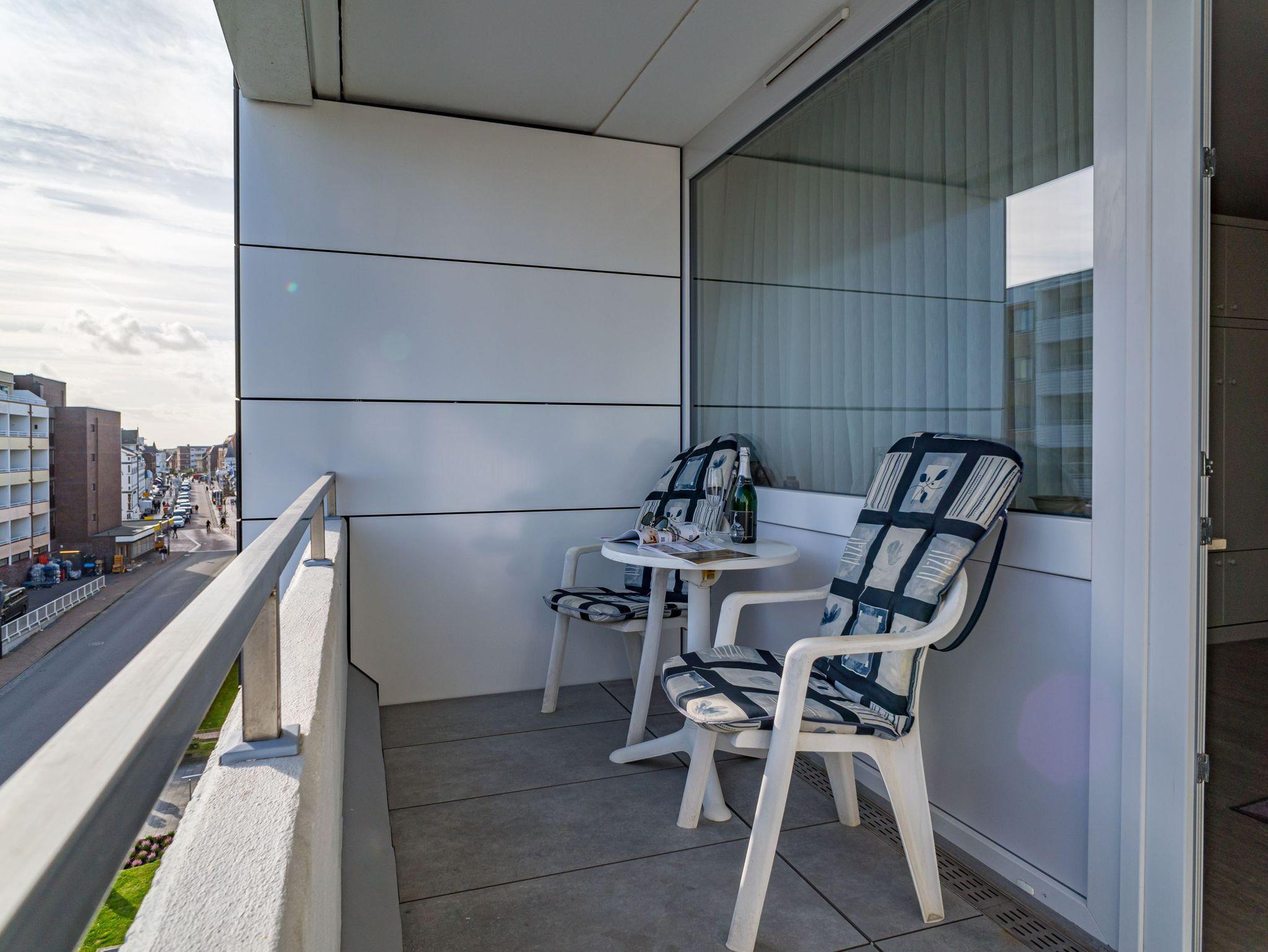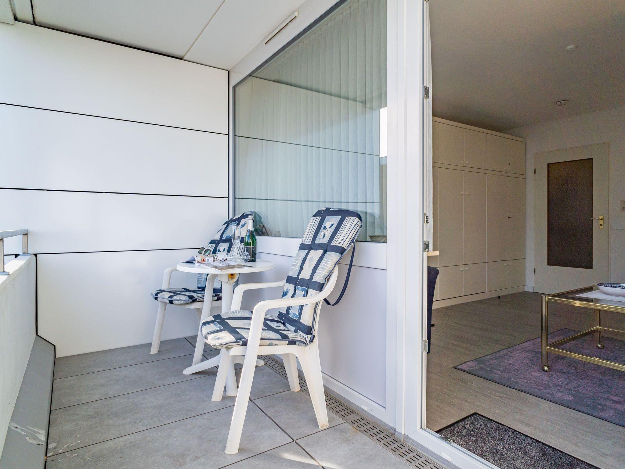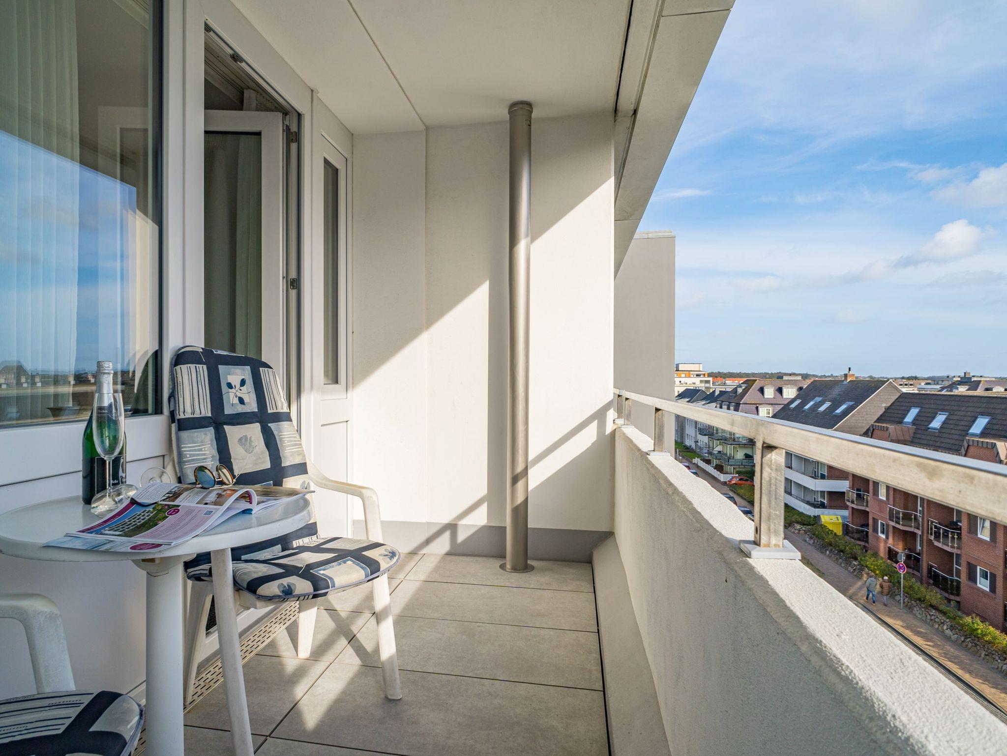 1-Zimmer-Nichtraucher-Ferienwohnung (ca. 28 m²) in der 4. Etage zur Landseite mit Ostloggia (Morgensonne, mit Balkonmöbeln und Auflagen) für max. 2 Personen.