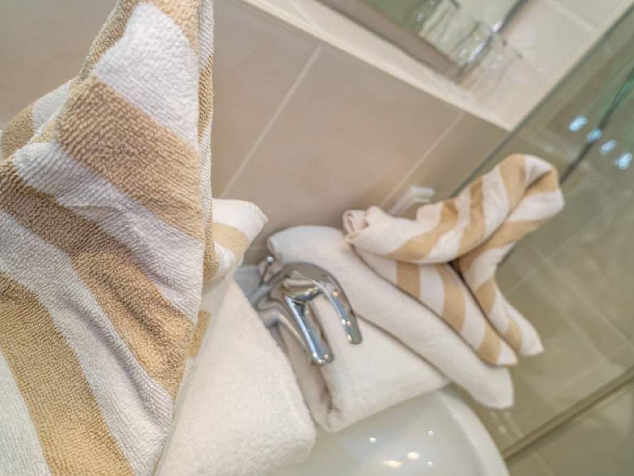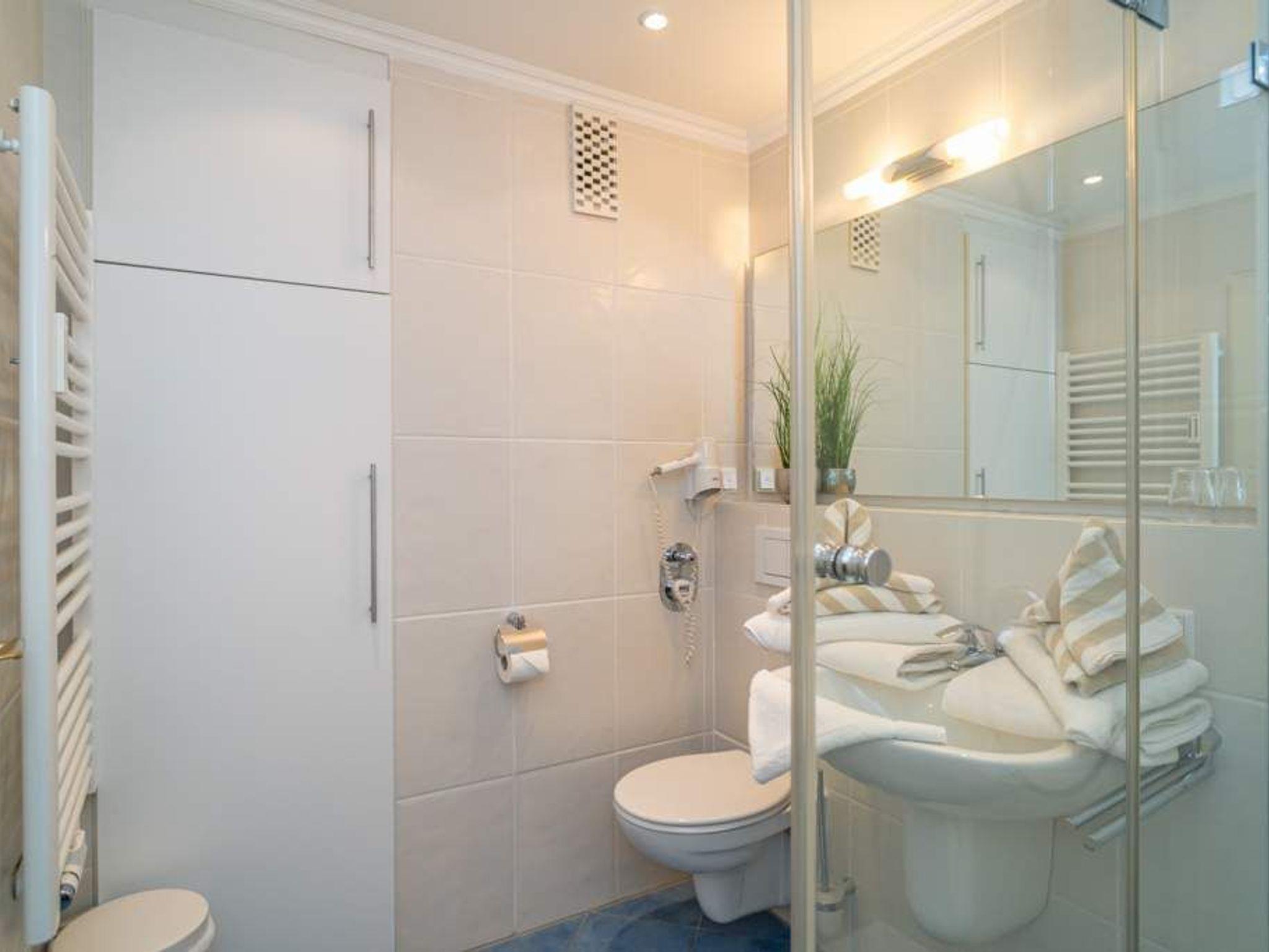 Im neuen Bad befinden sich eine Dusche, ein WC, ein Waschtisch und ein Handtuchtrockner.
