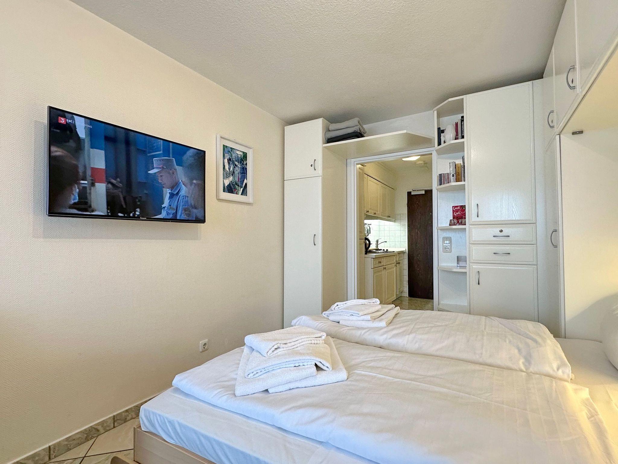 Hübsche 1-Zimmer-Ferienwohnung im 5.OG des Haus am Meer. Ca. 25 qm. Nichtraucher-App.! Helles Wohn-/Schlafzimmer mit Doppelschrankbett (2x90x200), Eßplatz am Fenster, 2 Sessel, Flachbild-TV, Radio, Westbalkon mit Balkonmöbeln und freiem Meeresblick, moderne Küchenzeile mit Mikrowelle im Flurbereich, Duschbad/WC. W-LAN (ohne Gewähr). Das App. ist komplett gefliest. Bettwäsche und Handtücher sind zur Anreise aufgezogen. Ein PKW-Stellplatz kann kostenpflichtig zugebucht werden. Tierhaltung ist nicht gestattet. Beginnend vom 15.10.2025 bis 5.4.2026 (Ostern) findet die Fassandensanierung der Landseite (Osten) sowie des Südgiebels statt. Mit Baulärm ist in dieser Zeit zu rechnen.
