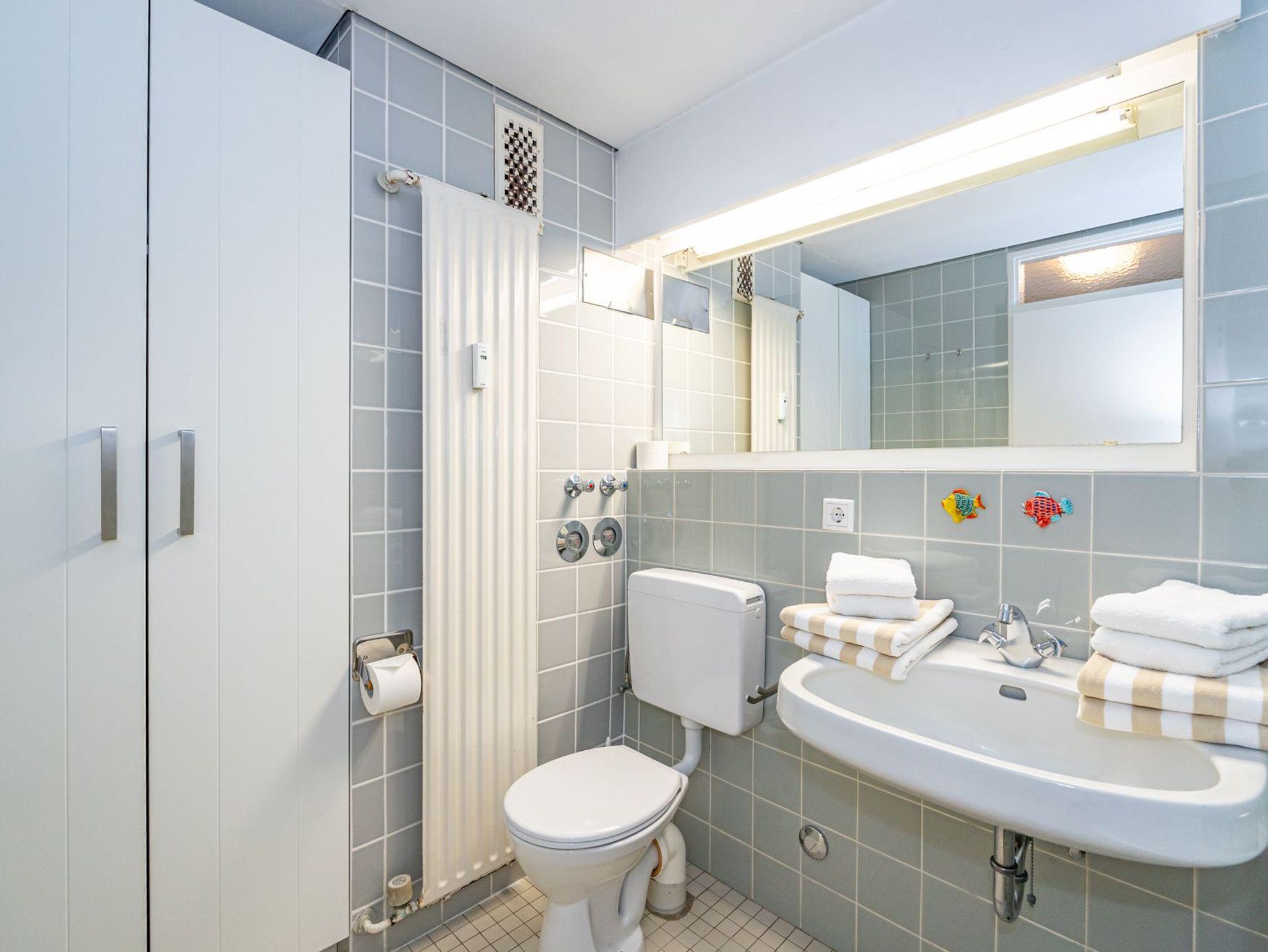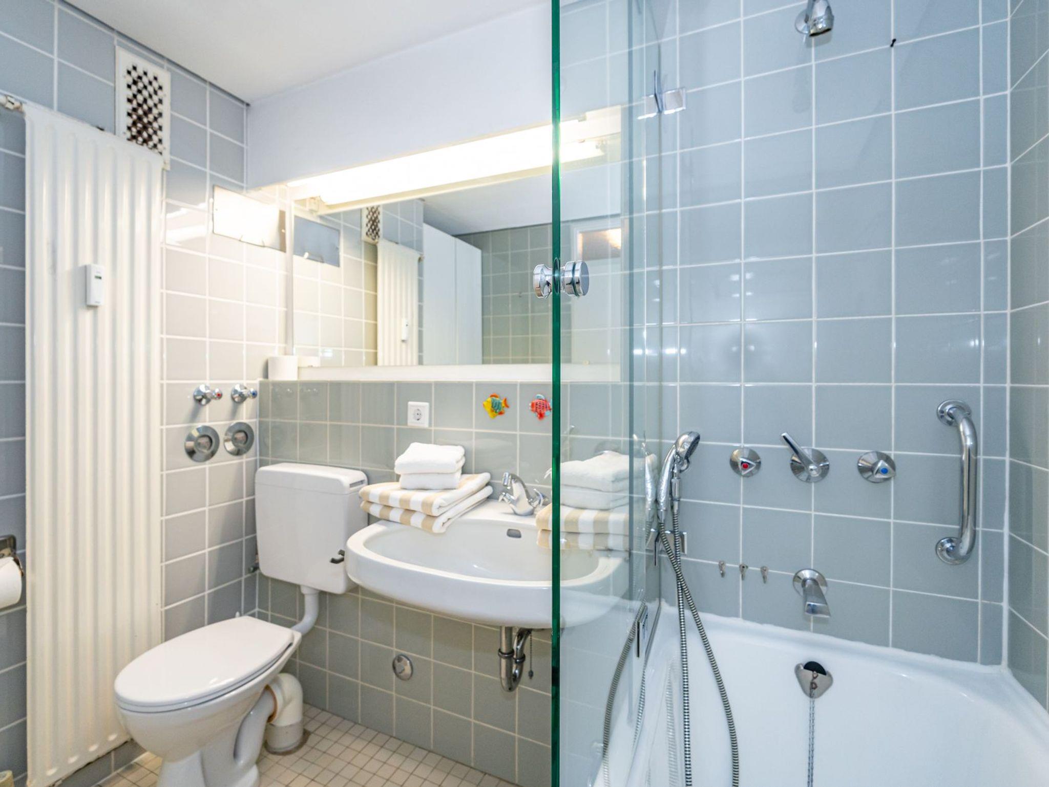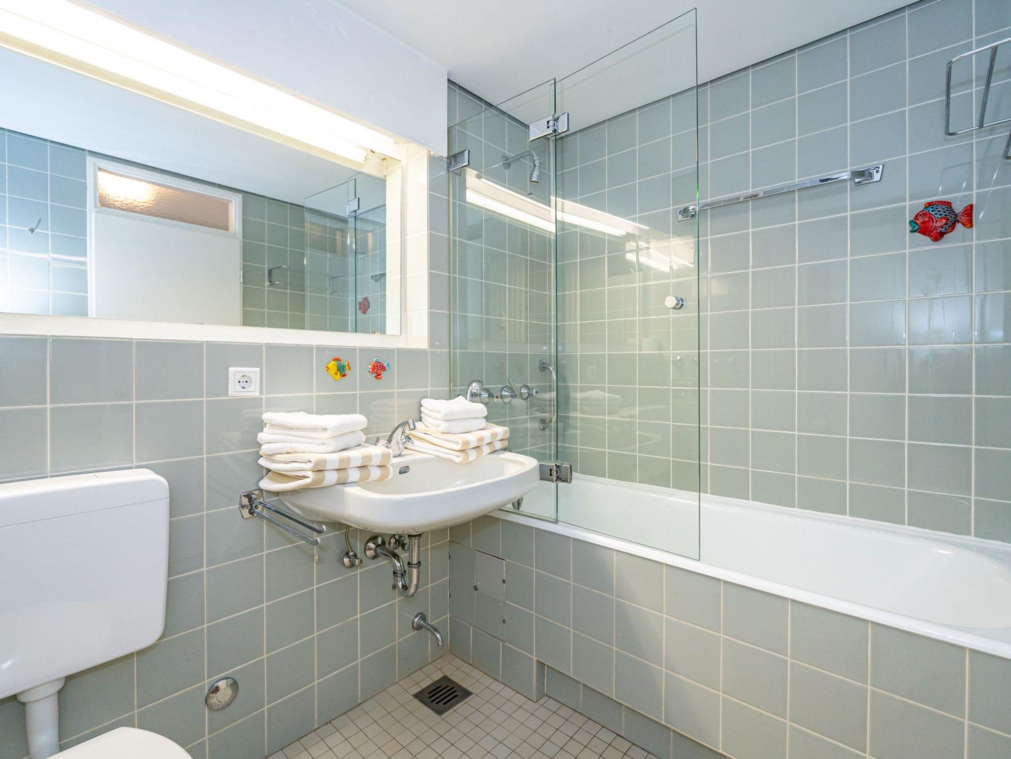 Im Bad befinden sich eine Badewanne, ein WC sowie ein Waschtisch.