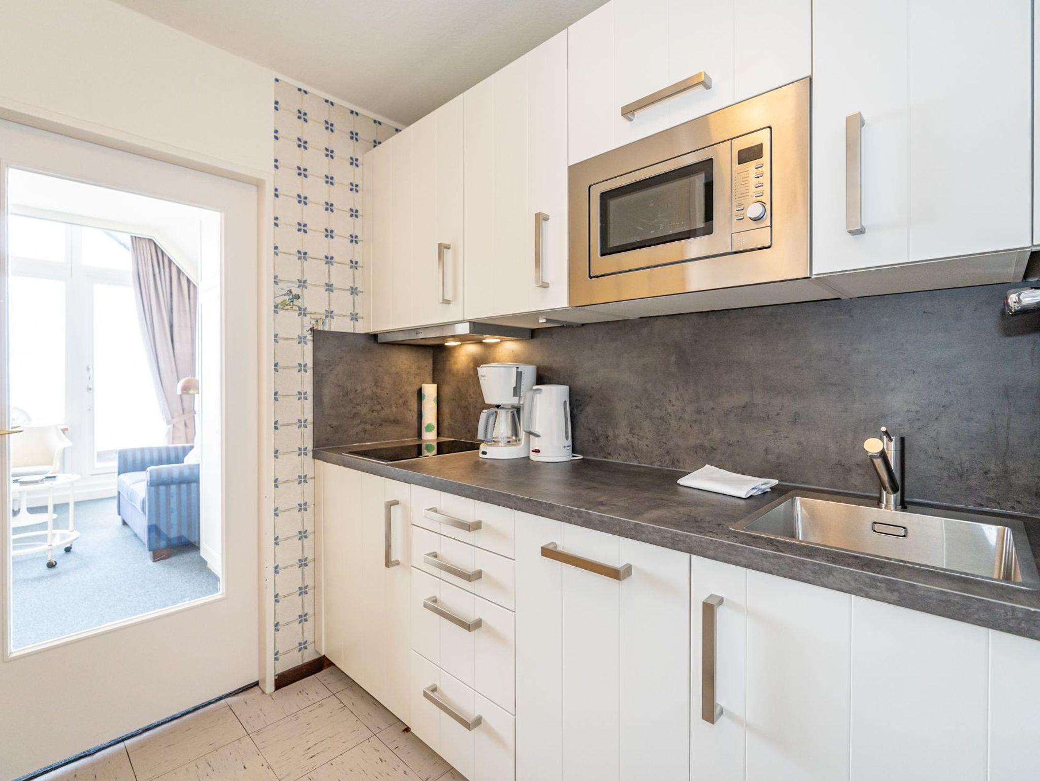 Die Küchenzeile verfügt über einen Herd mit zwei Kochfeldern, eine Mikrowelle, einen Kühlschrank, eine Spülmaschine sowie Kaffeemaschine, Wasserkocher und Toaster ? alles da für die kleine Selbstverpflegung zwischendurch.