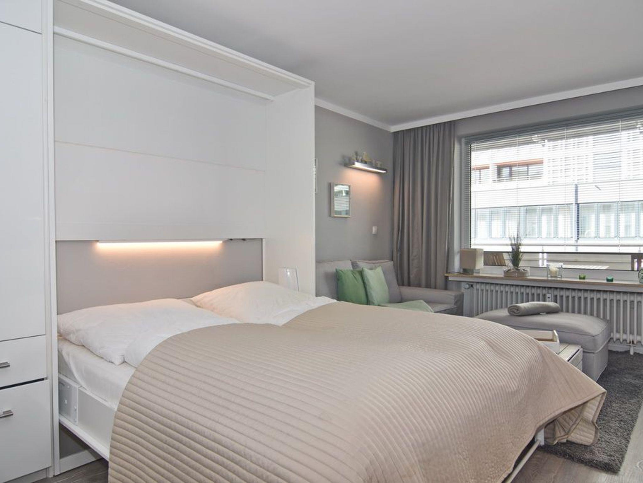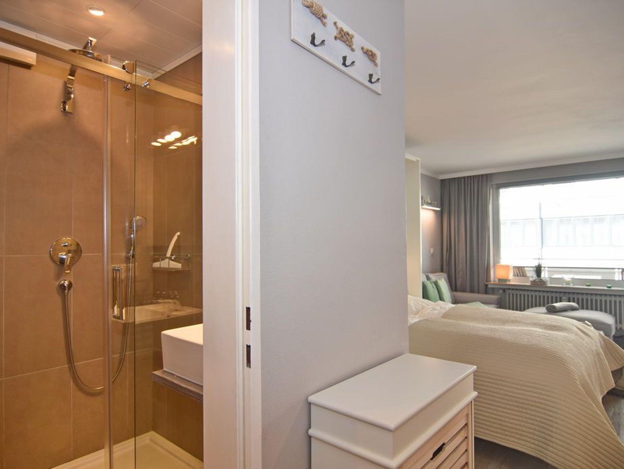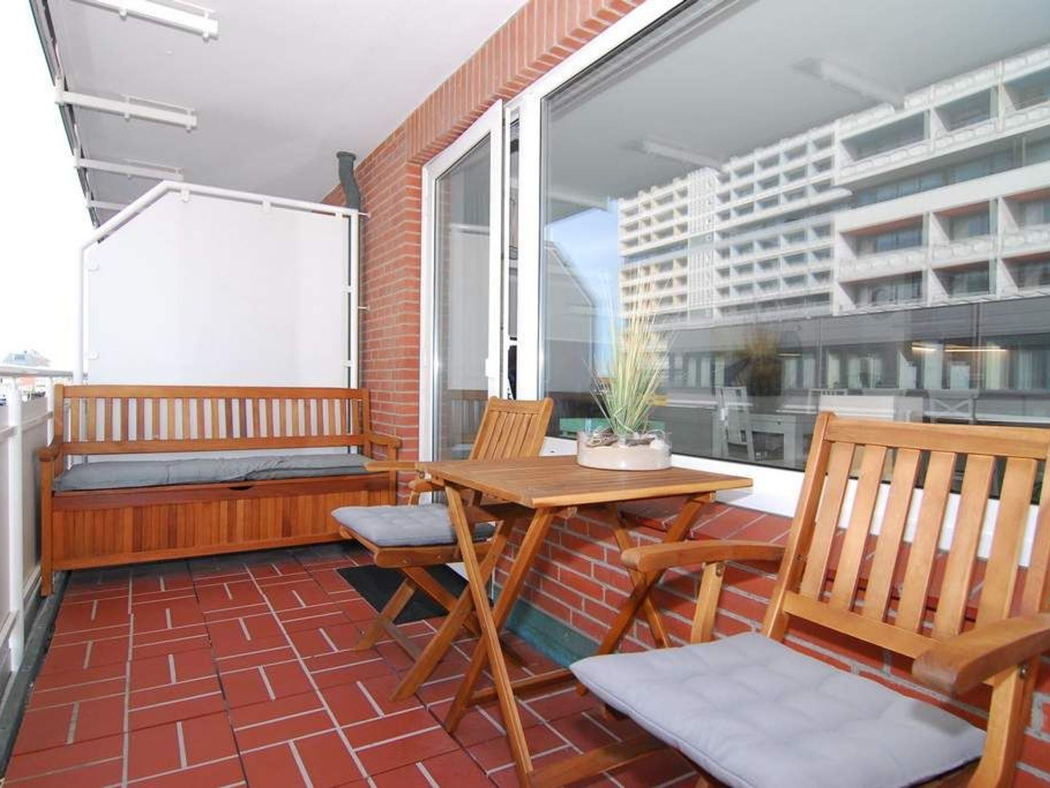Moderne 1-Zimmer-Ferienwohnung in zentraler und strandnaher Lage. Nur ein Katzensprung vom Wasser entfernt, bietet Ihnen dieses Domizil den perfekten Ausgangspunkt für Ihren Urlaub. Der Wohn-/Schlafraum ist mit Doppelschrankbett (160x200 cm), 2-Sitzer-Couch, einem Essplatz und zusätzlichem Sitzplatz am Tresen der offenen Küche ausgestattet. Für die Unterhaltung sorgt ein großer, drehbarer Flachbild-TV. WLAN (ohne Gewähr). Auf dem möblierten Westbalkon genießen Sie die Sonnenstunden. Die offene Küche verfügt über einen Geschirrspüler und eine Mikrowelle. Ein modernes Duschbad/WC rundet die Ausstattung ab. Ein Fahrstuhl ist im Haus vorhanden - vorab sind ca. 10 Stufen zu gehen. Bettwäsche und Handtücher sind zur Anreise aufgezogen. Ein PKW-Stellplatz kann kostenpflichtig zugebucht werden.