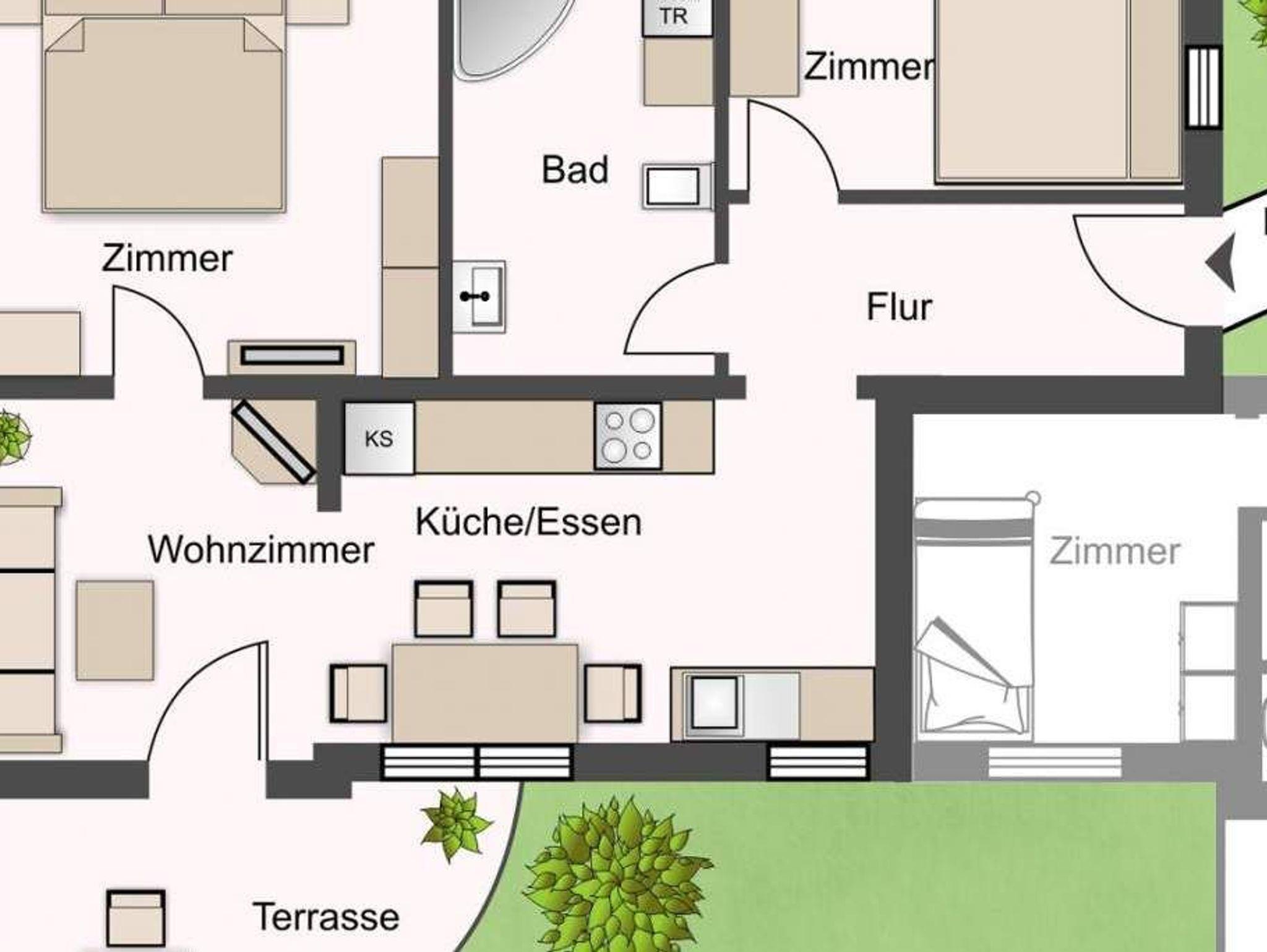 3-Zimmer-Nichtraucher-Hausteil (ca. 53 qm) im Bungalowstil mit möblierter, windgeschützter Terrasse.