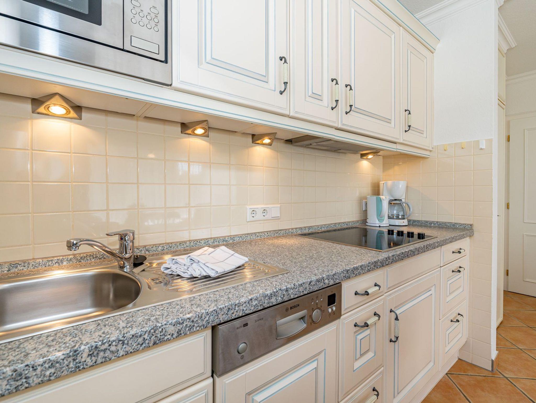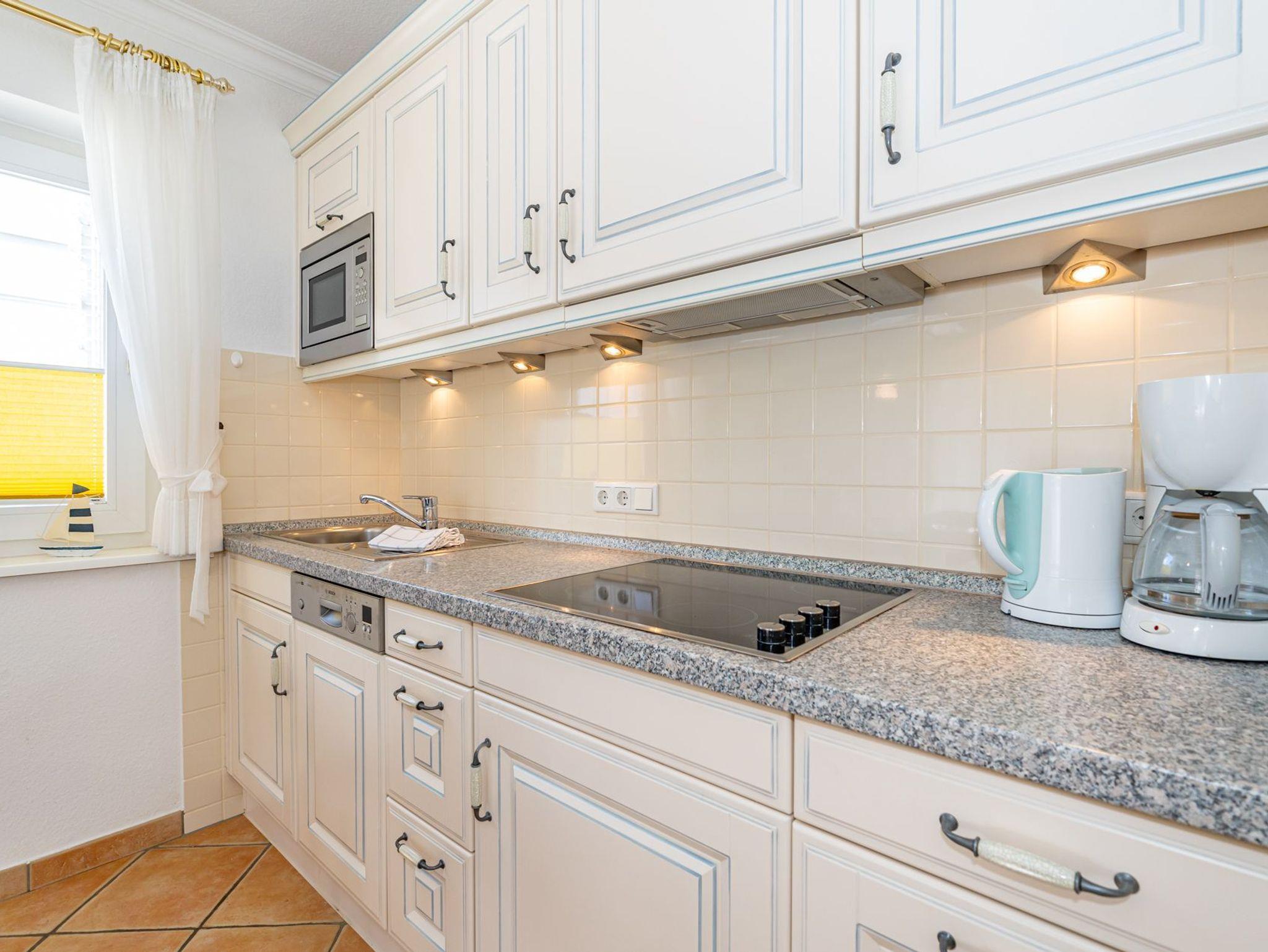 Die Küchenzeile hat einen Geschirrspüler, eine Mikrowelle, ein Ceranfeld und einen Kühlschrank mit 3*-Gefrierfach. Kaffeemaschine, Wasserkocher und Toaster gehören zur Grundausstattung.