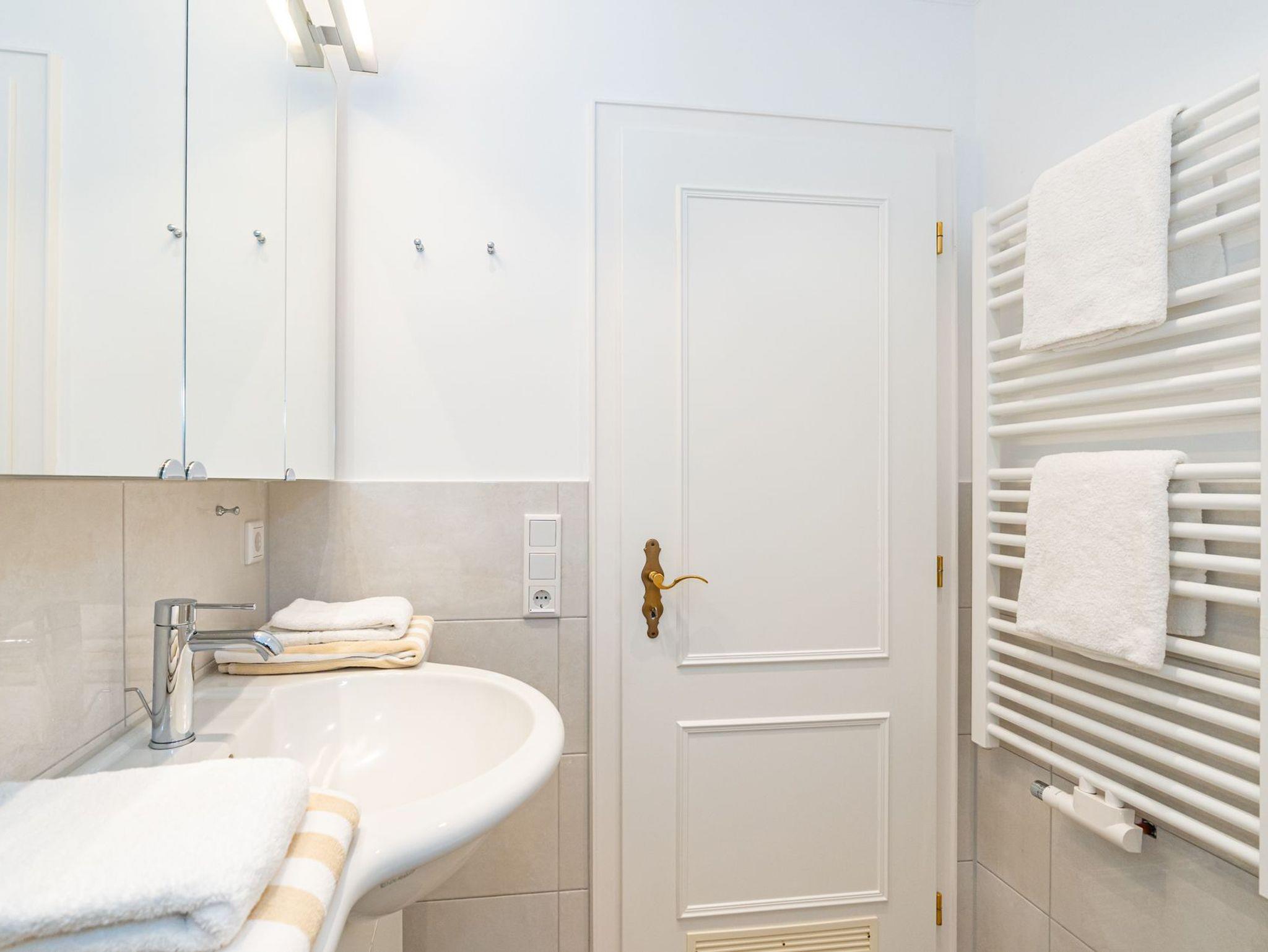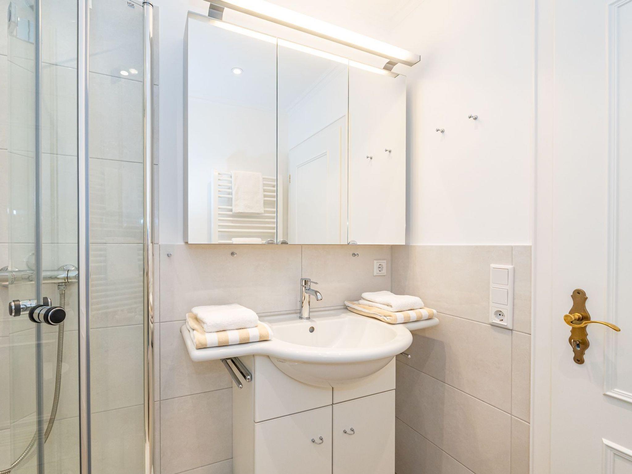 Das Badezimmer ist mit einer Dusche, einem Waschtisch und einem WC ausgestattet.