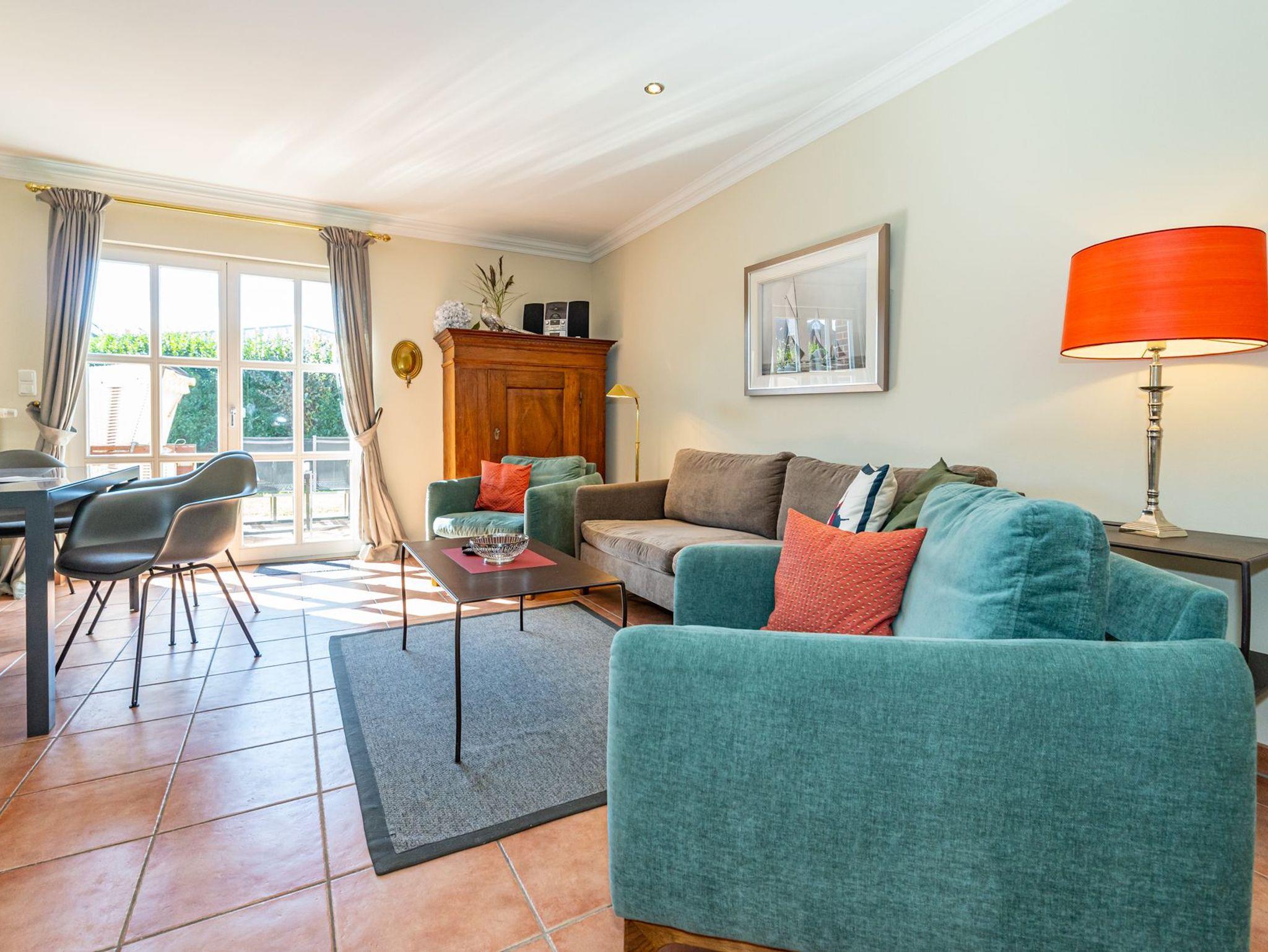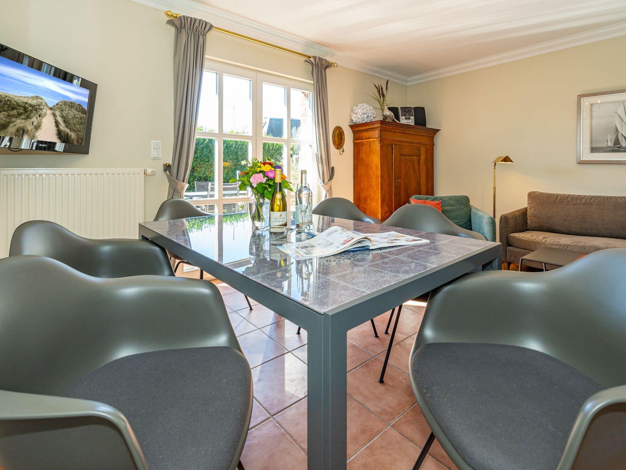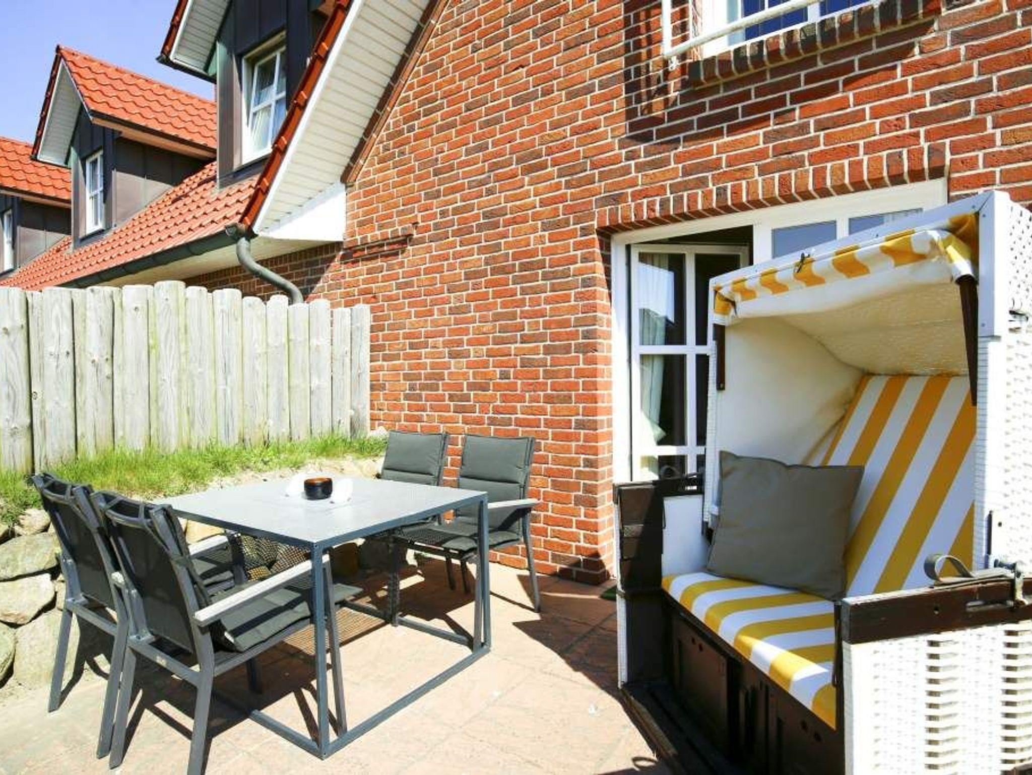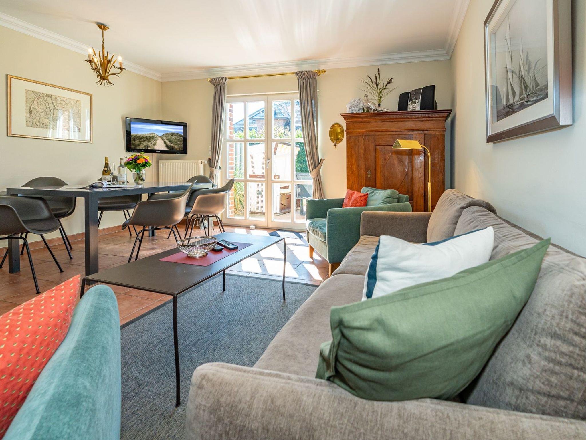 Vom Wohnzimmer betritt man die nach Süden ausgerichtete Sonnenterrasse mit Saison-Strandkorb (ca. April-Oktober) und Gartenmöbeln.